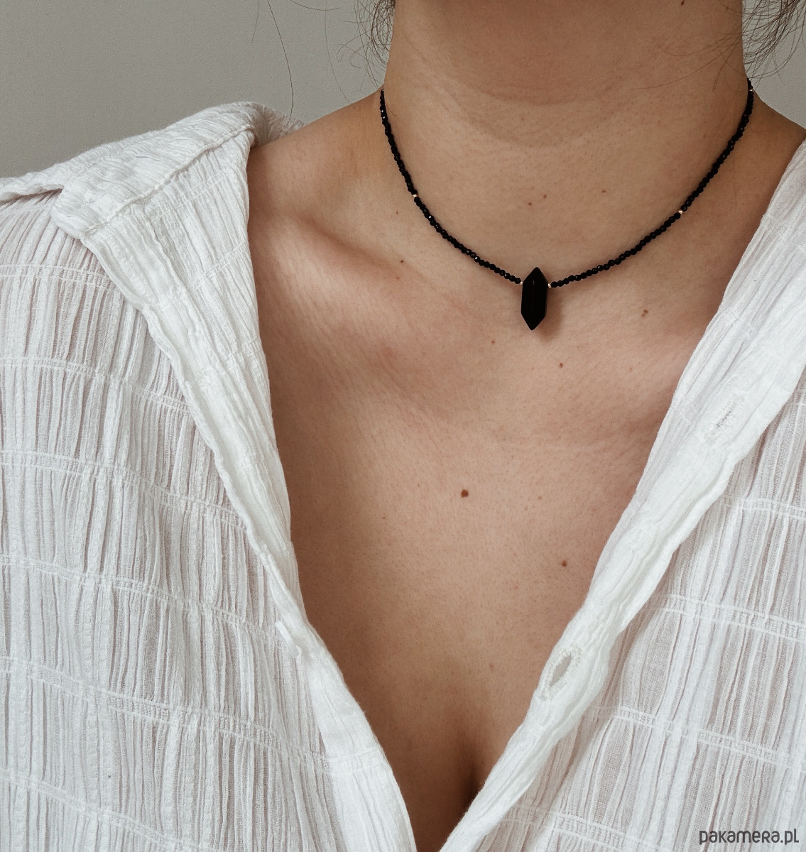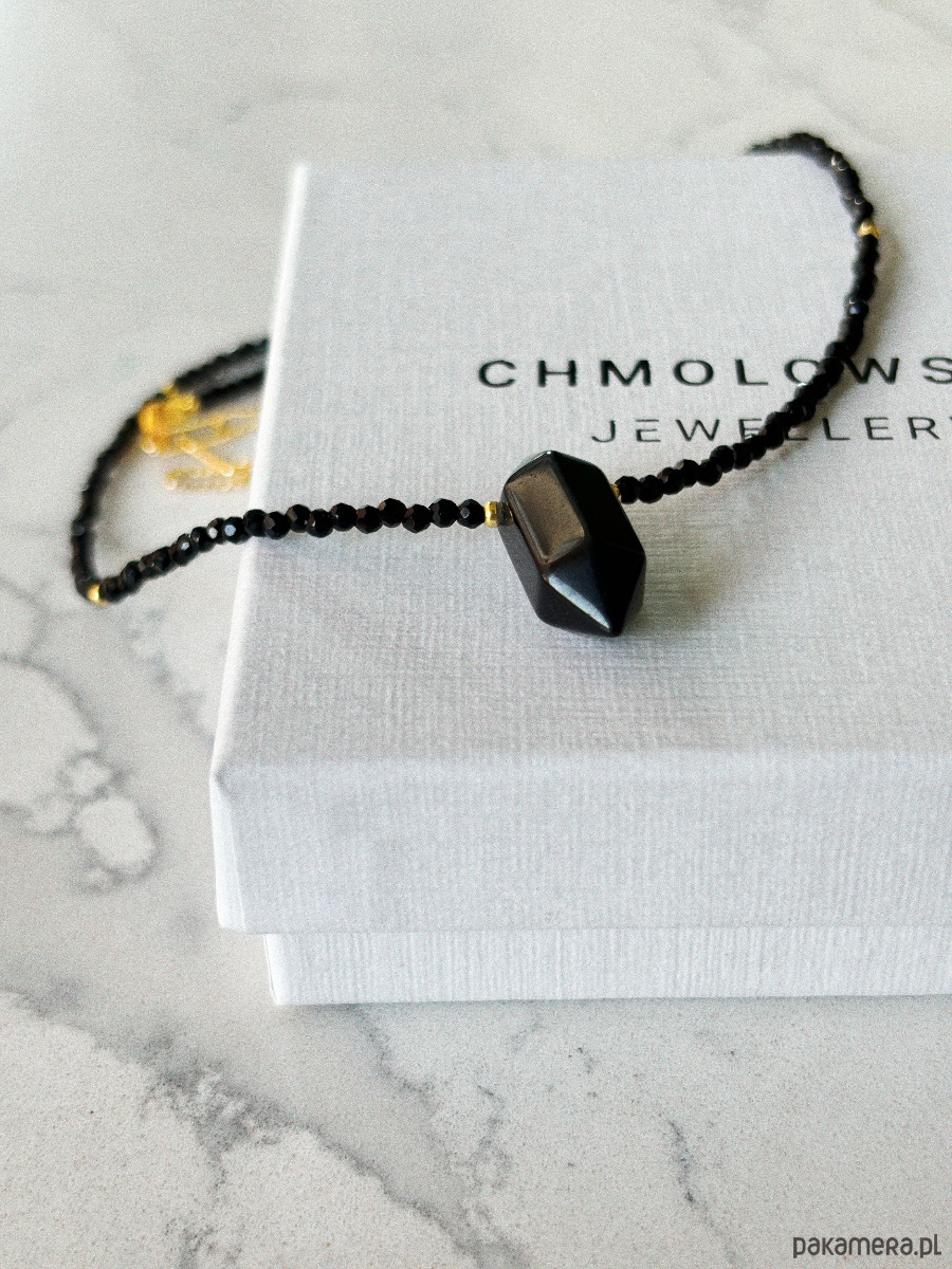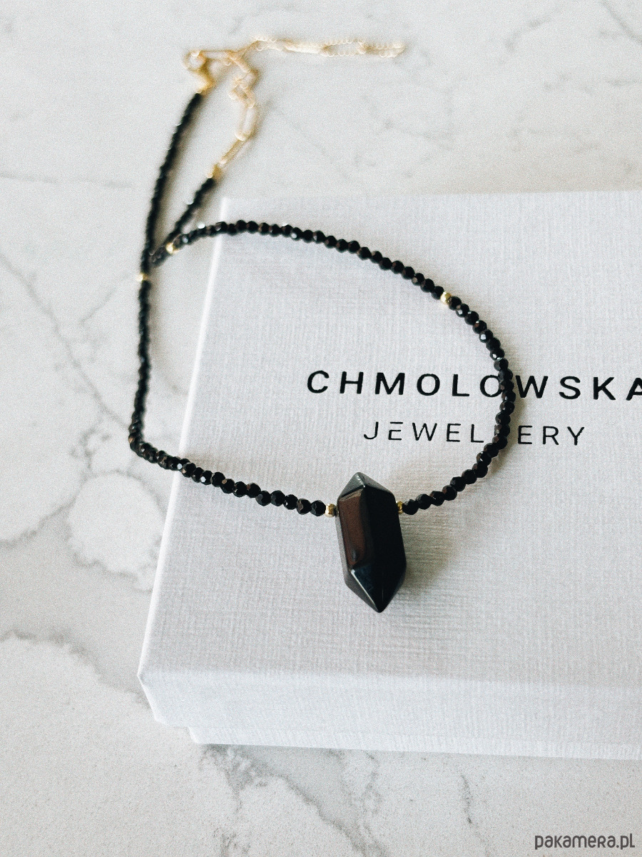 Naszyjnik wykonany jest na lince jubilerskiej z użyciem onyksu, zapięcia i łańcuszka rodowanego złotem oraz grot z onyksu.