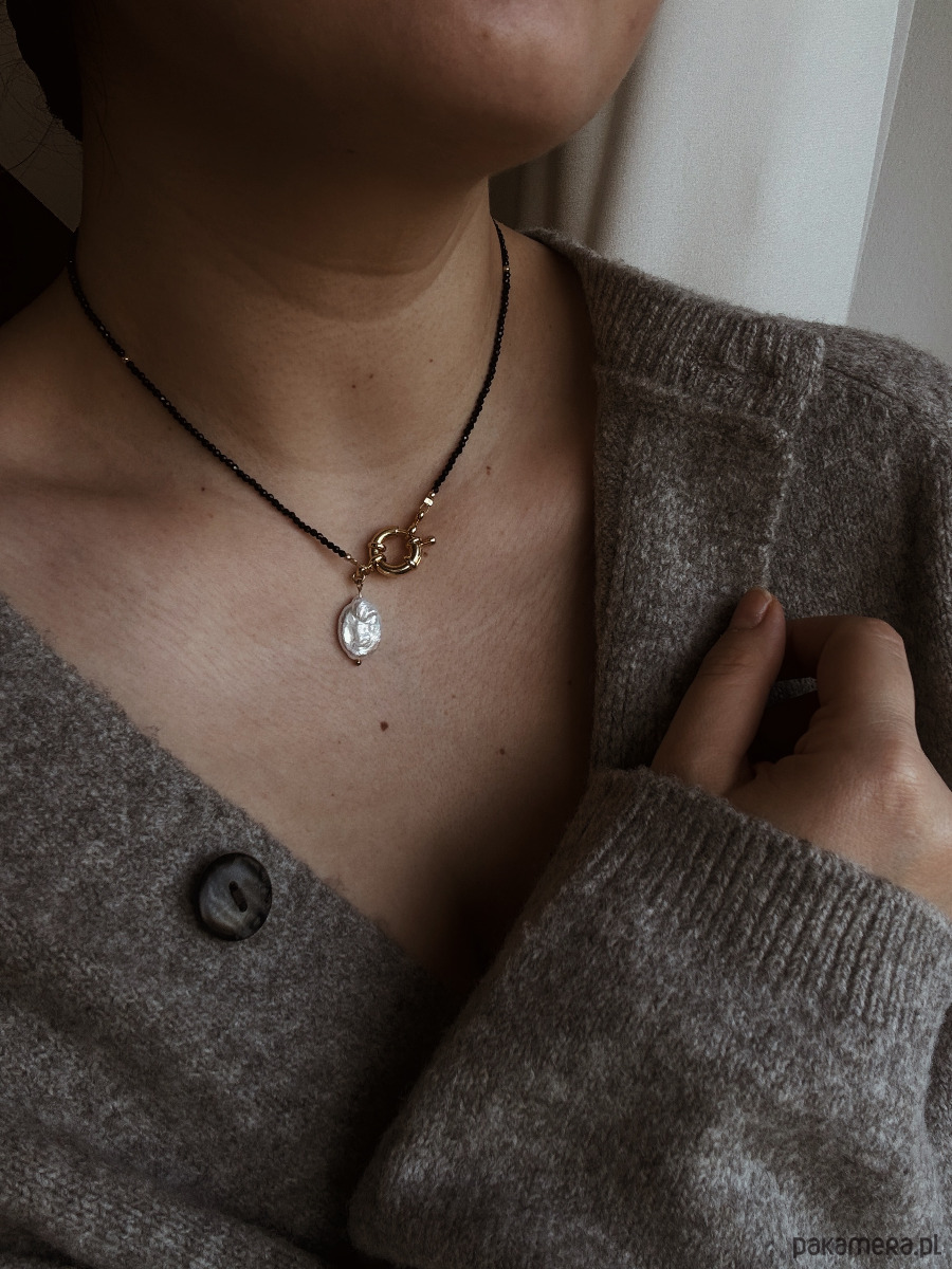 Naszyjnik wykonany jest na lince jubilerskiej z użyciem onyksu oraz zawieszki z perły unikatowej, zapięcie ozdobne wykonane z mosiądzu rodowanego złotem.