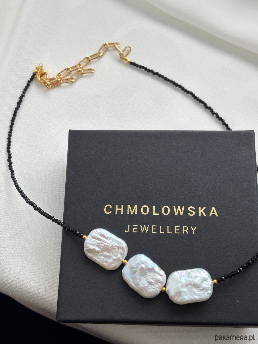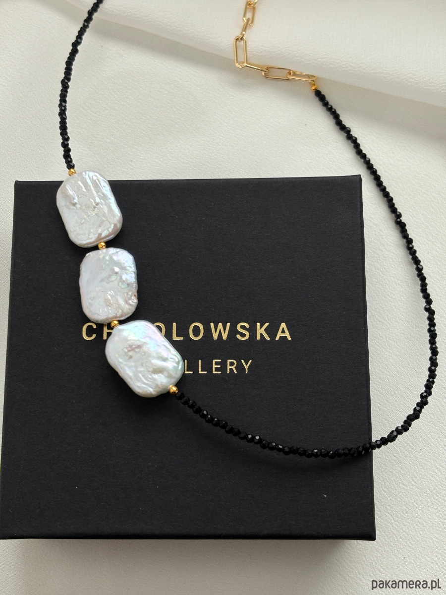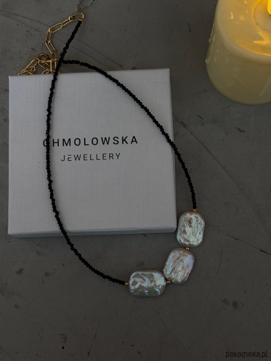 Naszyjnik wykonany jest na lince jubilerskiej z użyciem onyksu oraz pereł naturalnych, zapięcia i łańcuszka ze stali ch.