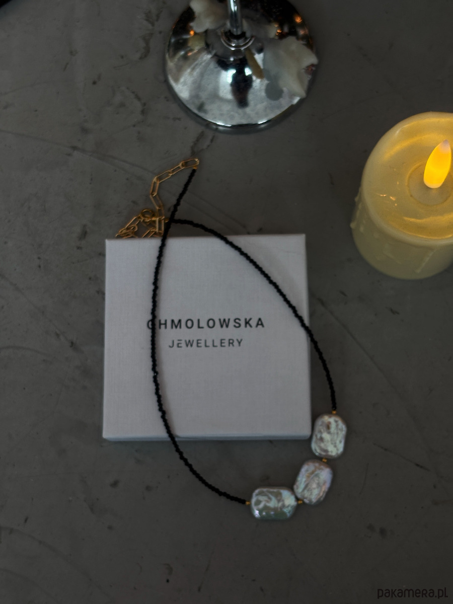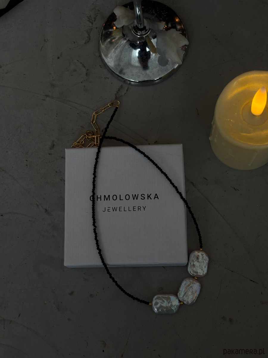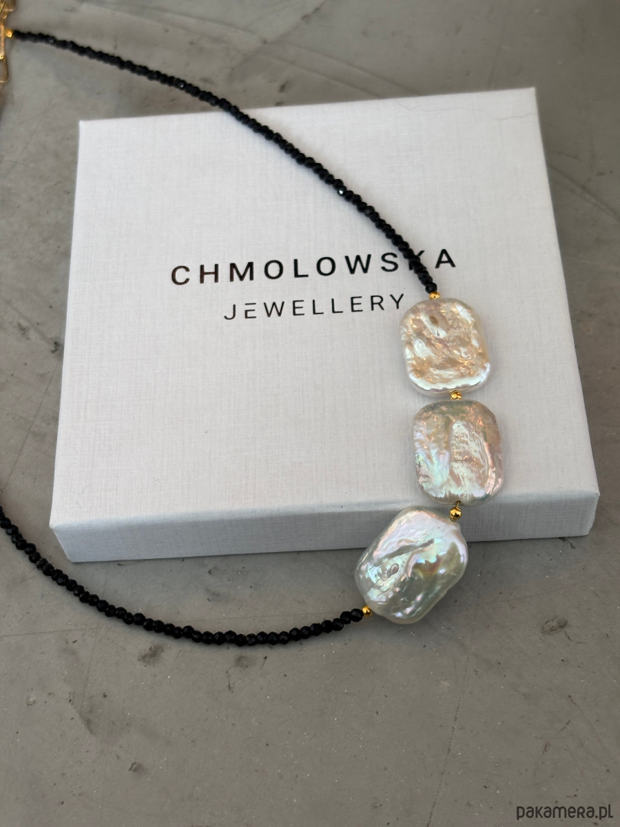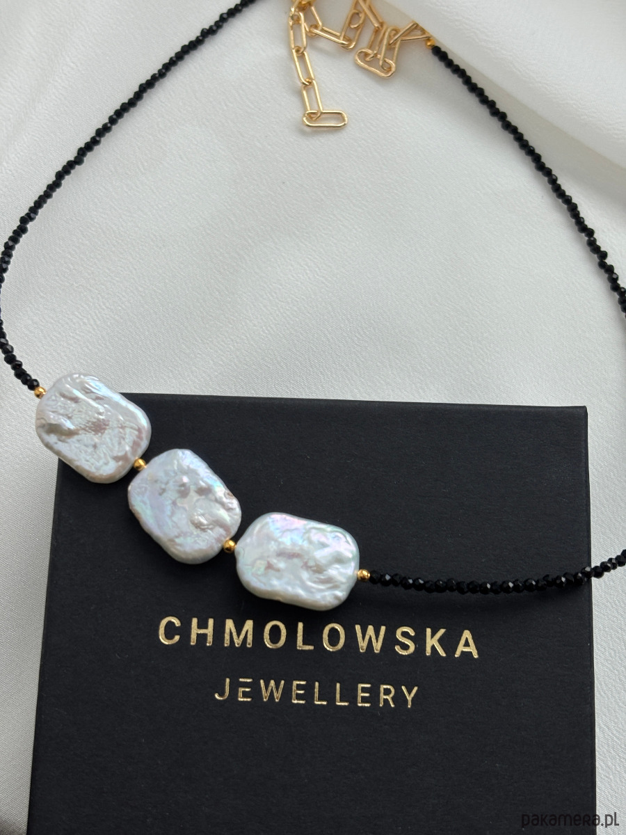 Naszyjnik wykonany jest na lince jubilerskiej z użyciem onyksu oraz pereł naturalnych, zapięcia i łańcuszka ze stali ch.