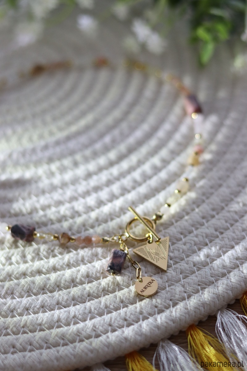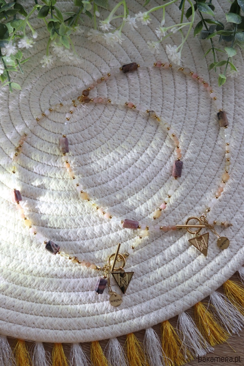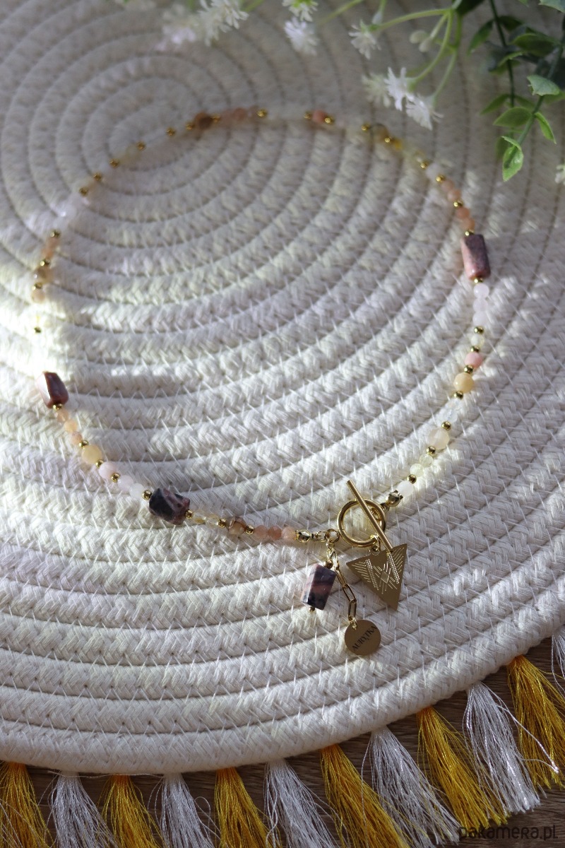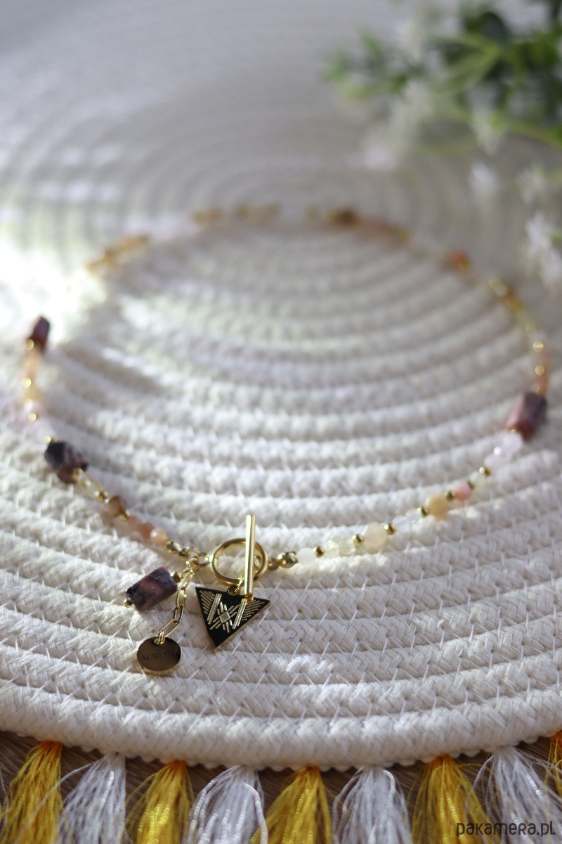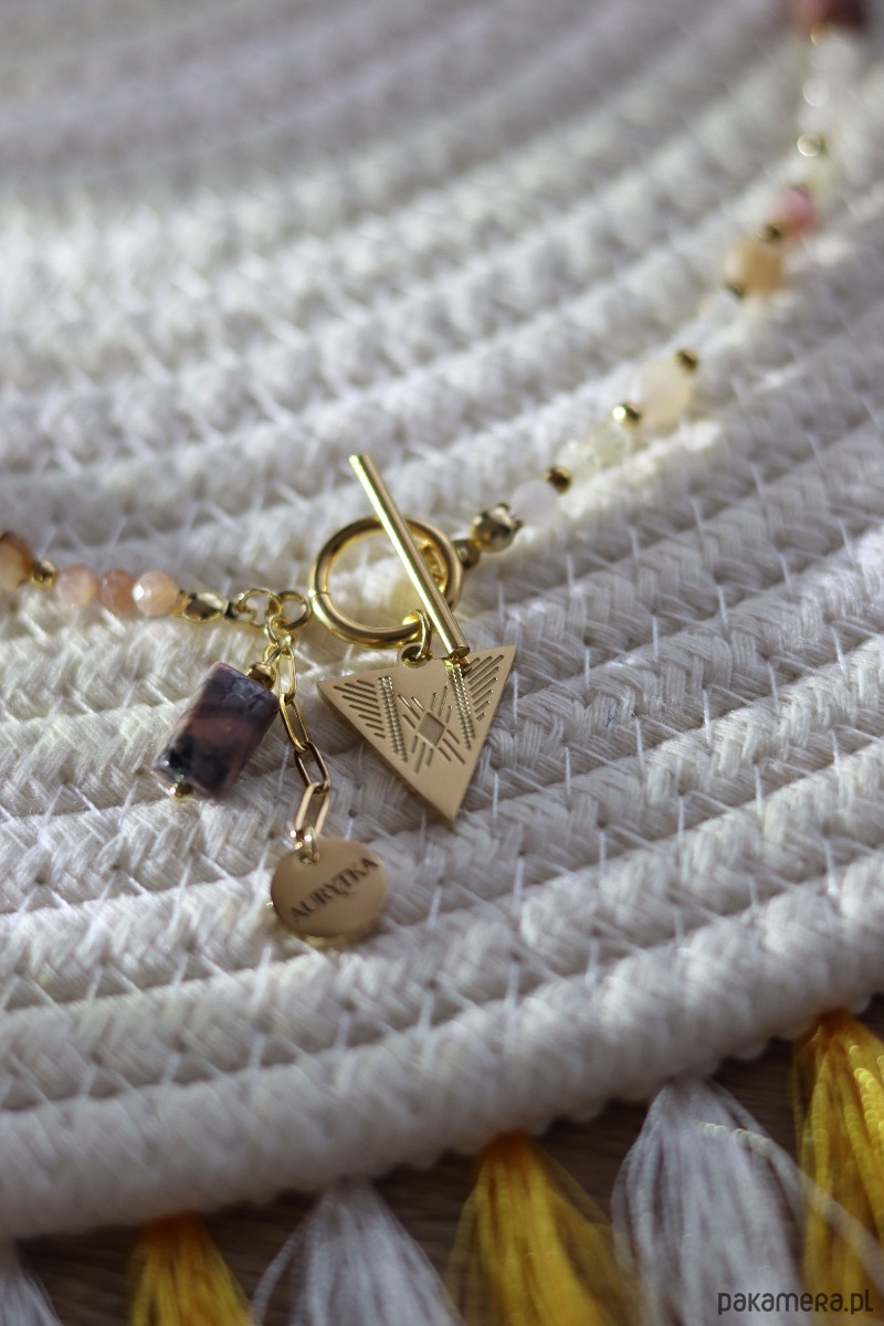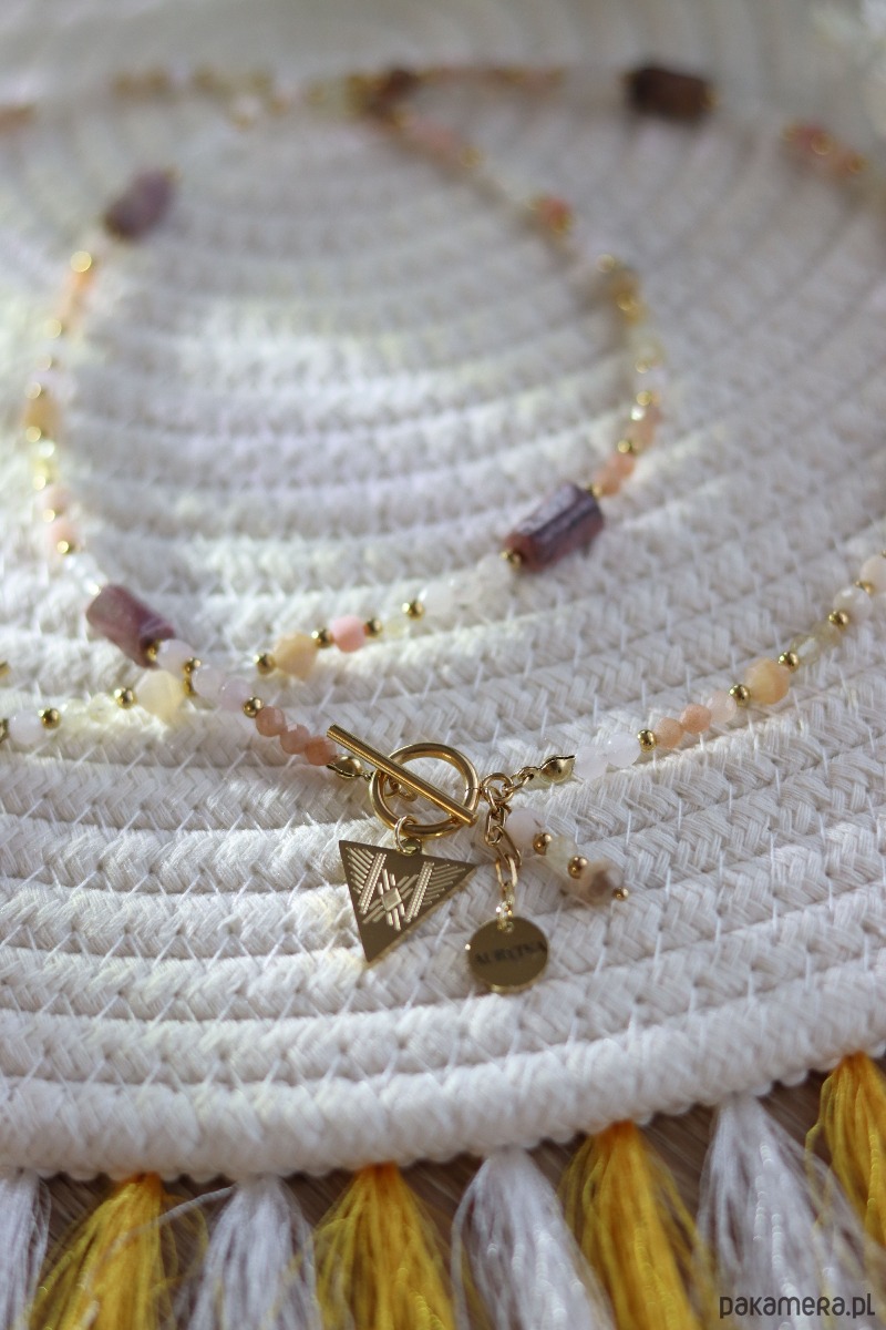 Kompozycję dopełnia dodatkowa zawieszka z logo marki oraz naturalnym kamieniem, co podkreśla unikalny charakter biżuterii. W naszyjniku wykorzystano starannie dobrane kamienie: