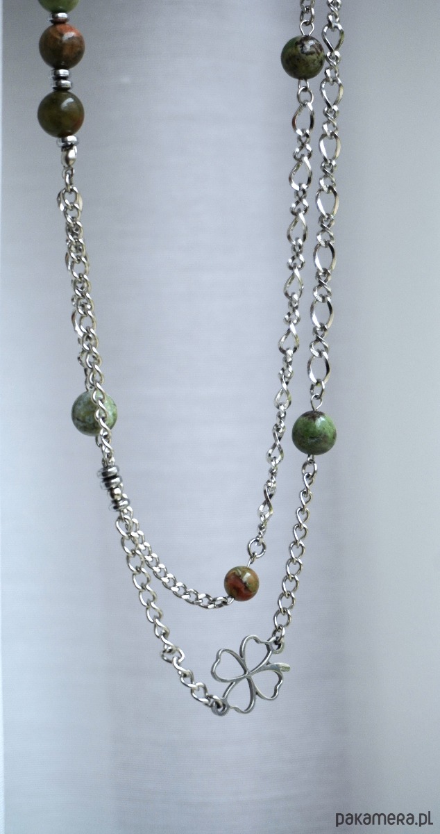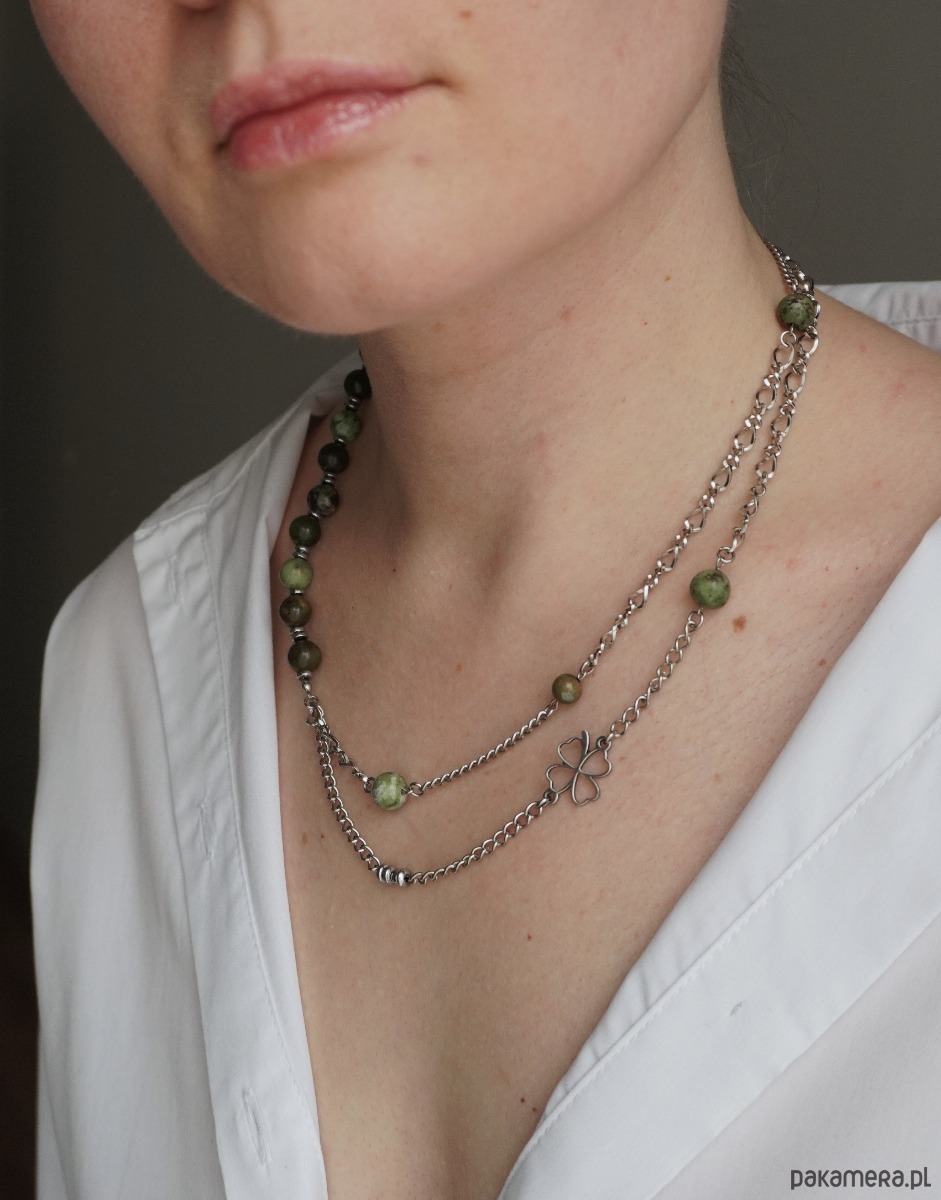 To eleganckie naszyjnik łączy w sobie naturalne piękno kamieni i nowoczesny styl. Z jednej strony składa się z gładkich koralików z opalu i jaspisu w odcieniach zieleni i brązu, które płynnie przechodzą jeden w drugi, tworząc harmonijny, naturalny efekt. Z drugiej strony naszyjnik wykonany jest z kilku delikatnych łańcuszków o różnej długości, co nadaje mu warstwowości i lekkości.