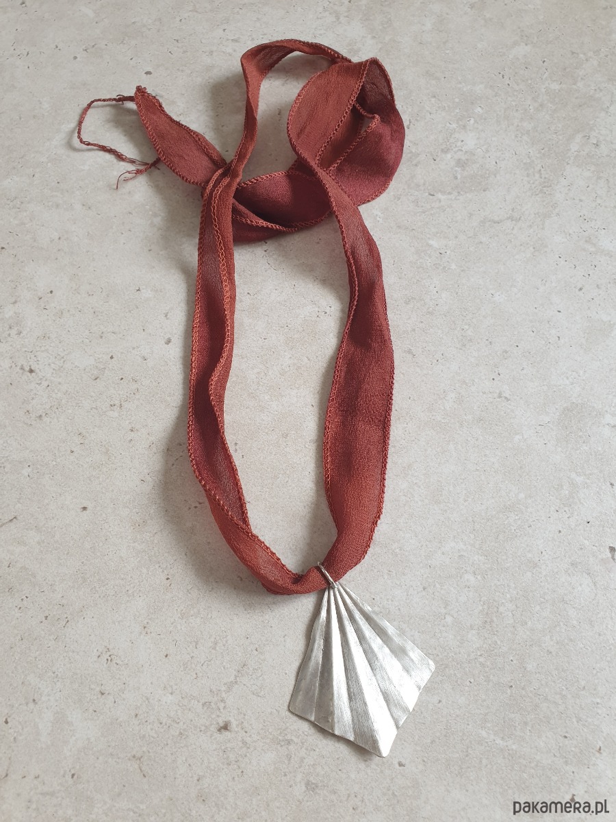 Minimalistyczny duży, elegancki naszyjnik, w surowym, rustykalnym stylu, wisior z kolekcji ORIGAMI w kształcie wachlarza, z surowego mosiądzu ręcznie wycinany, młotkowany, posrebrzany na stare srebro (lekko zaoksydowany) i delikatnie matowiony, każdy egzemplarz jest unikatowy. Wisior jest na jedwabnej ręcznie barwionej szerokiej wstążce do zawiązania. Naszyjnik tworzony na zamówienie.
