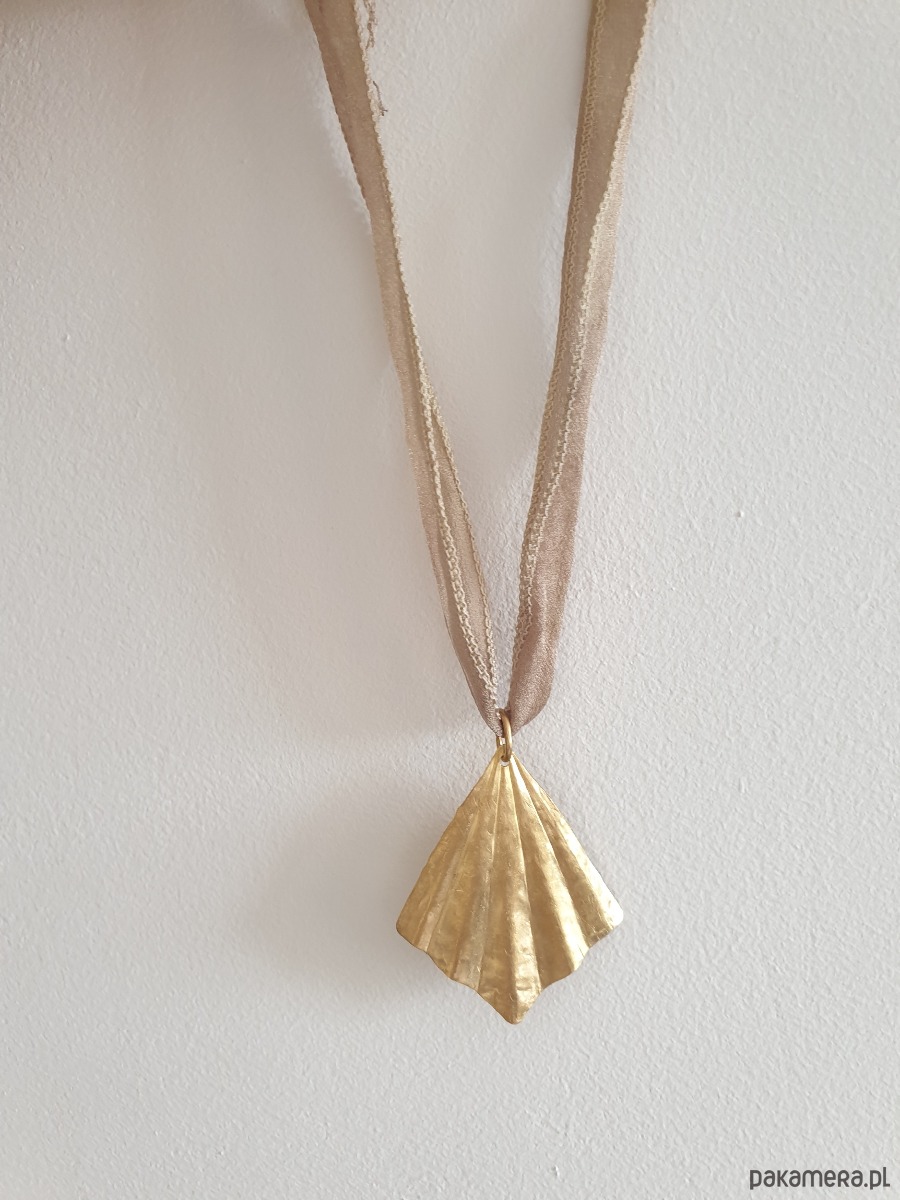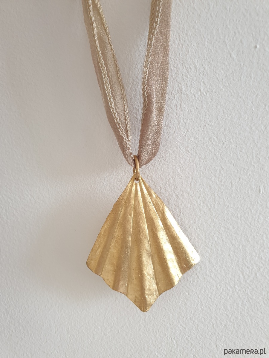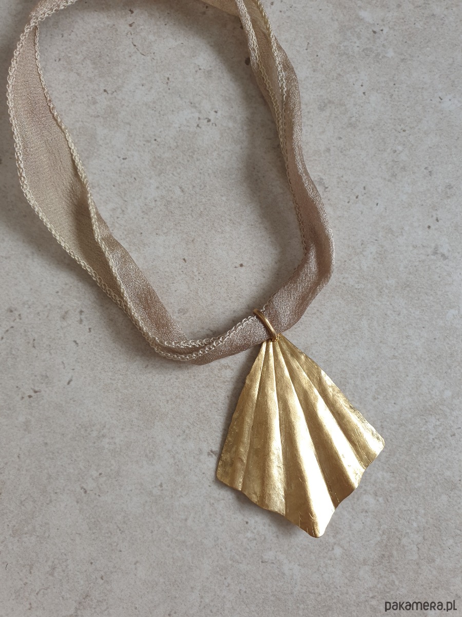 Naszyjnik ORIGAMI duży na jedwabnej wstążce, beżowy, surowy mosiądz