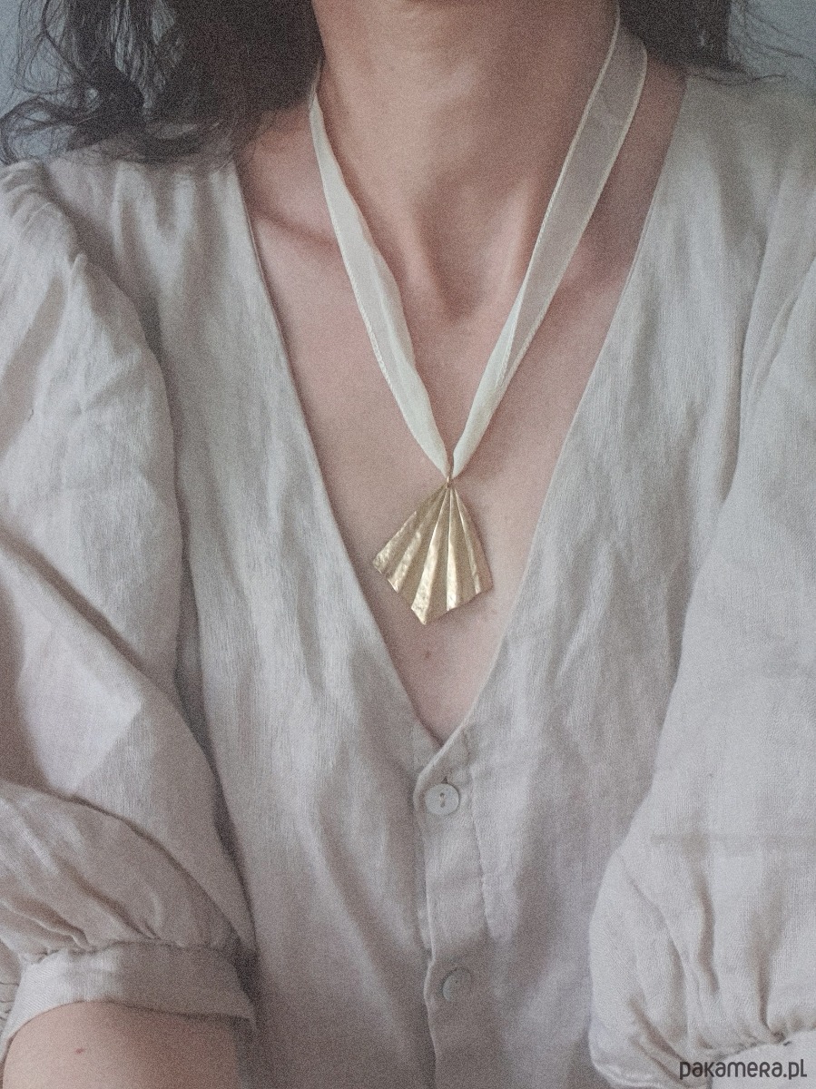 Minimalistyczny duży, elegancki naszyjnik, w surowym, rustykalnym stylu, wisior z kolekcji ORIGAMI w kształcie wachlarza, z surowego mosiądzu ręcznie wycinany, młotkowany i delikatnie matowiony. Wisior jest na jedwabnej ręcznie barwionej szerokiej wstążce. Wstążka jest do zawiązania na dowolnej długości. Naszyjnik tworzony na zamówienie, każdy jest unikatowy