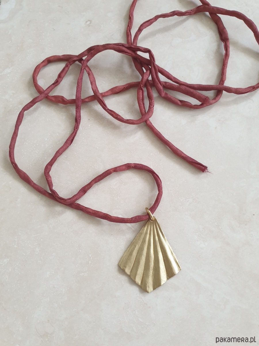 Minimalistyczny delikatny, elegancki naszyjnik, w surowym, rustykalnym stylu, wisior z kolekcji ORIGAMI w kształcie wachlarza, z surowego mosiądzu, ręcznie wycinany, młotkowany i delikatnie matowiony. Wisior jest na jedwabnej ręcznie barwionej i zszywanej wstążce. Wstążka jest do zawiązania na dowolnej długości. Naszyjnik tworzony na zamówienie, każdy jest unikatowy.