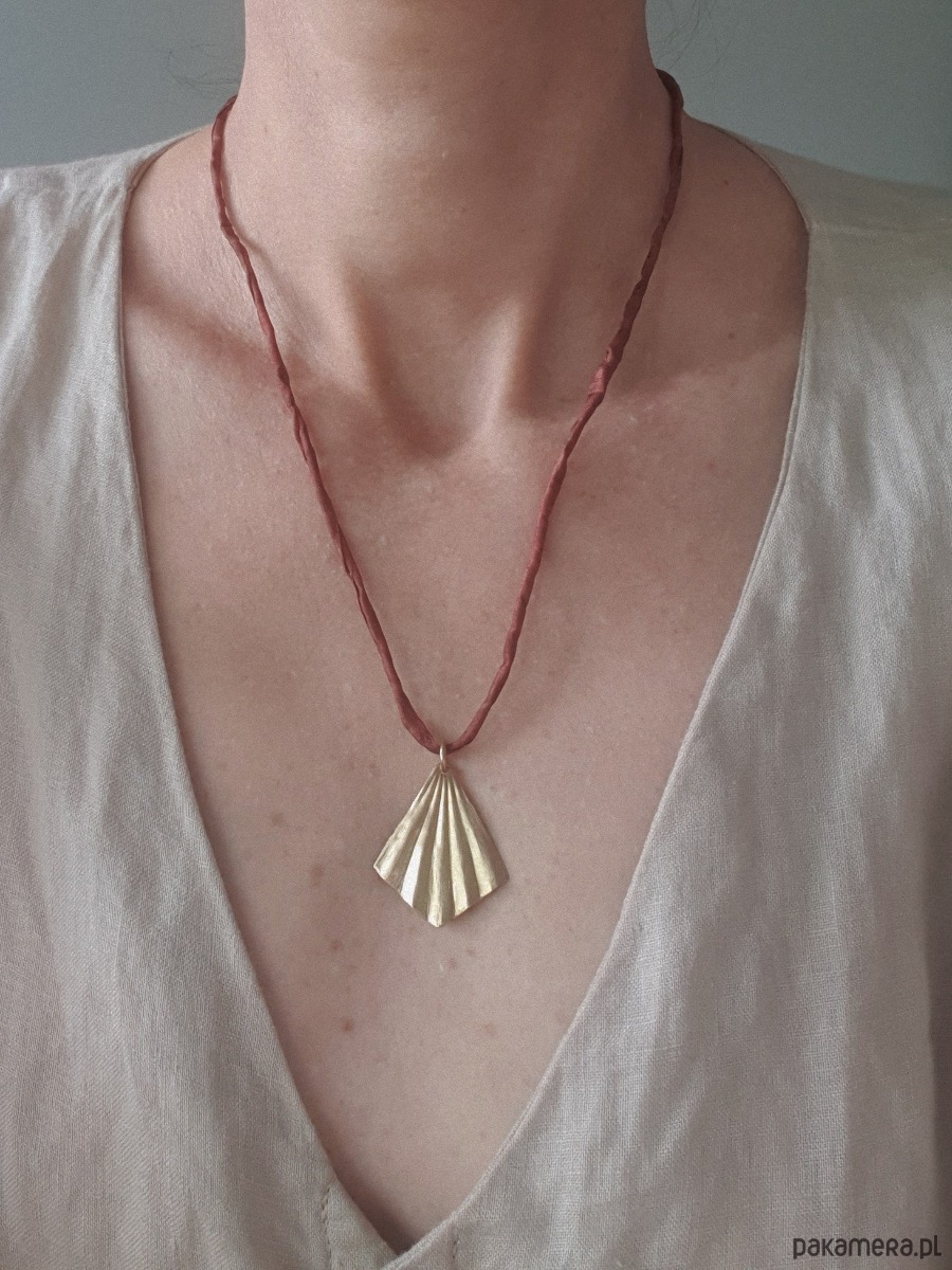 Minimalistyczny delikatny, elegancki naszyjnik, w surowym, rustykalnym stylu, wisior z kolekcji ORIGAMI w kształcie wachlarza, z surowego mosiądzu, ręcznie wycinany, młotkowany i delikatnie matowiony. Wisior jest na jedwabnej ręcznie barwionej i zszywanej wstążce. Wstążka jest do zawiązania na dowolnej długości. Naszyjnik tworzony na zamówienie, każdy jest unikatowy