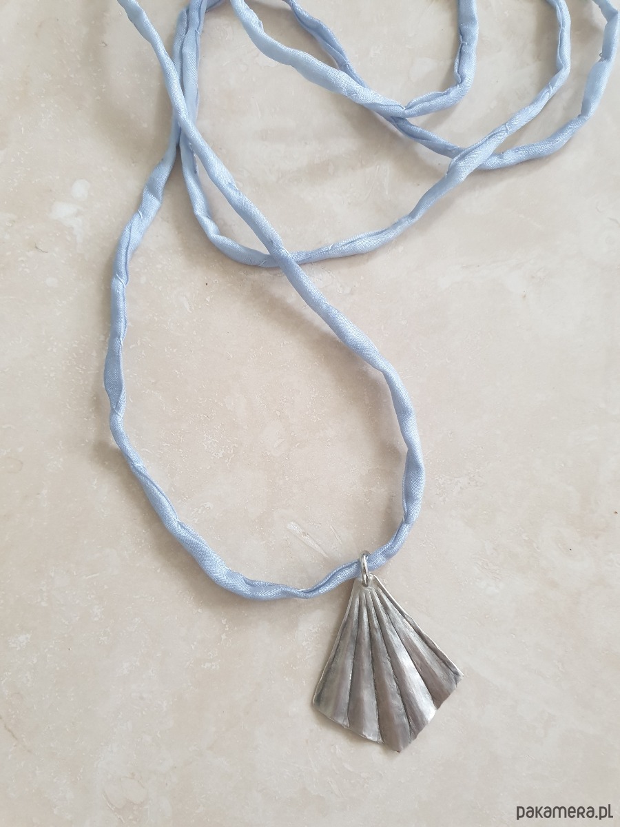 Minimalistyczny delikatny, elegancki naszyjnik, w surowym, rustykalnym stylu, wisior z kolekcji ORIGAMI w kształcie wachlarza, z surowego mosiądzu posrebrzanego na stare srebro, ręcznie wycinany, młotkowany i delikatnie matowiony. Wisior jest na jedwabnej ręcznie barwionej i zszywanej wstążce. Wstążka jest do zawiązania na dowolnej długości. Naszyjnik tworzony na zamówienie, każdy jest unikatowy