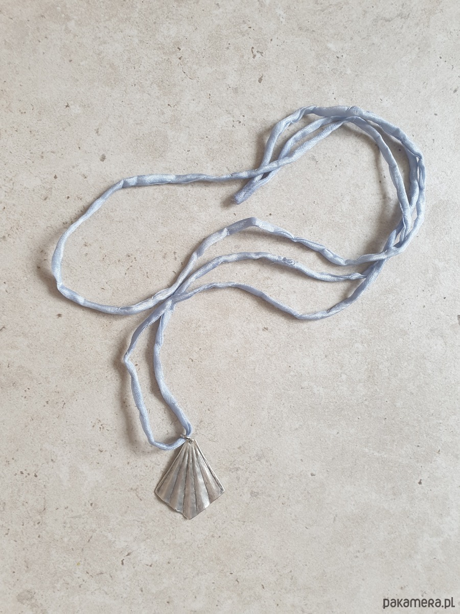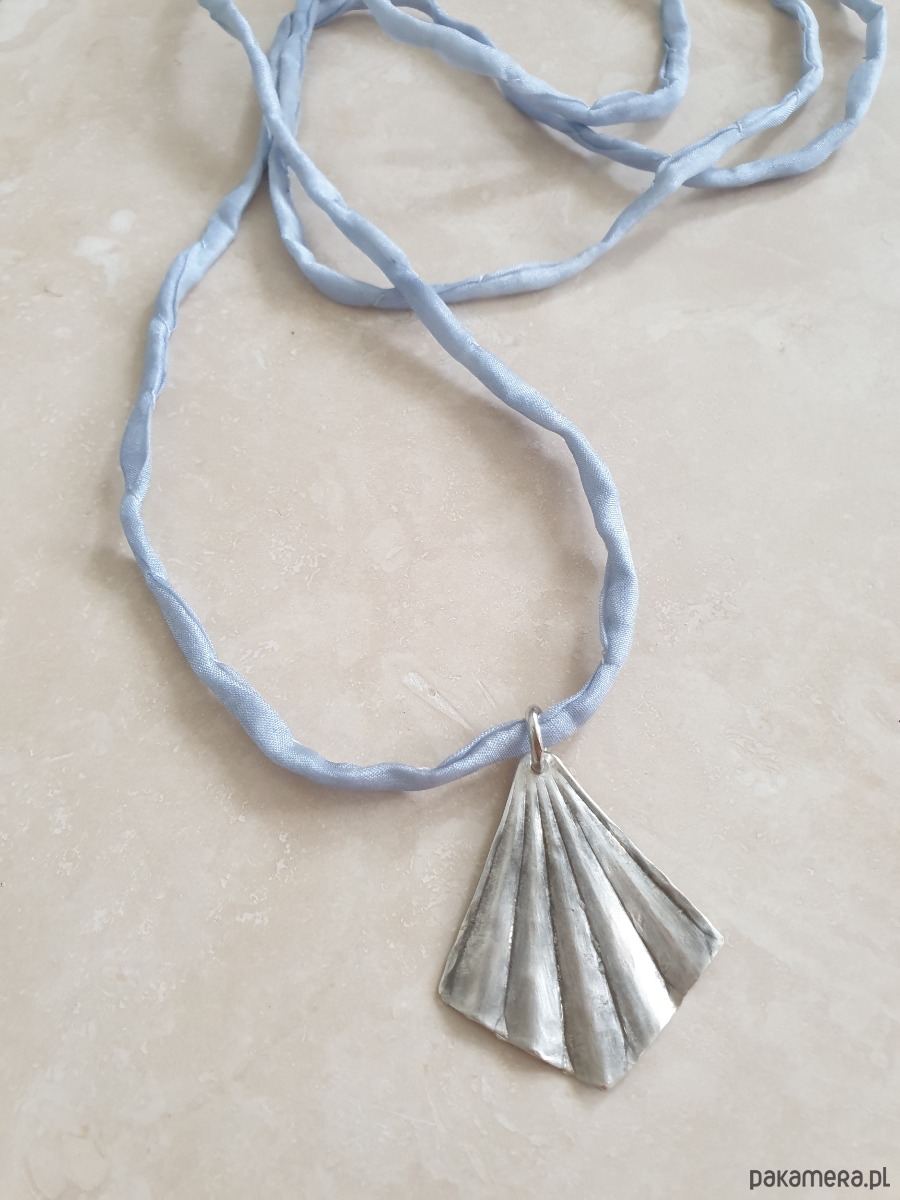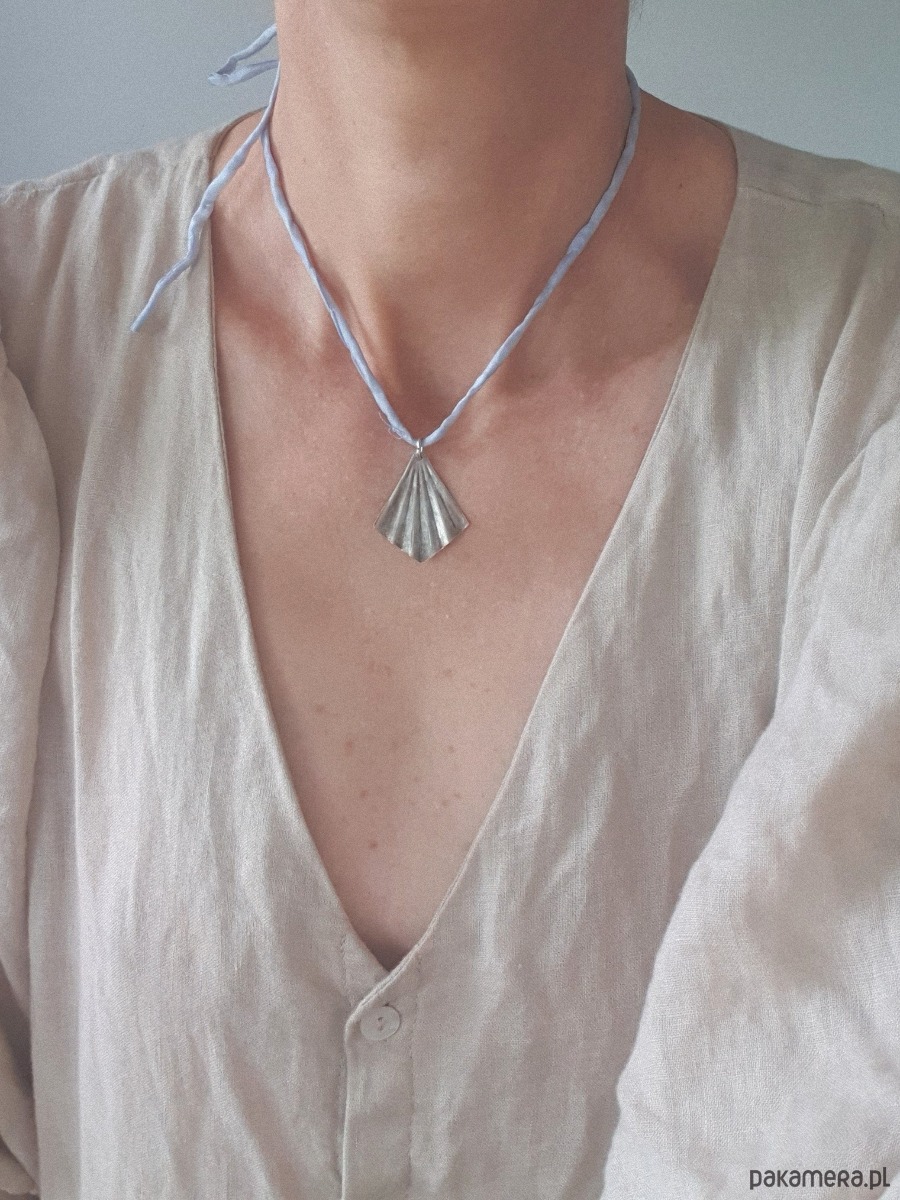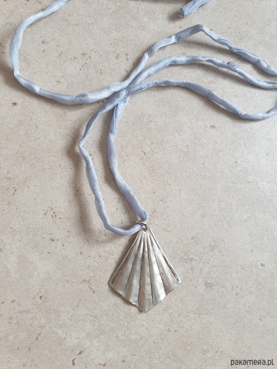 Minimalistyczny delikatny, elegancki naszyjnik, w surowym, rustykalnym stylu, wisior z kolekcji ORIGAMI w kształcie wachlarza, z surowego mosiądzu posrebrzanego na stare srebro, ręcznie wycinany, młotkowany i delikatnie matowiony. Wisior jest na jedwabnej ręcznie barwionej i zszywanej wstążce. Wstążka jest do zawiązania na dowolnej długości. Naszyjnik tworzony na zamówienie, każdy jest unikatowy