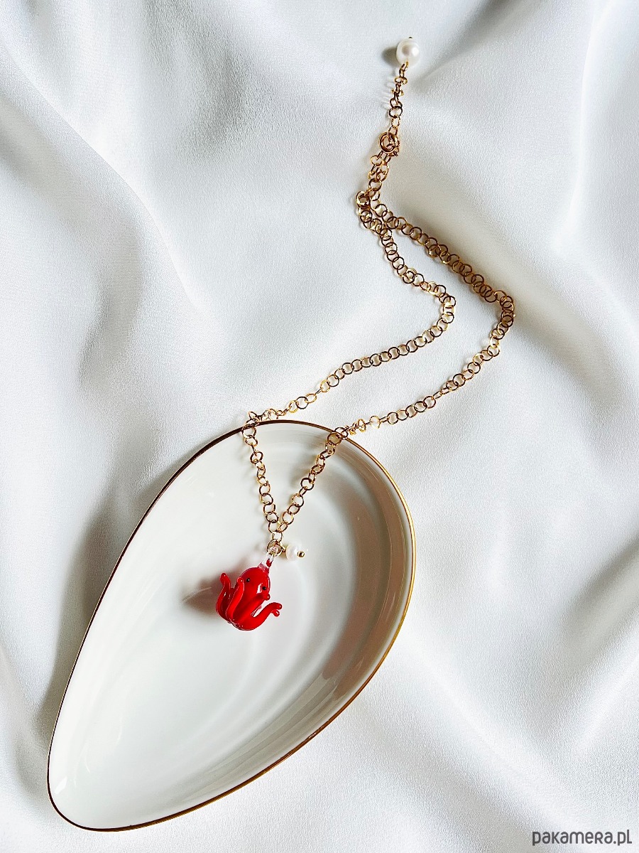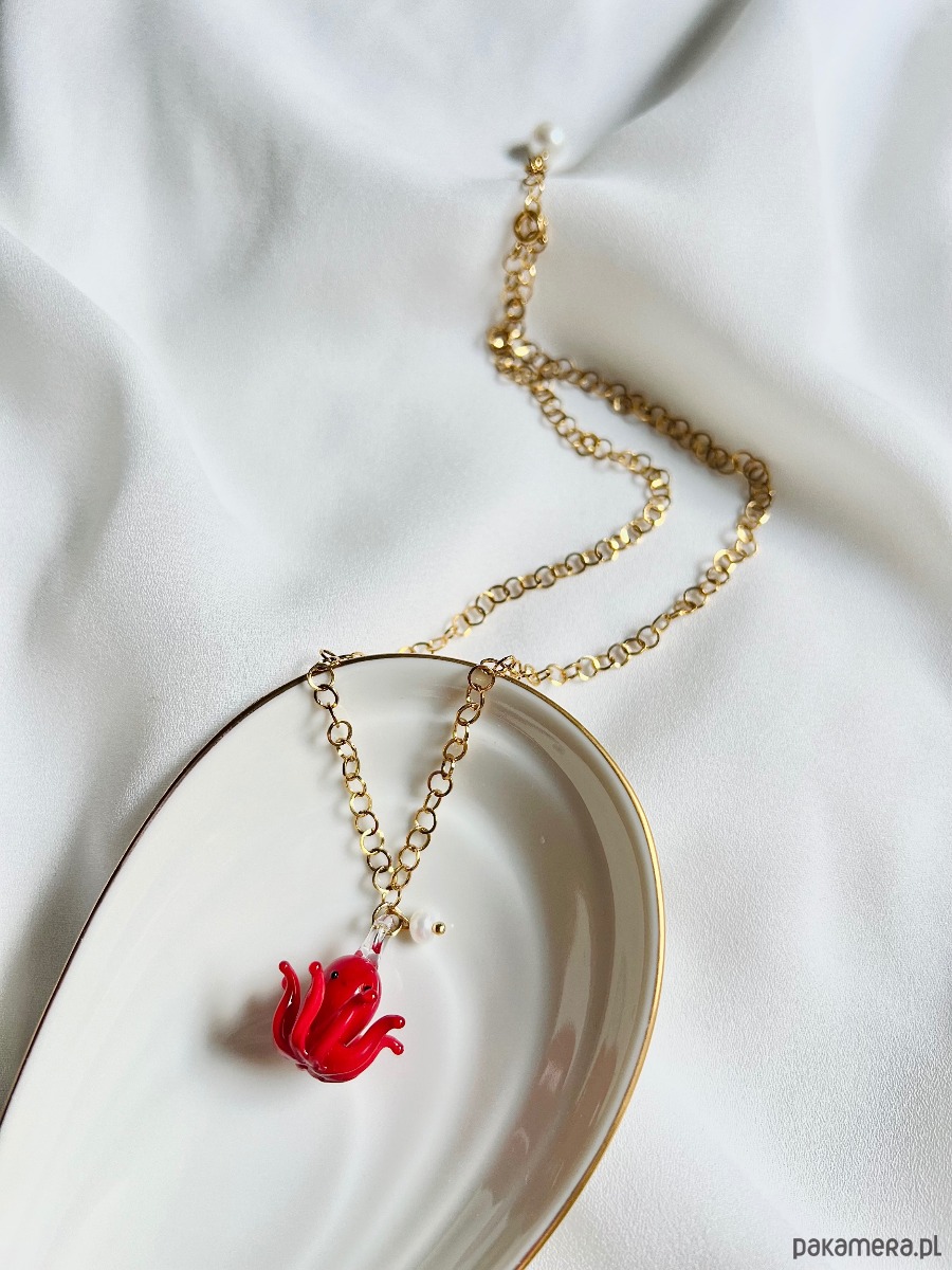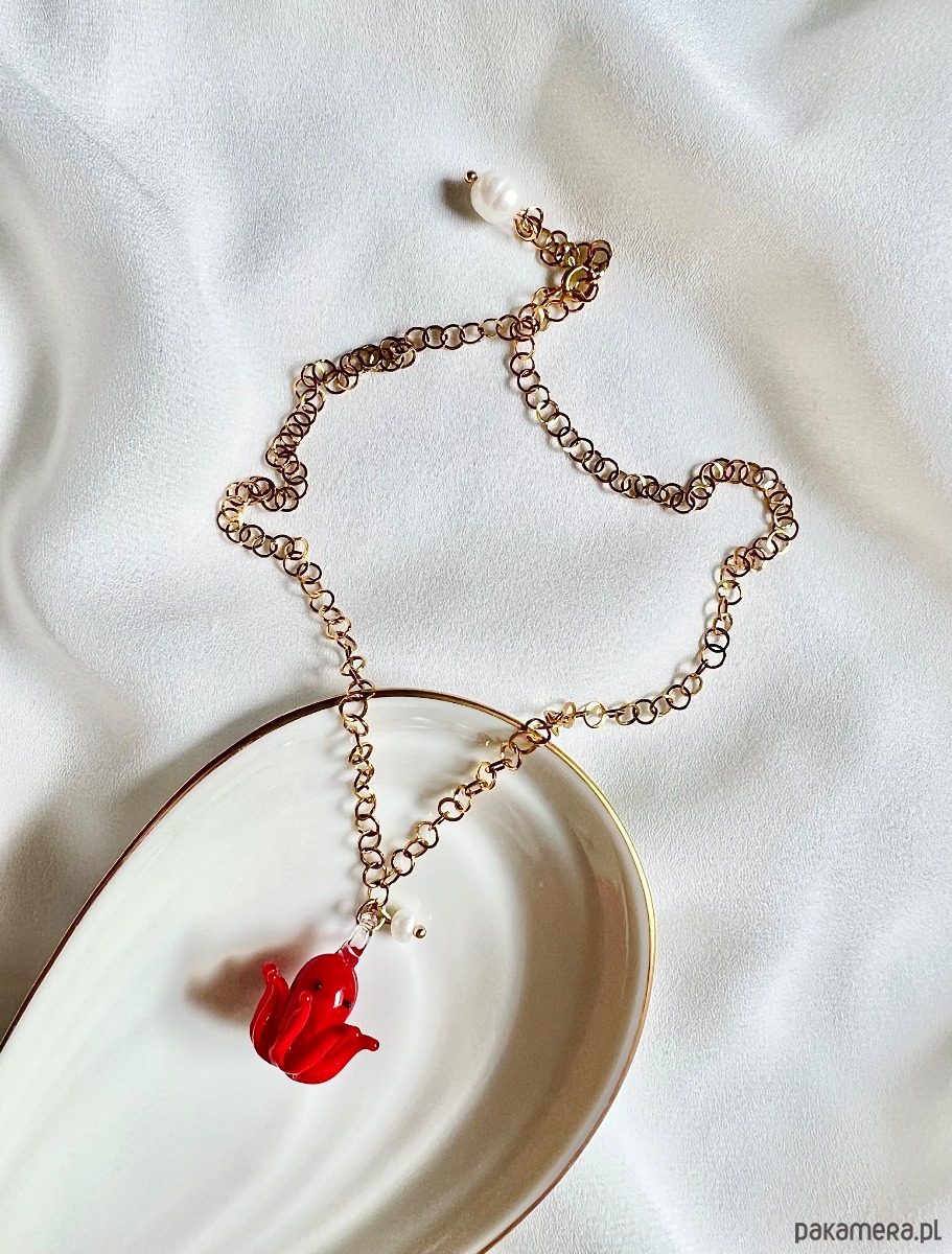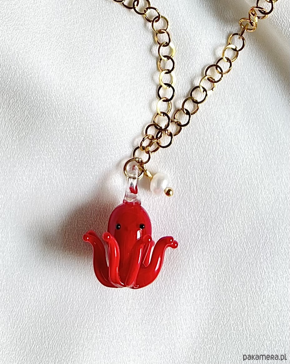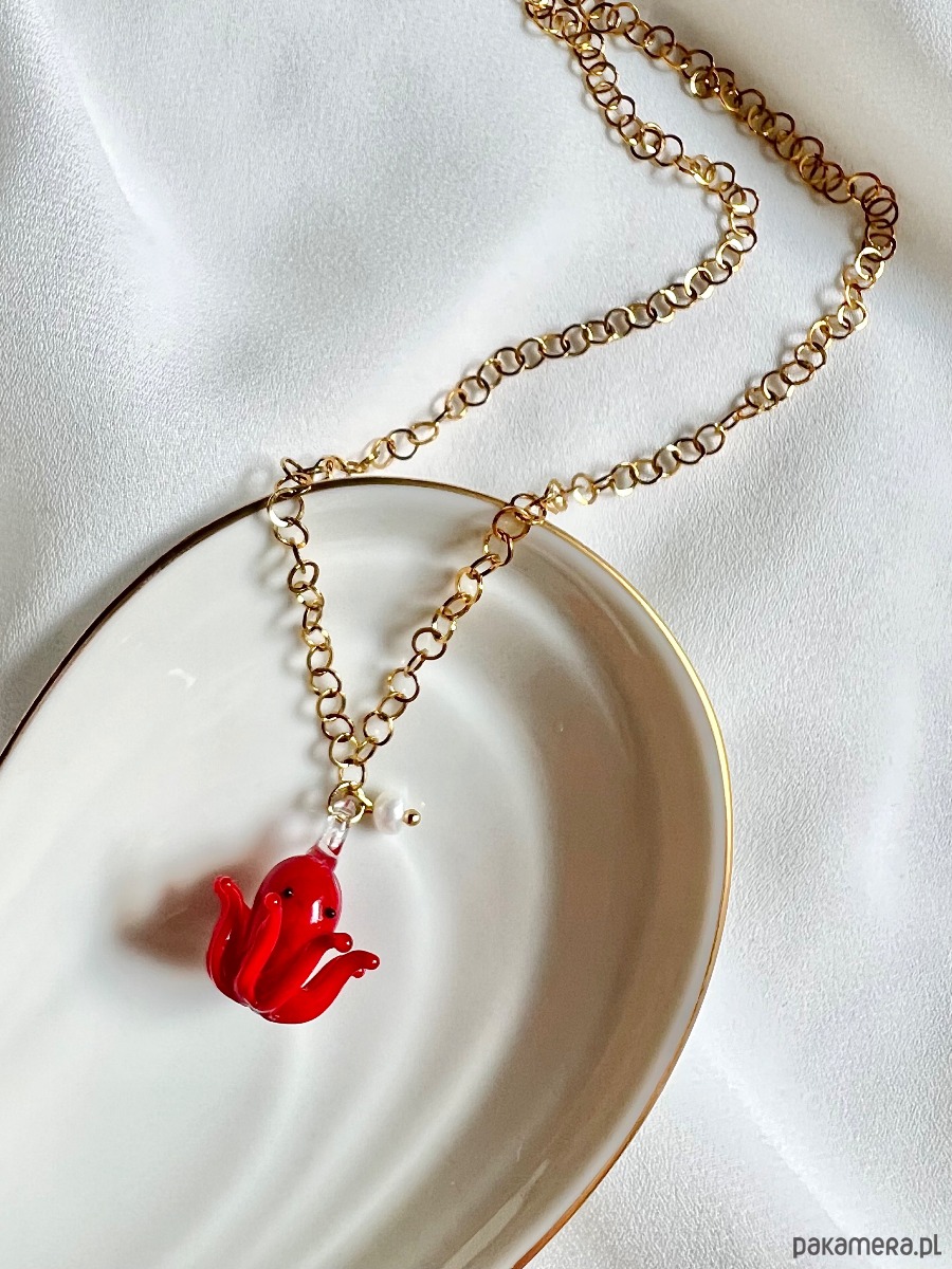Czerwona, ręcznie robiona szklana ośmiorniczka oraz perełka naturalna hodowlana powieszone są na łańcuszku o okrągłych oczkach ze stali chirurgicznej. Morski klimat, wakacyjny luz i kolorowy akcent, to coś to świetnie ożywi i dopełni wiele Twoich stylizacji. Łańcuszek zakończony jest perełką naturalną hodowlaną.
