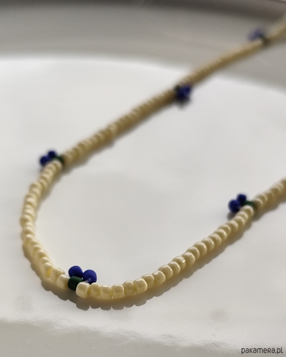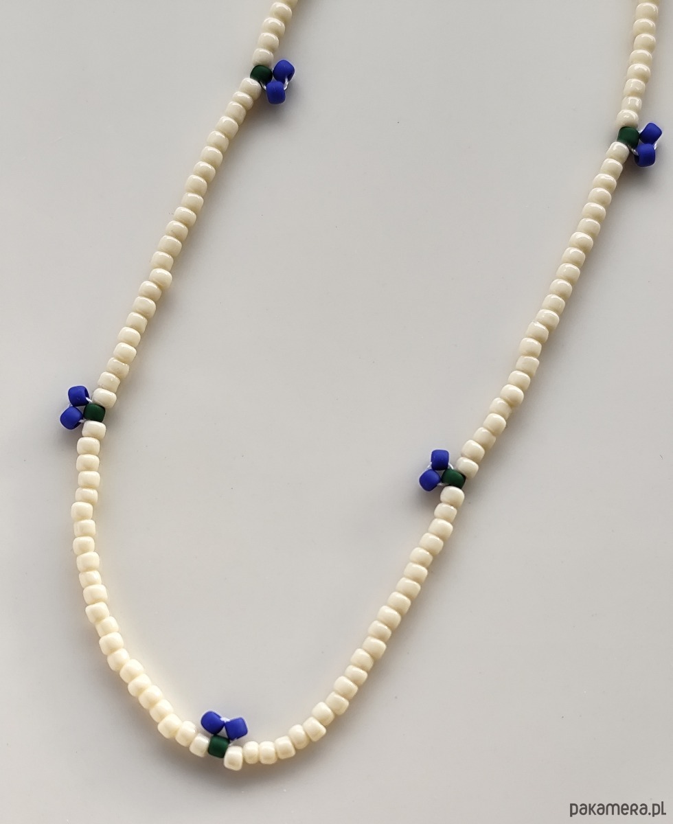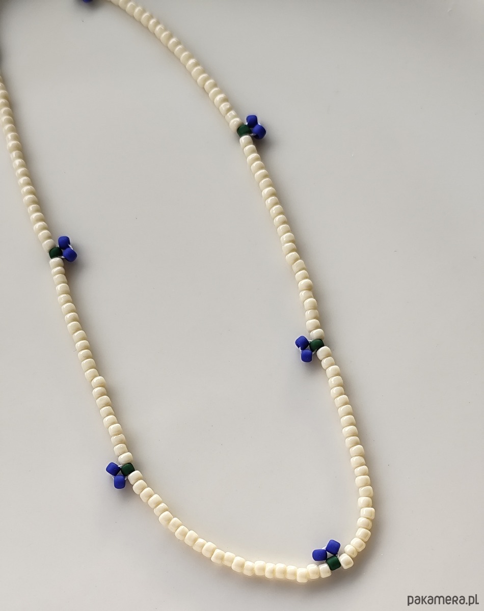 Przepiękny naszyjnik wykonany z najwyższej jakości drobnych koralików. Granatowe akcenty. Długość ok. 42 cm . Zapięcie stal chirurgiczna.