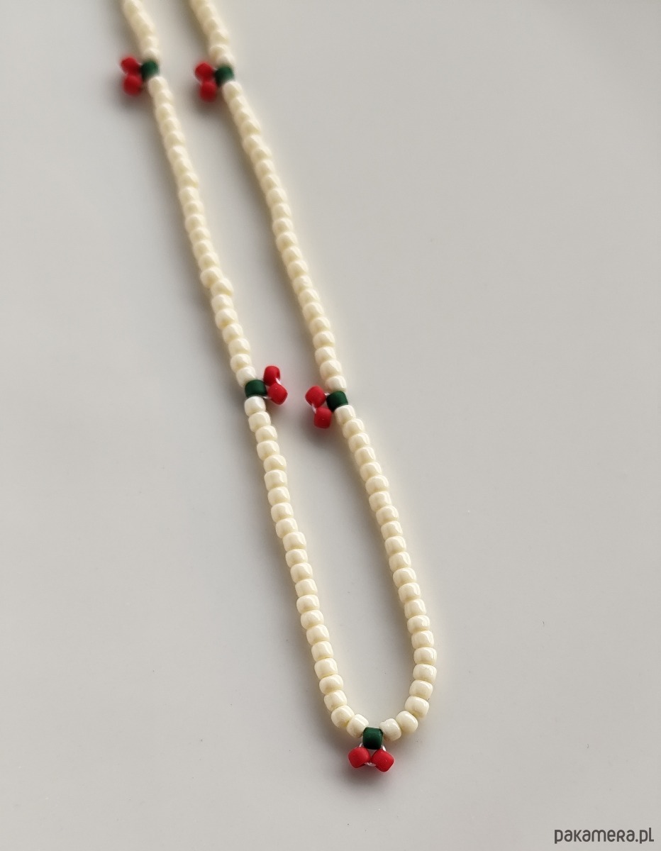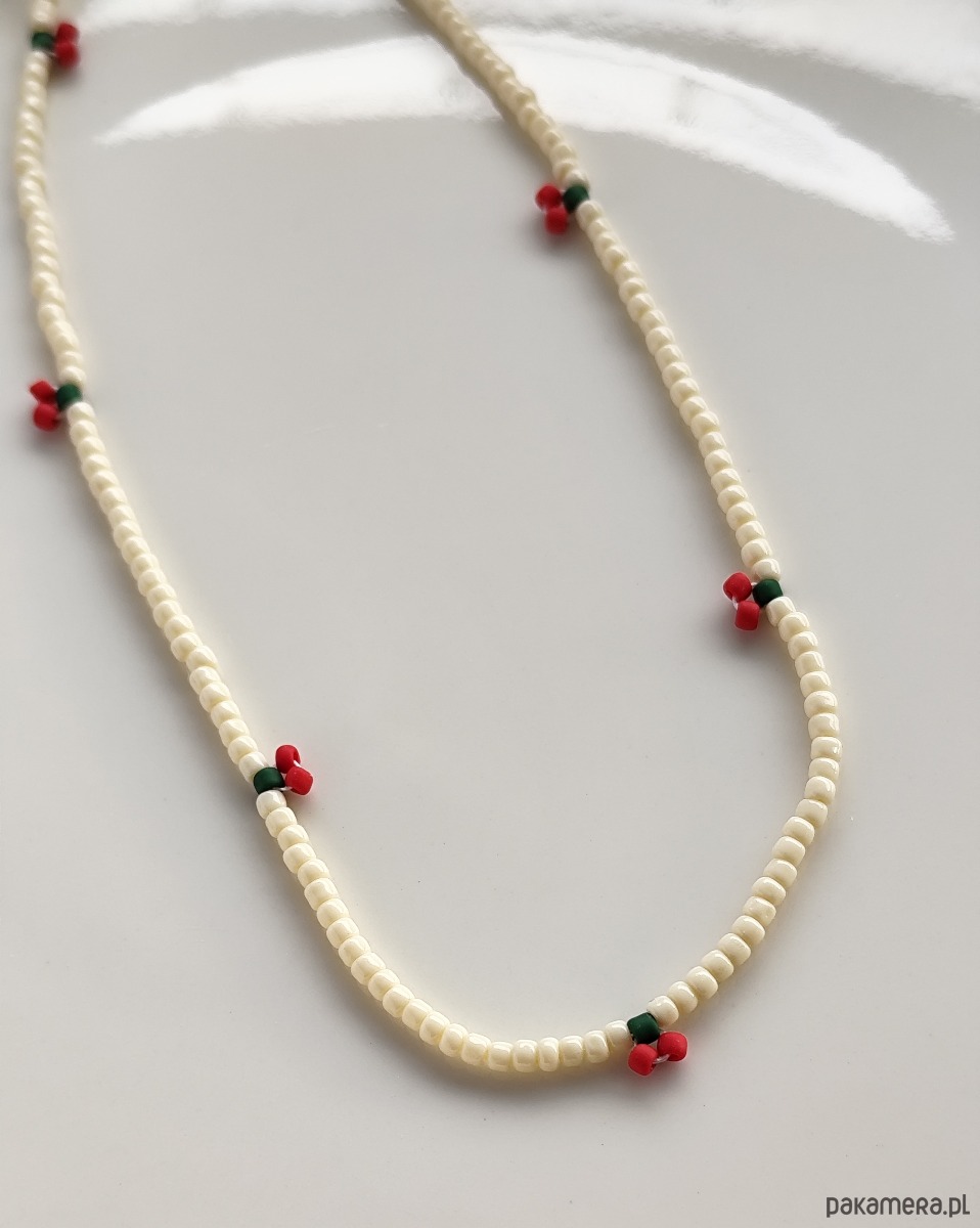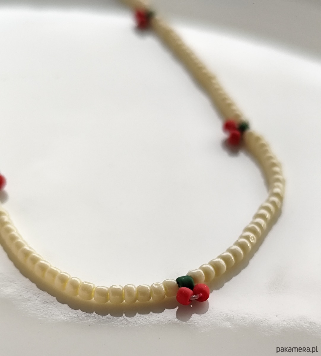 Przepiękny naszyjnik wykonany z najwyższej jakości drobnych koralików. Czerwone akcenty. Długość ok. 42 cm . Zapięcie stal chirurgiczna.