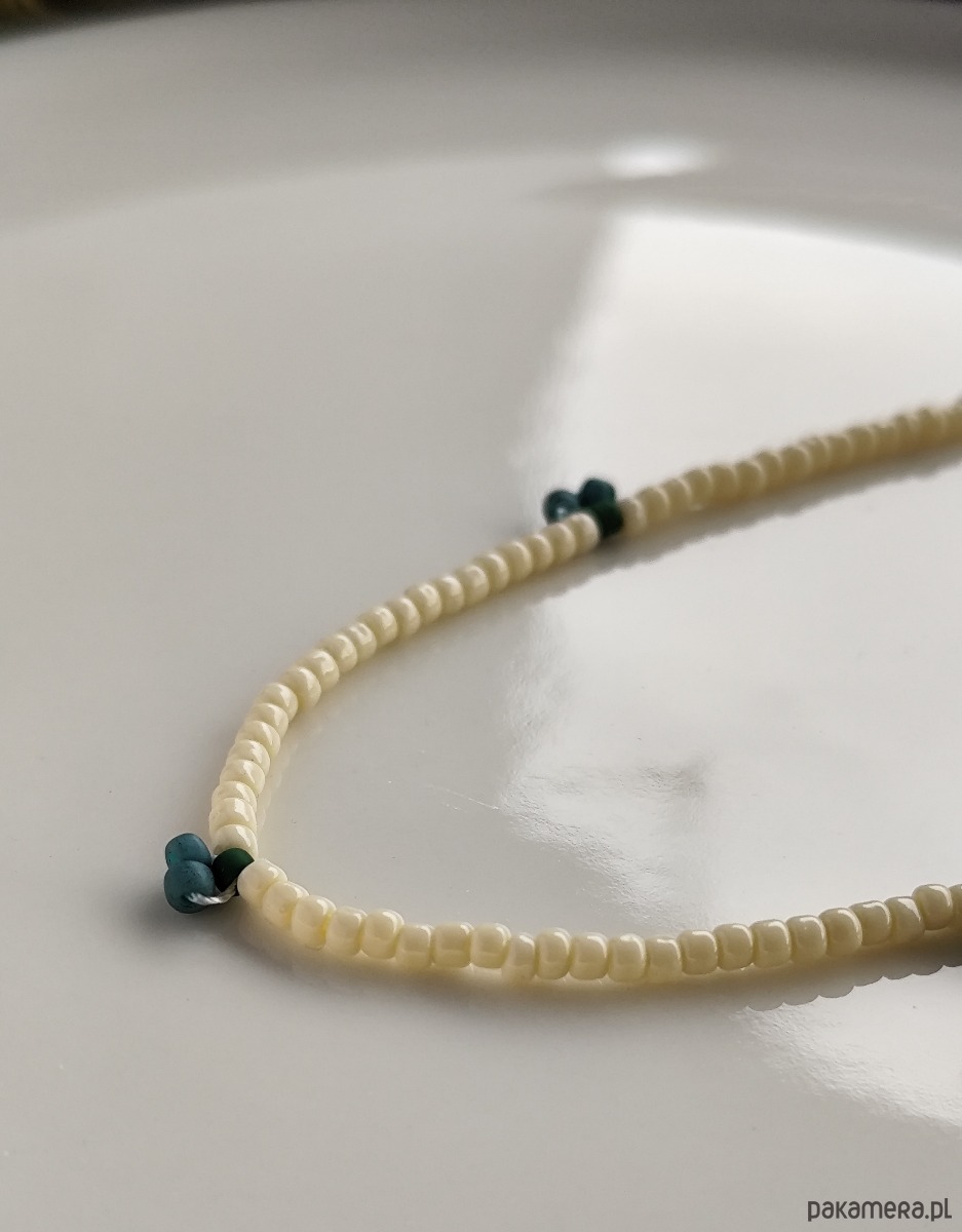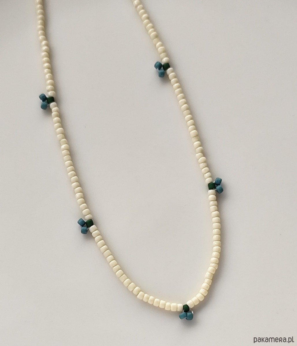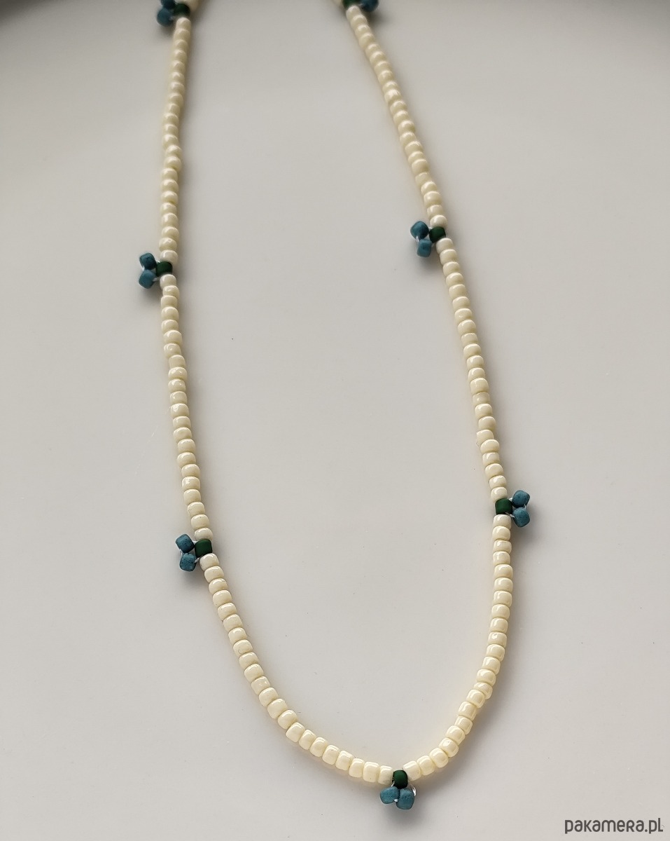 Przepiękny naszyjnik wykonany z najwyższej jakości drobnych koralików. Turkusowo - zielone akcenty. Długość ok. 42 cm . Zapięcie stal chirurgiczna.