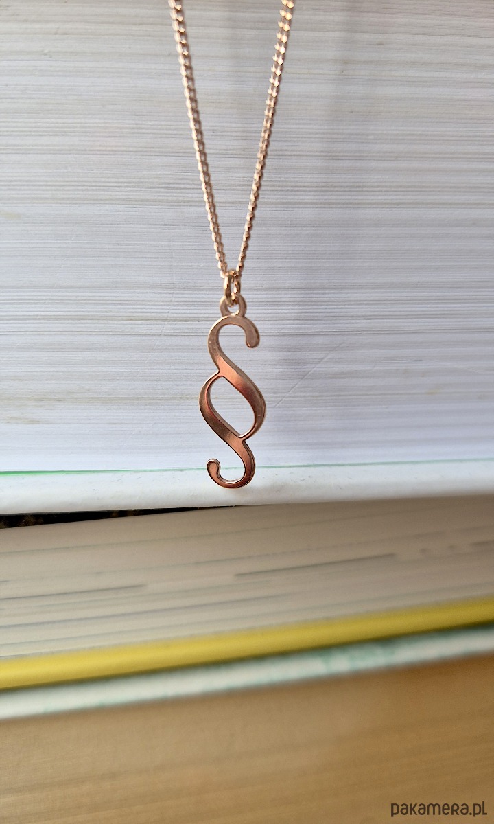 Naszyjnik wykonany ze srebra pr.925 lub srebra 925 pokrytego dwoma warstwami 24K złota lub różowego złota. Zawieszka w kształcie paragrafu.