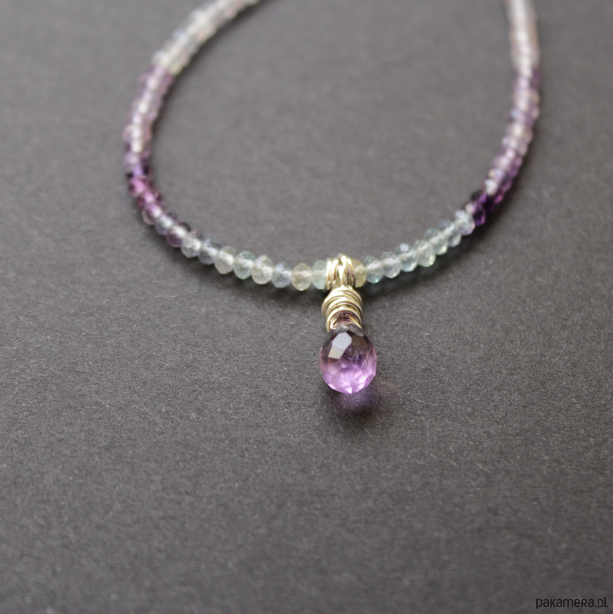 Naszyjnik ozdobiony został fasetowanym ametystem wielkości 0,6 cm. Minerał charakteryzuje piękne jasne wybarwienie.