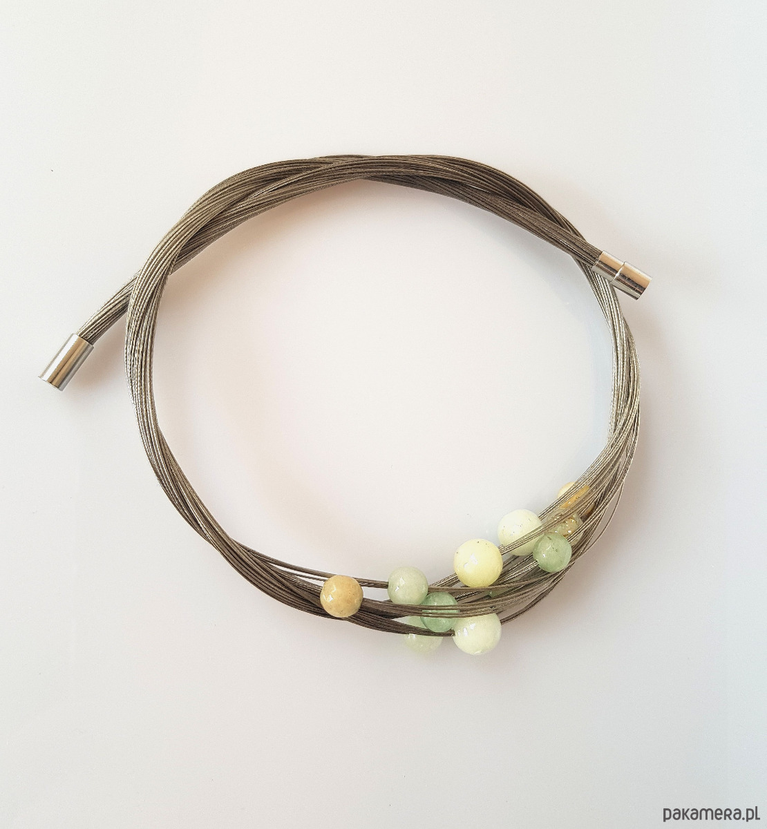Zapleciony na bazie linki jubilerskiej z fasetowanych jadeitów o pastelowych odcieniach amazonitu.