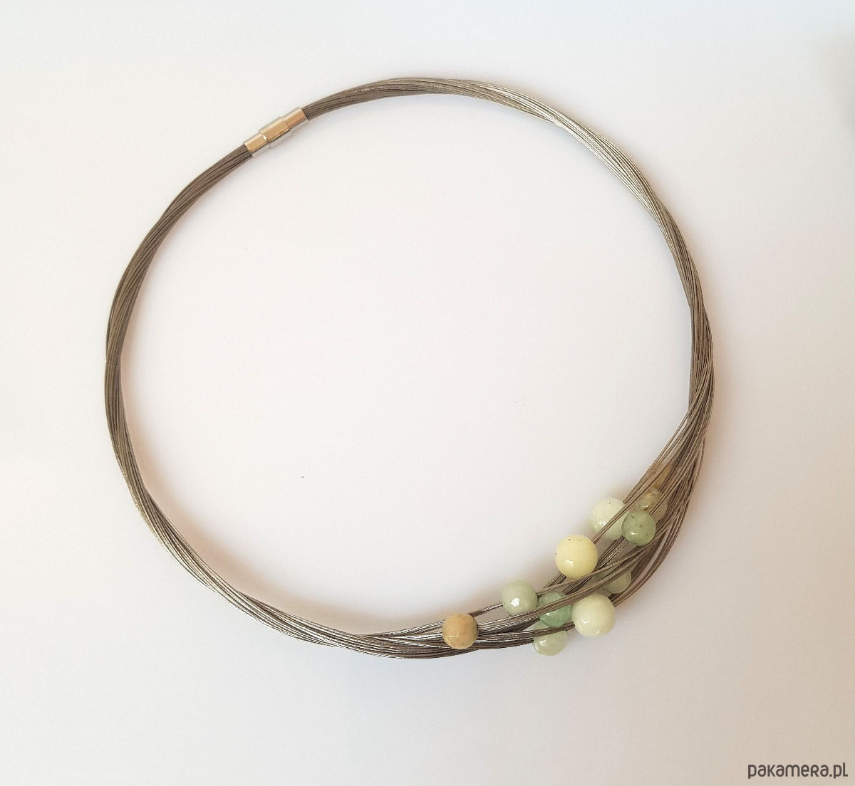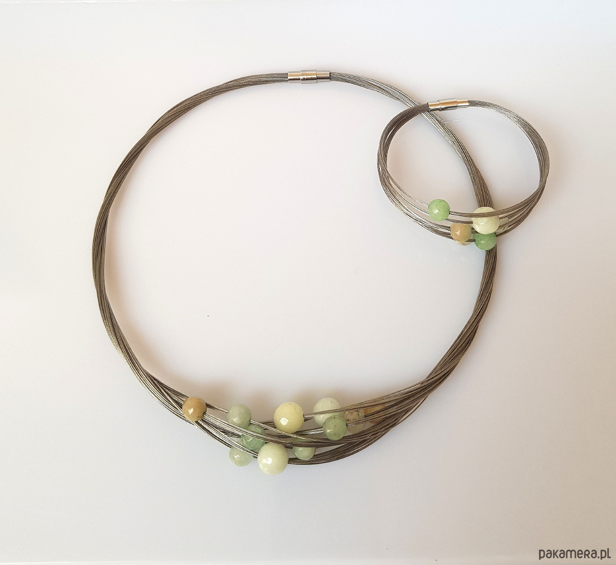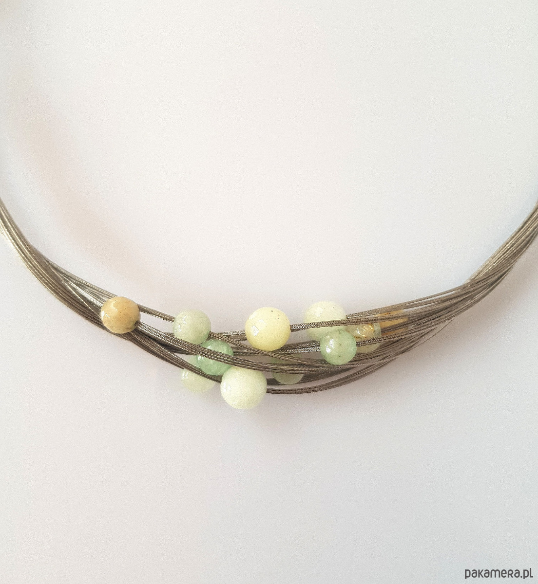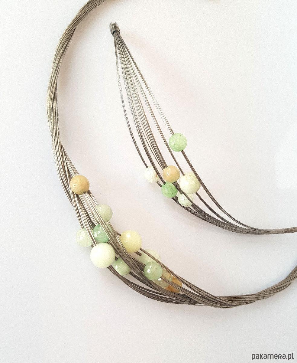 Zapleciony na bazie linki jubilerskiej z fasetowanych jadeitów o pastelowych odcieniach amazonitu.