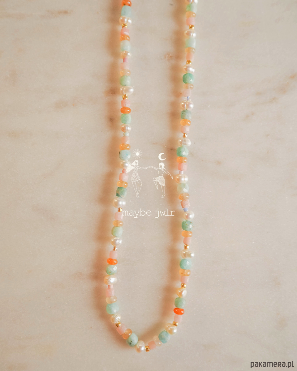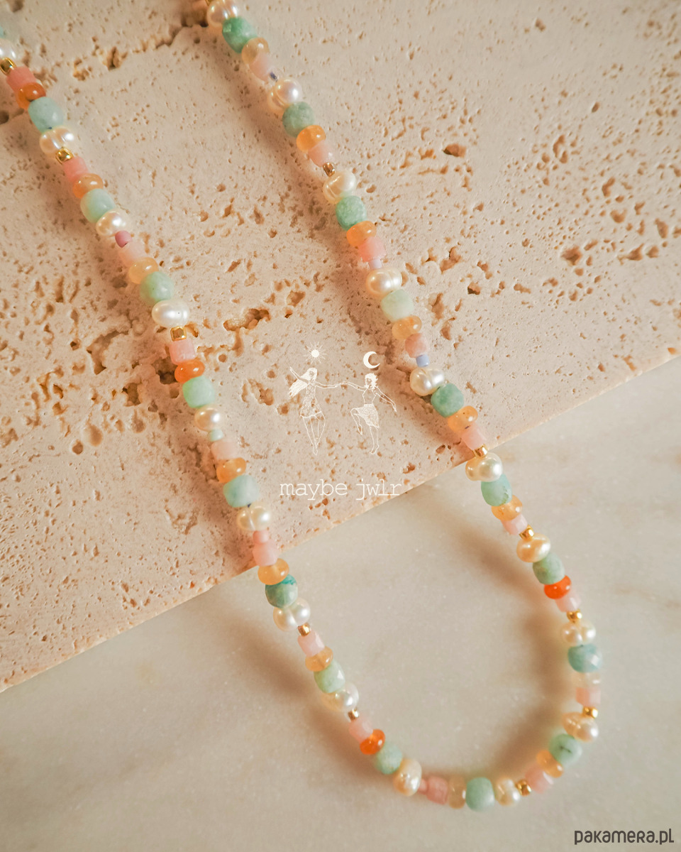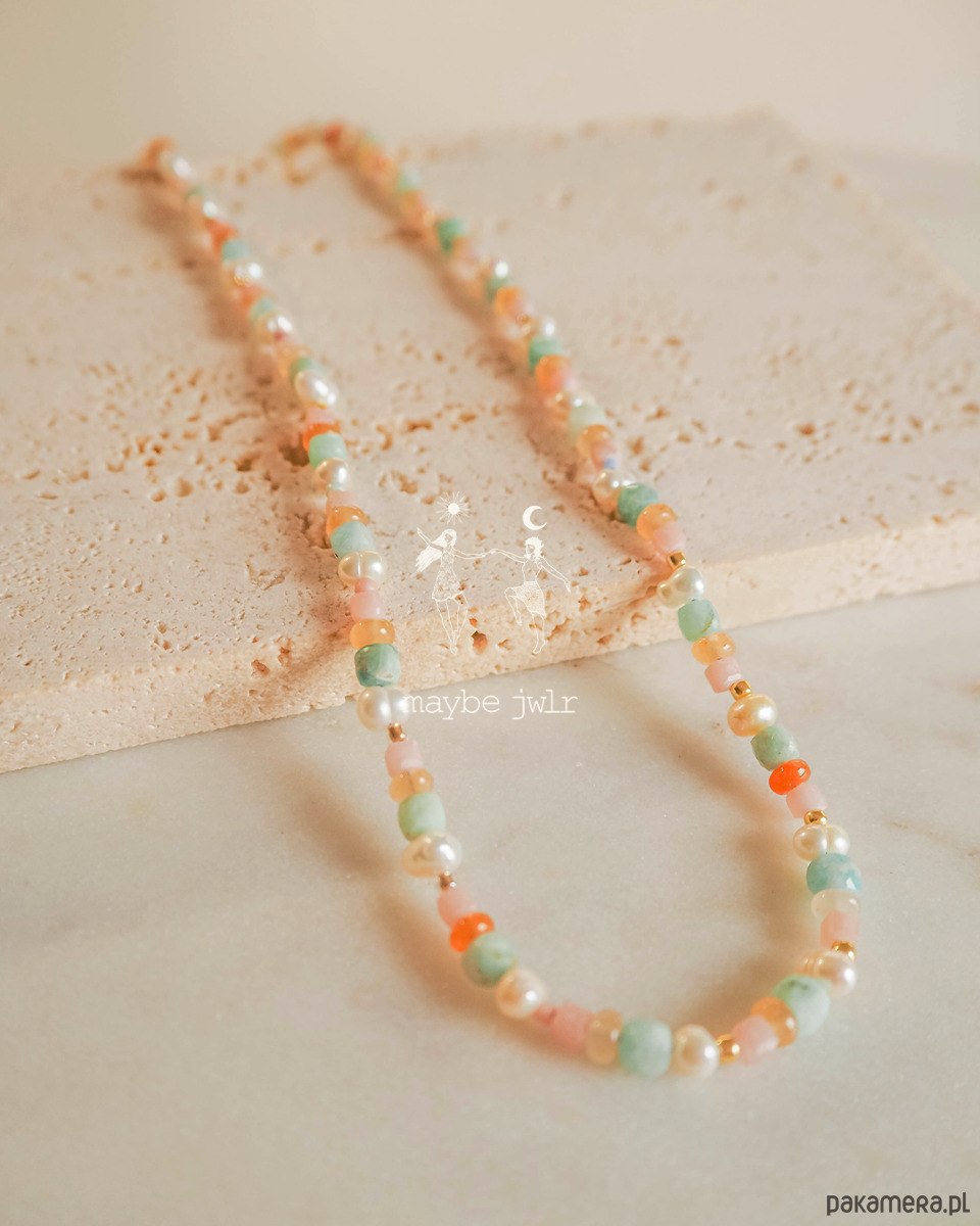 Naszyjnik pastelowy z kamieni naturalnych został stworzony z myślą o osobach, które kochają kolor, lekkość i biżuterię niosącą ze sobą pozytywną energię. Jego barwy i charakter powstały z inspiracji latem nad morzem: ciepłym światłem zachodzącego słońca, chłodną bryzą nad wodą i nostalgicznym poszukiwaniem bursztynów w piasku.