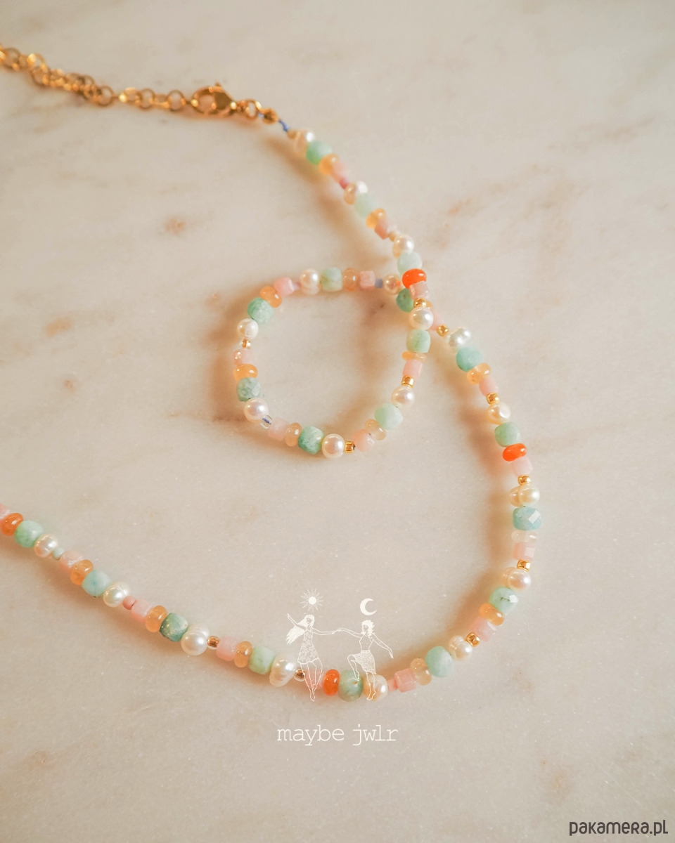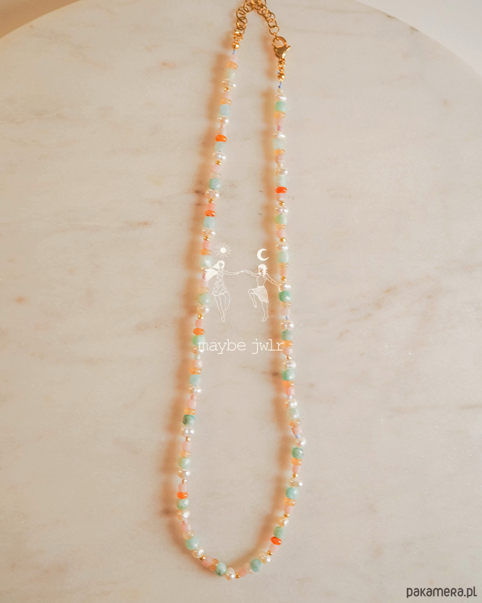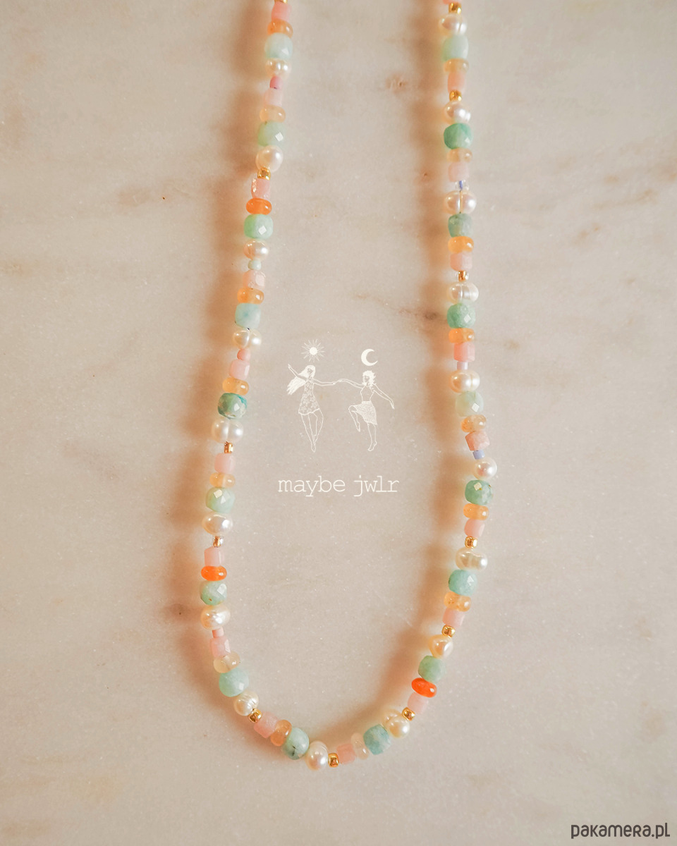 Naszyjnik pastelowy z kamieni naturalnych został stworzony z myślą o osobach, które kochają kolor, lekkość i biżuterię niosącą ze sobą pozytywną energię. Jego barwy i charakter powstały z inspiracji latem nad morzem: ciepłym światłem zachodzącego słońca, chłodną bryzą nad wodą i nostalgicznym poszukiwaniem bursztynów w piasku.