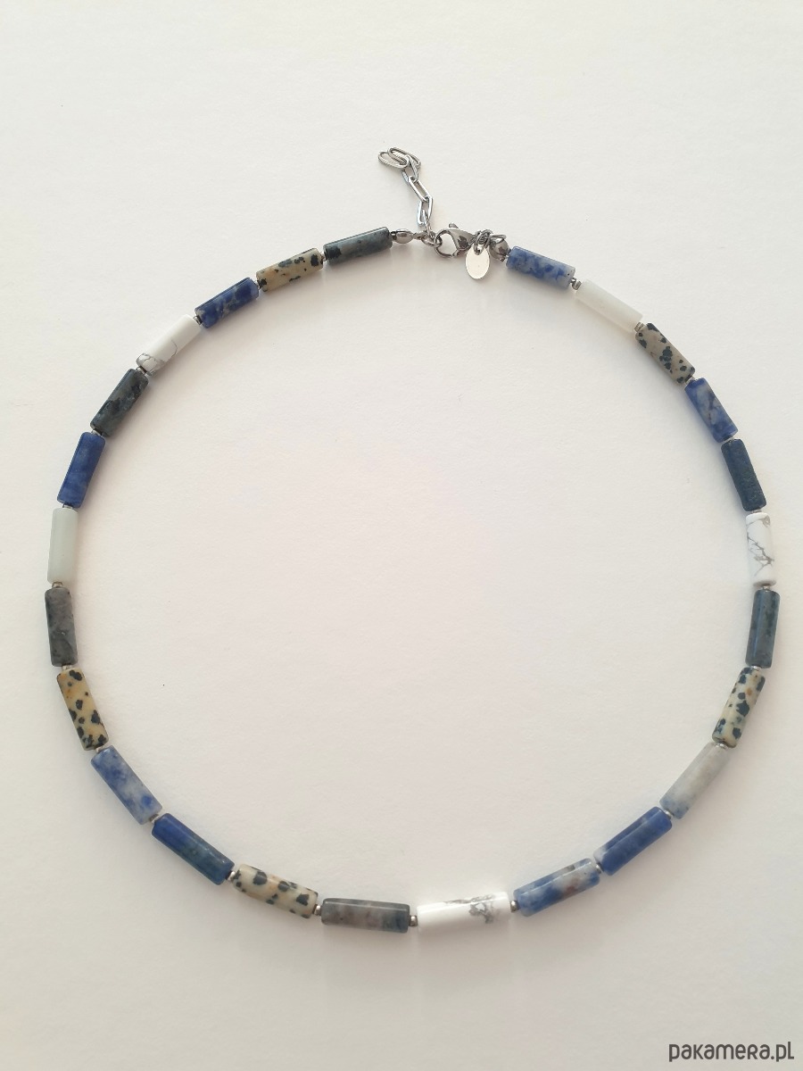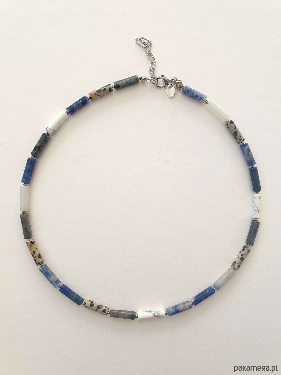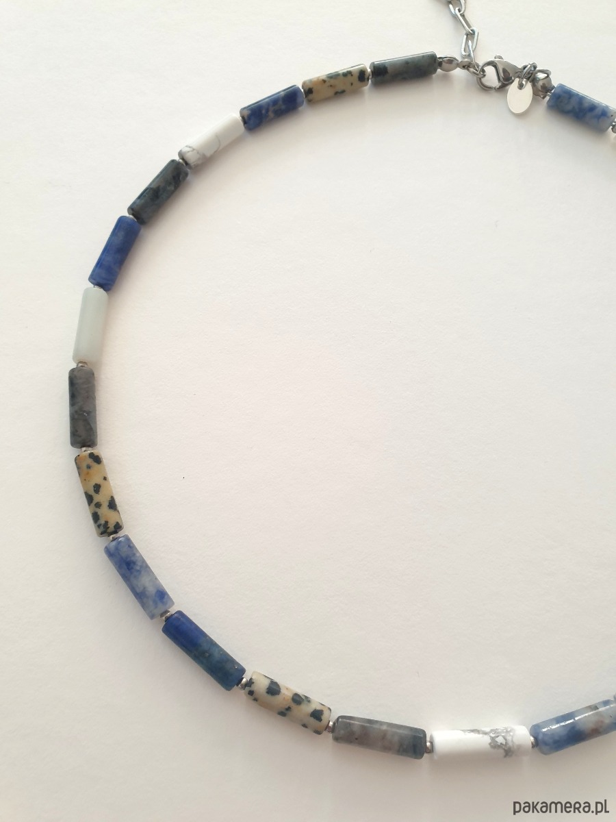 Wielobarwny, naszyjnik, choker PATYCZKI .Tworzony z kamieni naturalnych: howlit biały, lapis lazuli, jaspis niebieski, jaspis dalmatyński, larwikit, w kształcie patyczków. Na zdjęciu przykładowy naszyjnik, tworzę go na zamówienie z tych samych kamieni w tej samej tonacji kolorystycznej, ale mogą być minimalne różnice bo każdy kamień jest wyjątkowy.