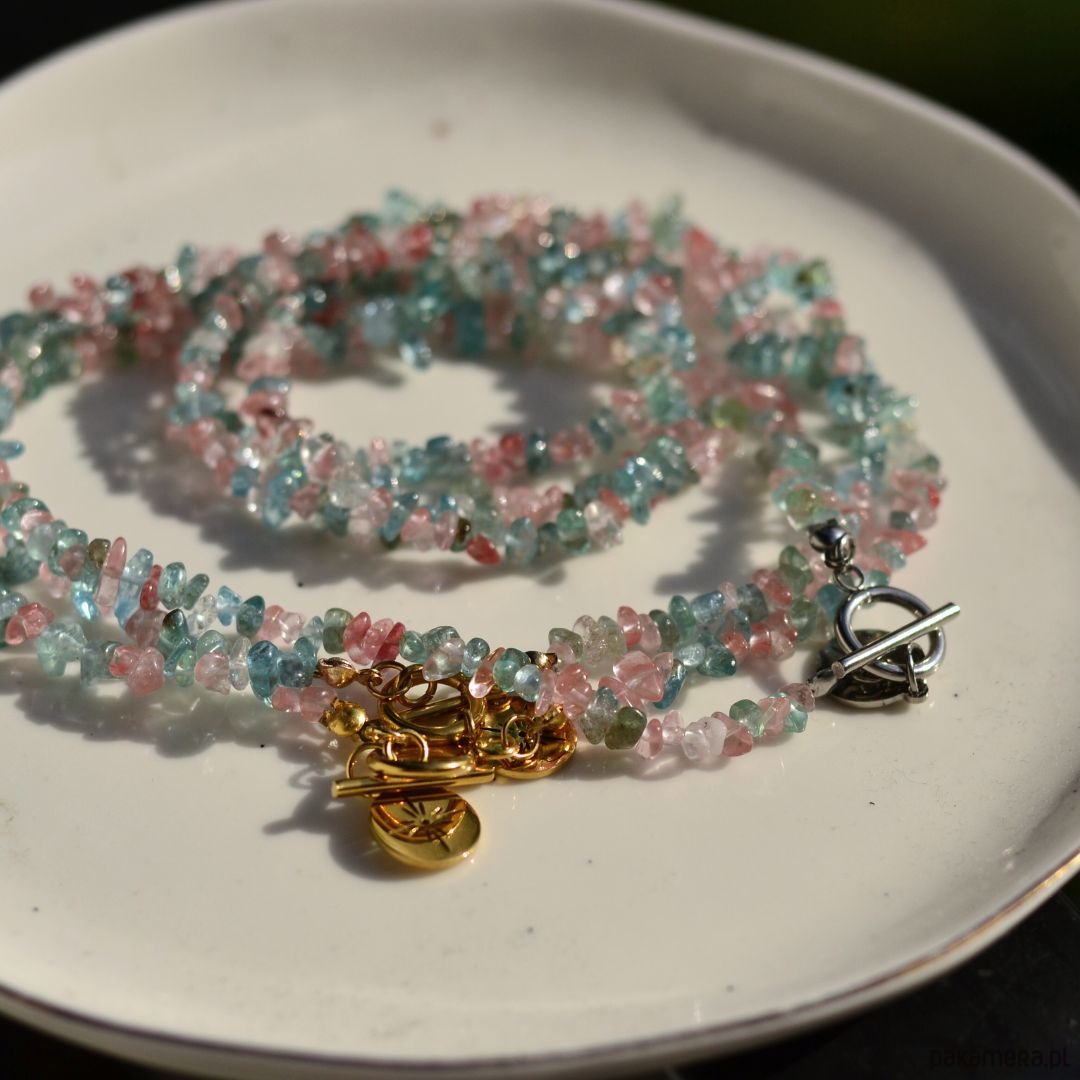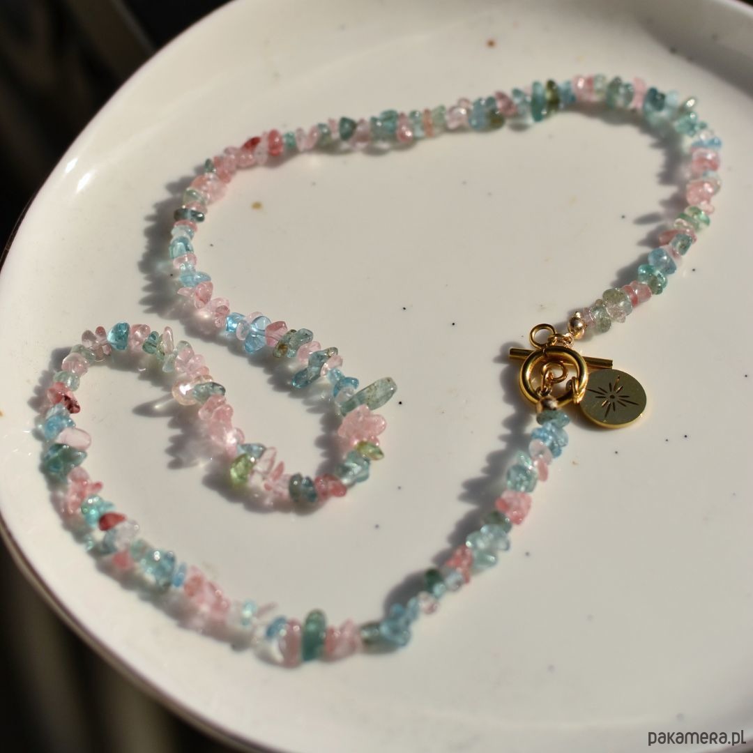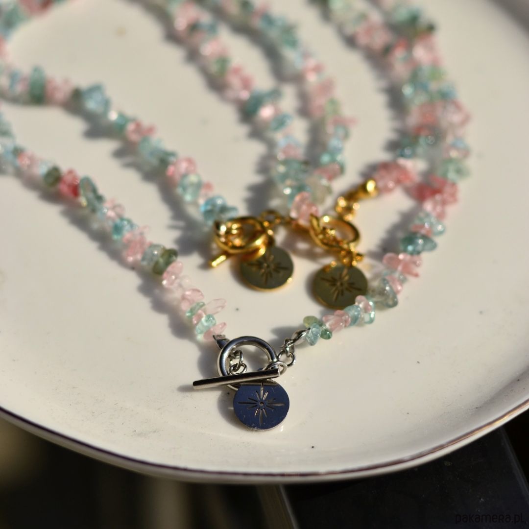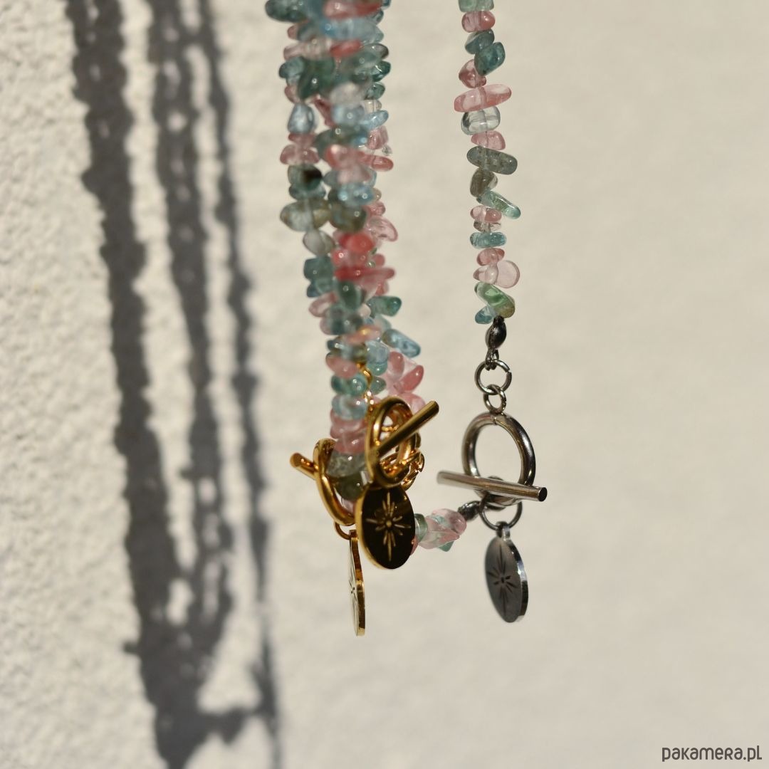 Naszyjnik z nieregularnymi koralikami z kamieni naturalnych, zapięciem typu toggle i zawieszką ze stali szlachetnej.