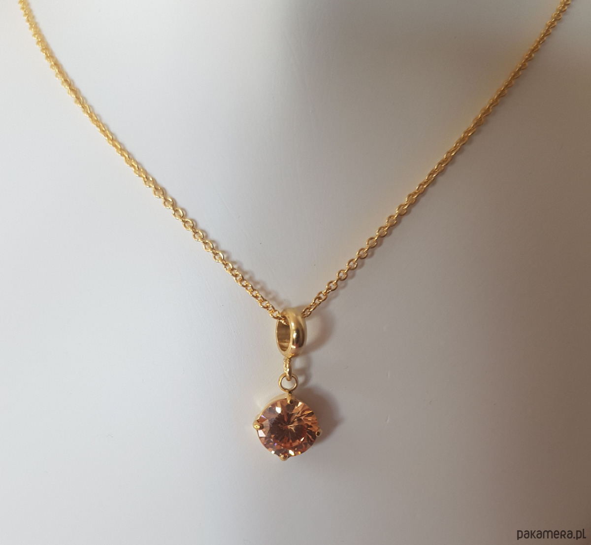 Elegancki, delikatny łańcuszek z brzoskwiniową cyrkonią pięknie współpracującą ze światłem.