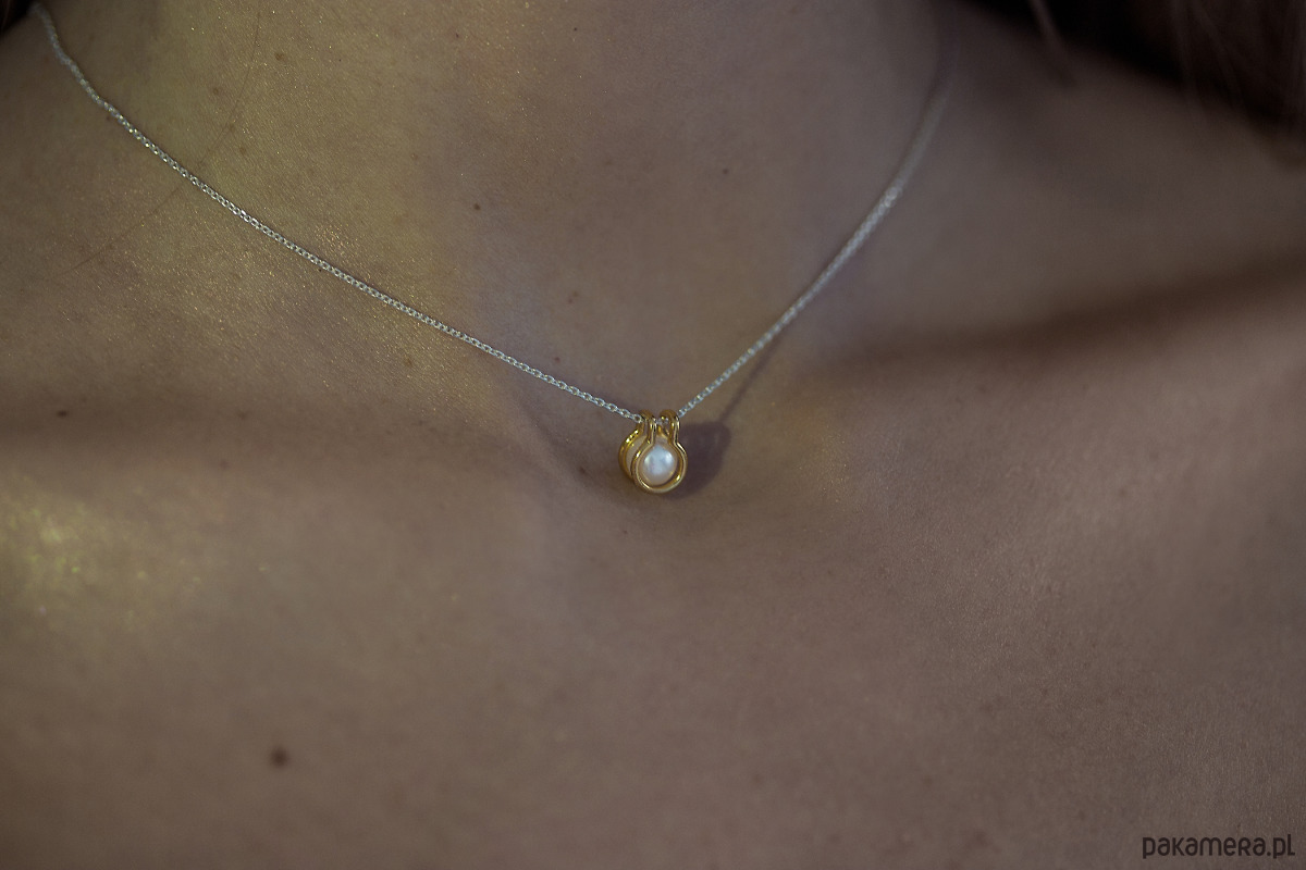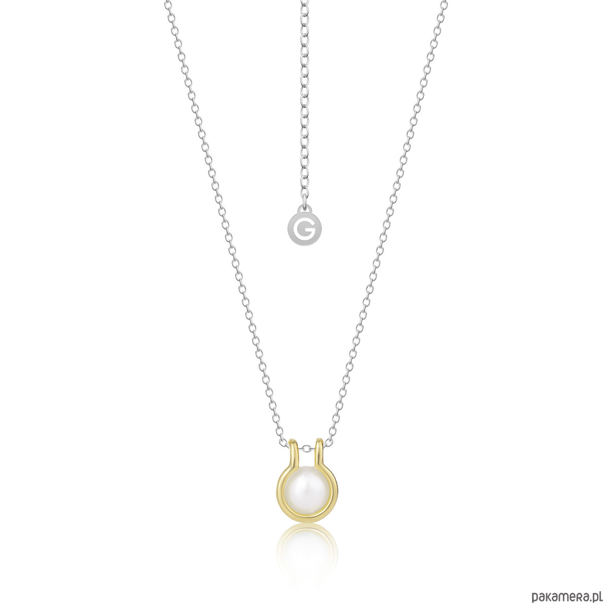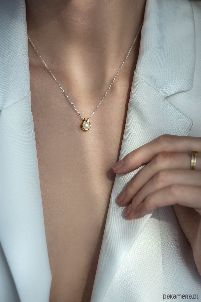 Minimalistyczny naszyjnik ozdobiony piękną perłą słodkowodną. Niezwykle unikatowy wzór zawieszony na delikatnym srebrnym łańcuszku. Idealne połącznie klasycznego piękna i nowoczesnego designu. Przy zapięciu metka z logo marki.