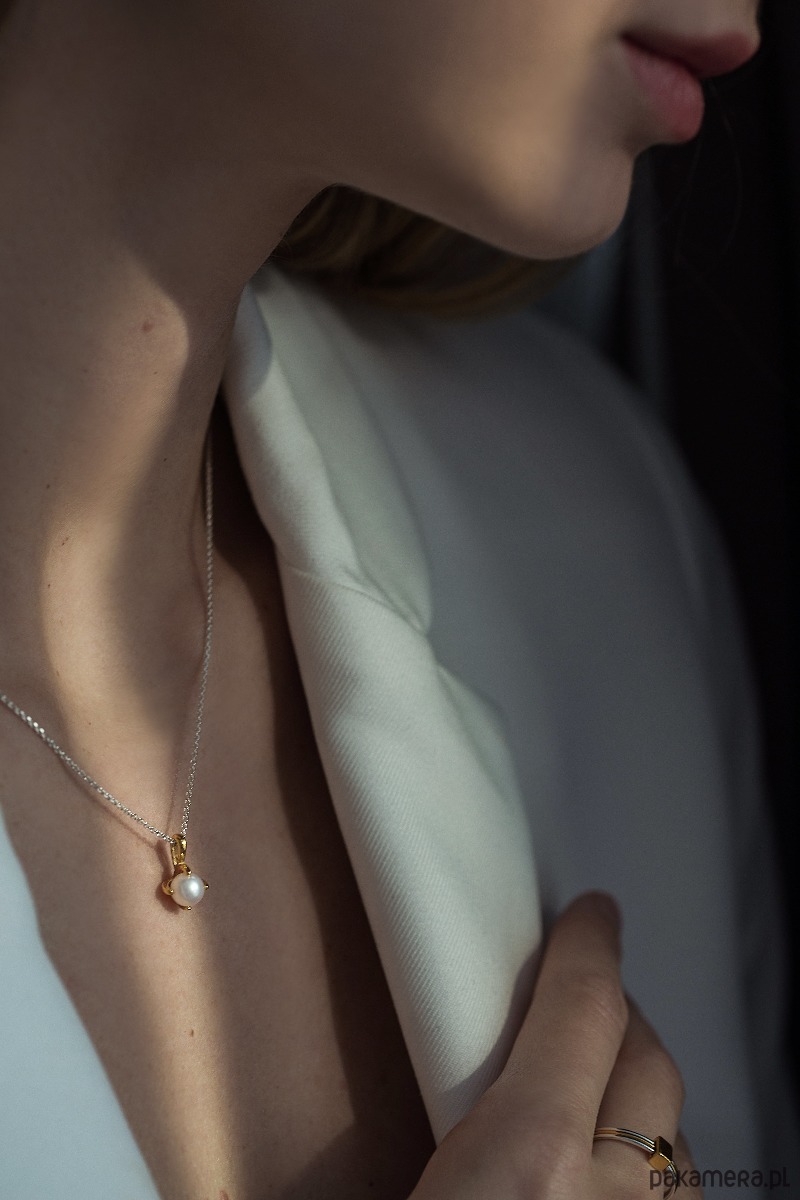 Minimalistyczny naszyjnik ozdobiony piękną perłą słodkowodną. Niezwykle elegancki wzór zawieszony na delikatnym srebrnym łańcuszku. Idealne połącznie klasycznego piękna i nowoczesnego designu. Przy zapięciu metka z logo marki.