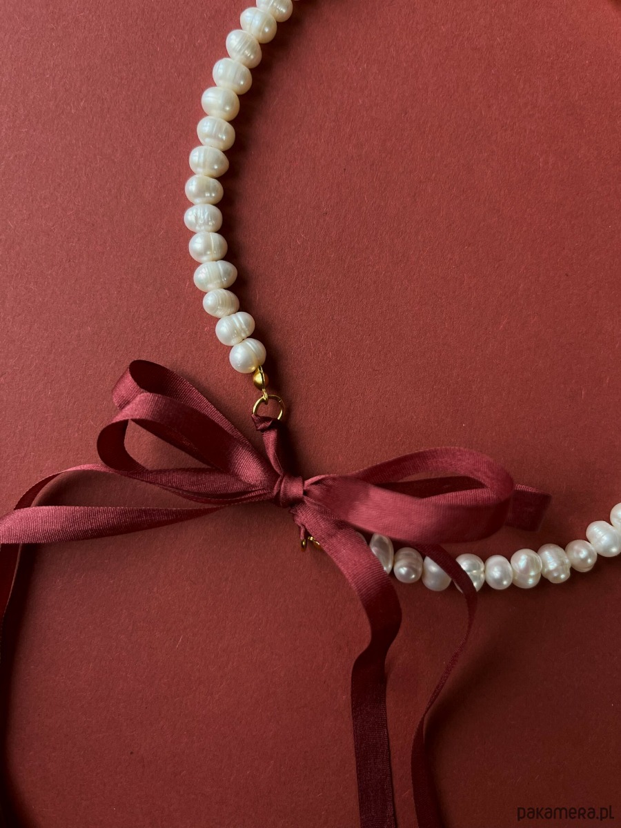 Delikatne perły naturalne w centralnym punkcie symbolizują subtelność i blask, a jedwabna wstążka w kolorze bordowym lub pudrowego różu nadaje całości miękkości i zmysłowego charakteru.