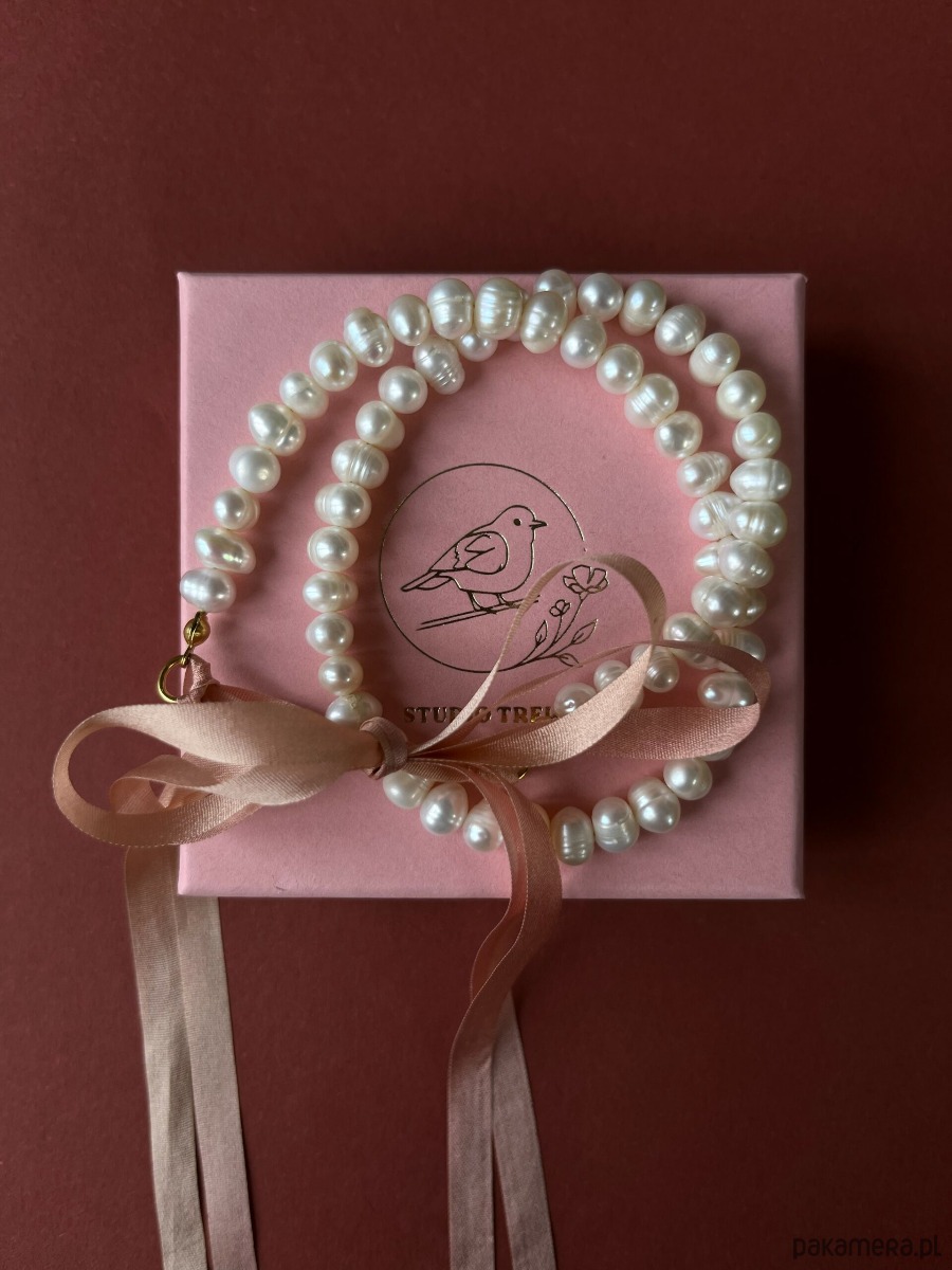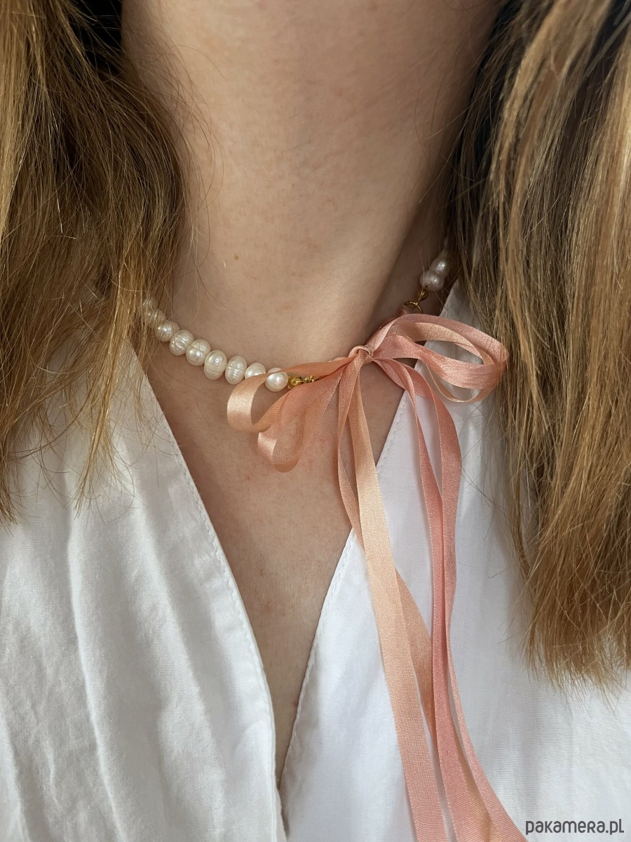 Naszyjnik został wykonany z pereł i wstążki z czystego jedwabiu — materiału luksusowego, miękkiego i wyjątkowo delikatnego. Jedwab może się gnieść, strzępić i wymaga uważnego traktowania, bo takie są jego naturalne właściwości.