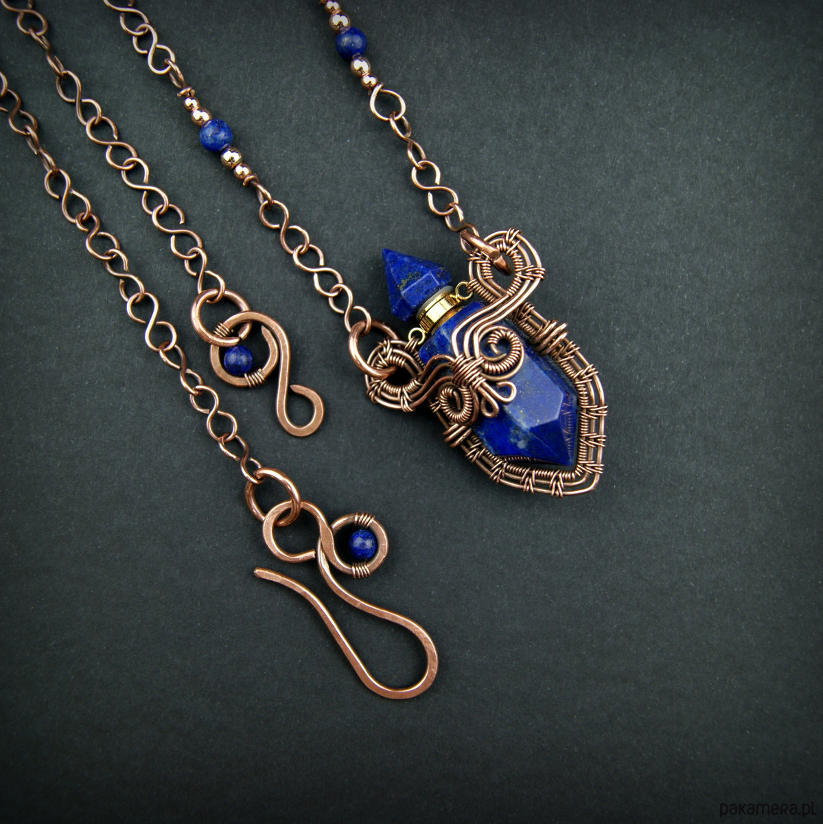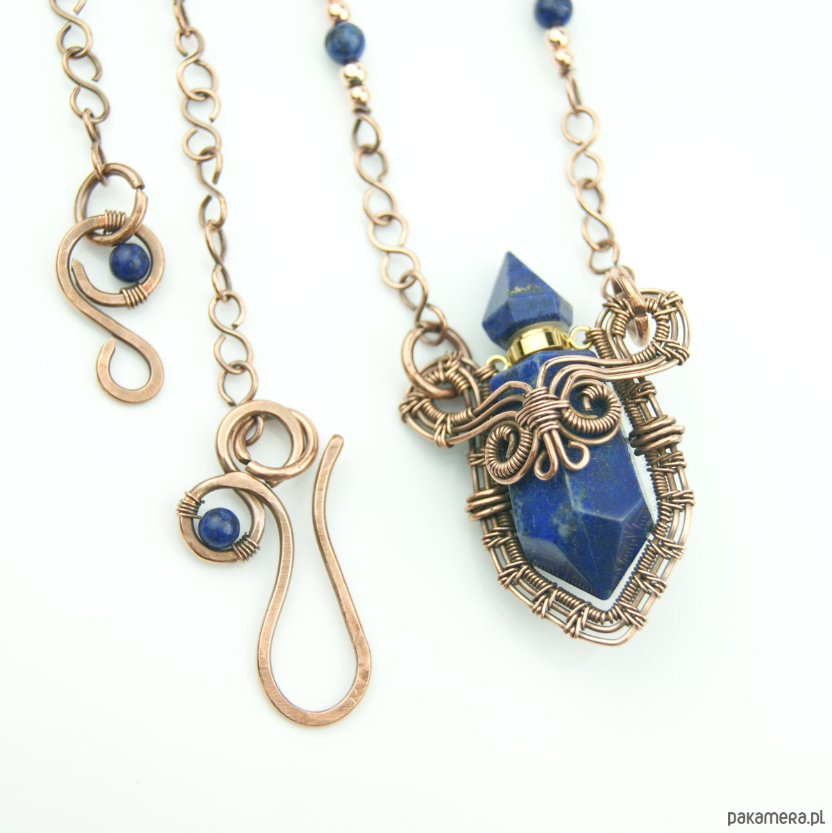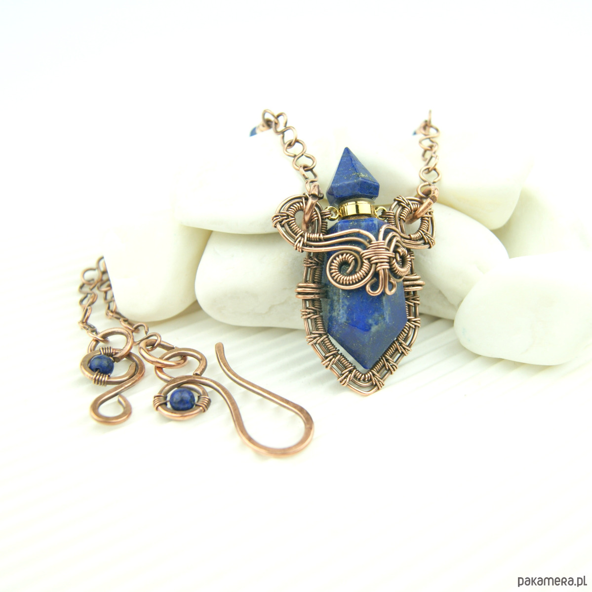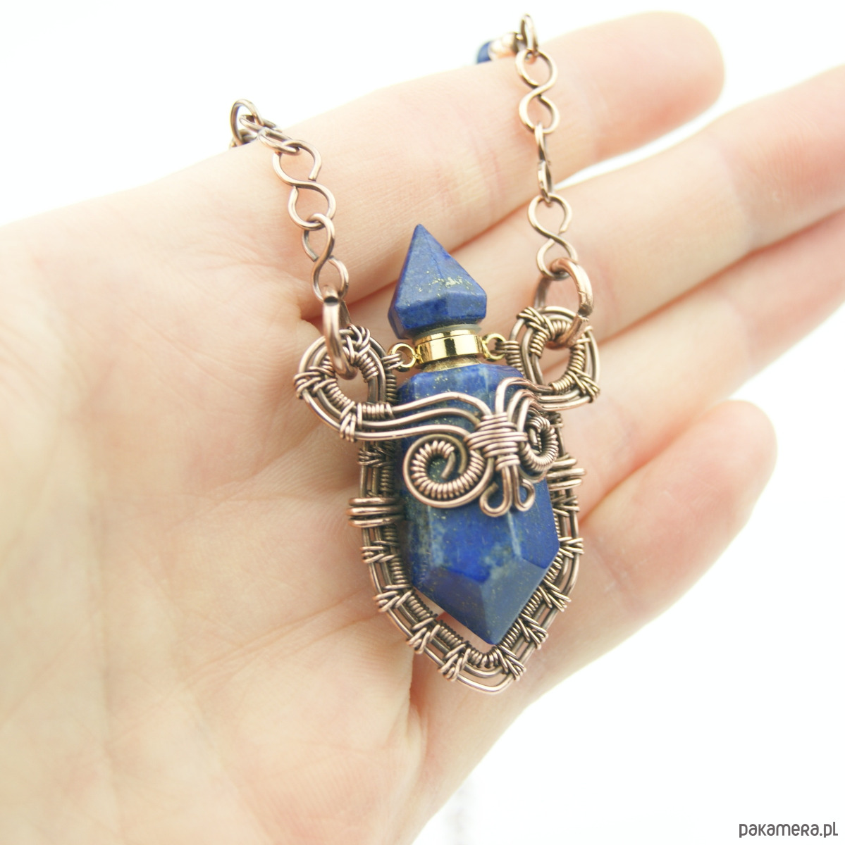 Naszyjnik wykonany w pracochłonnej technice wire wrapping. Do stworzenia naszyjnika użyto kamienia lapis lazuli w formie perfumetki oraz drutu miedzianego. Całkowita długość naszyjnika to 67 cm. Łańcuszek wykonano ręcznie. Perfumetka posiada zakręcany koreczek, w środku jest pusta - można wypełnić ją ulubionymi perfumami aby mieć je zawsze przy sobie :)