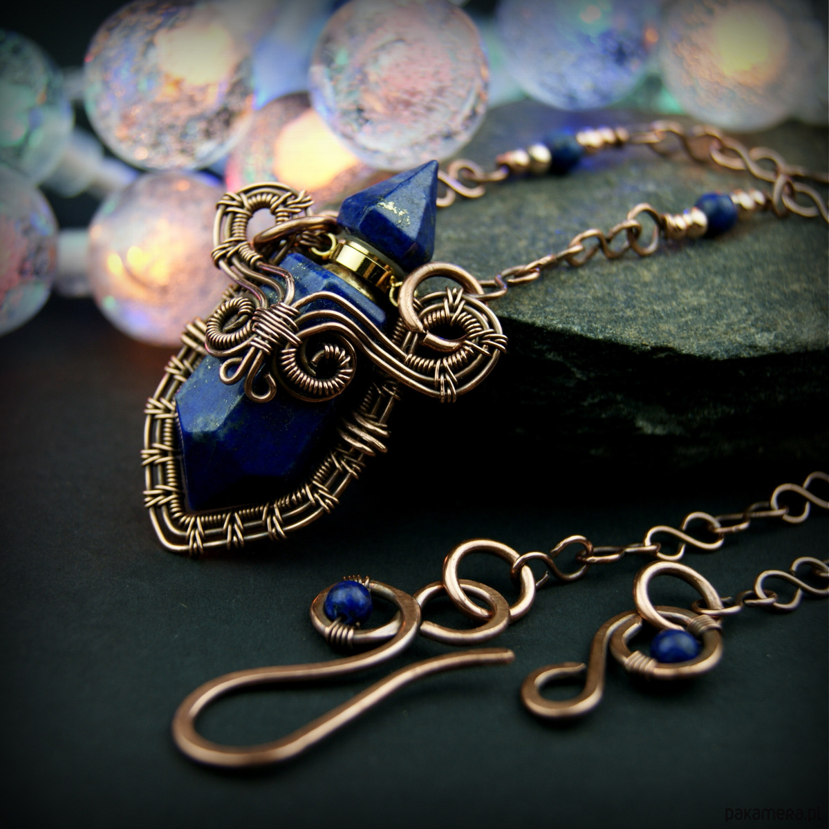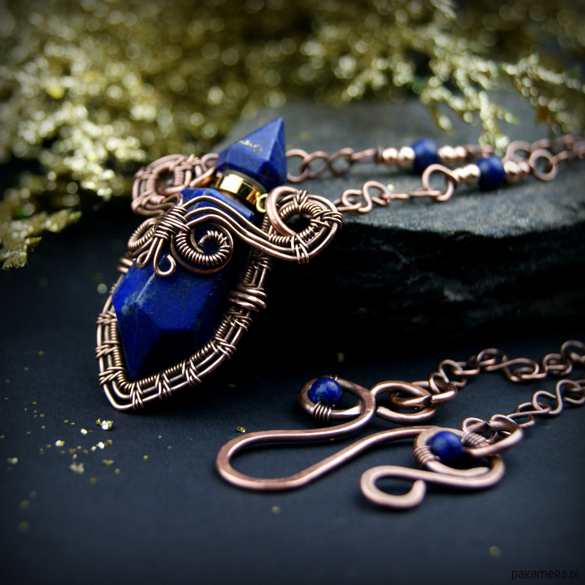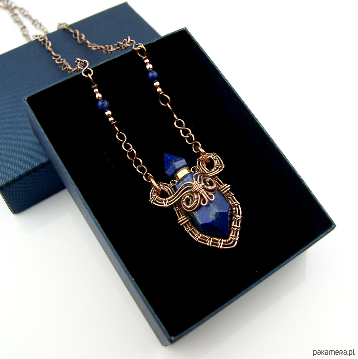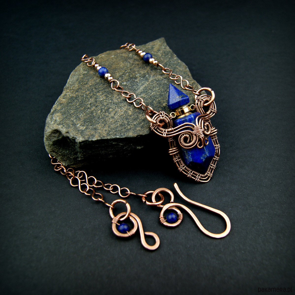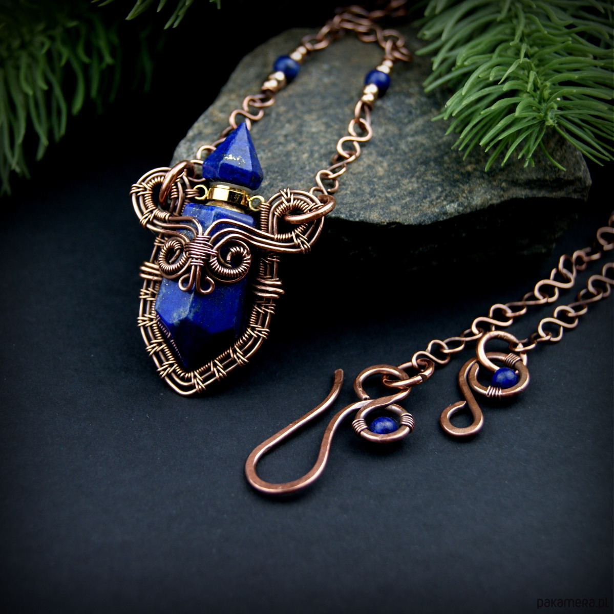 Naszyjnik wykonany w pracochłonnej technice wire wrapping. Do stworzenia naszyjnika użyto kamienia lapis lazuli w formie perfumetki oraz drutu miedzianego. Całkowita długość naszyjnika to 67 cm. Łańcuszek wykonano ręcznie. Perfumetka posiada zakręcany koreczek, w środku jest pusta - można wypełnić ją ulubionymi perfumami aby mieć je zawsze przy sobie :)