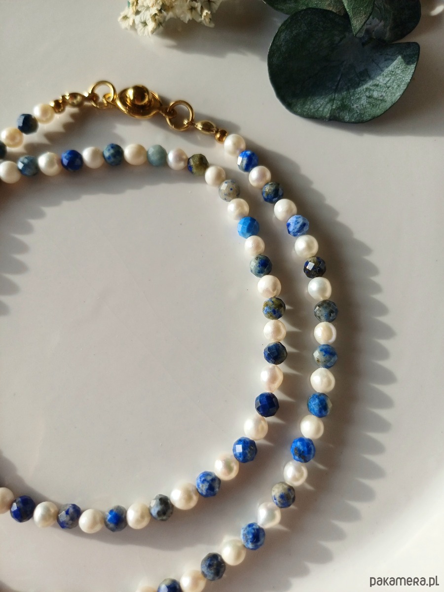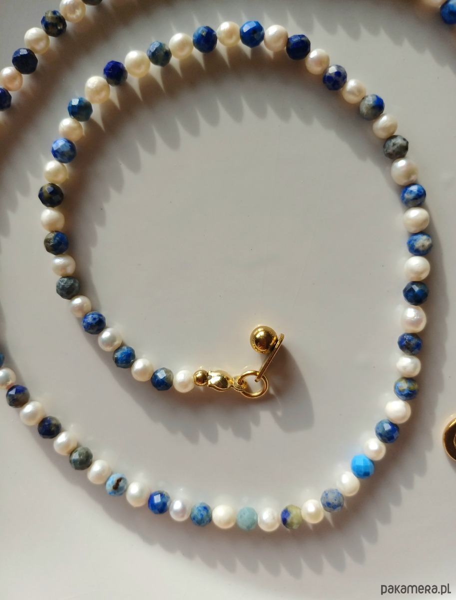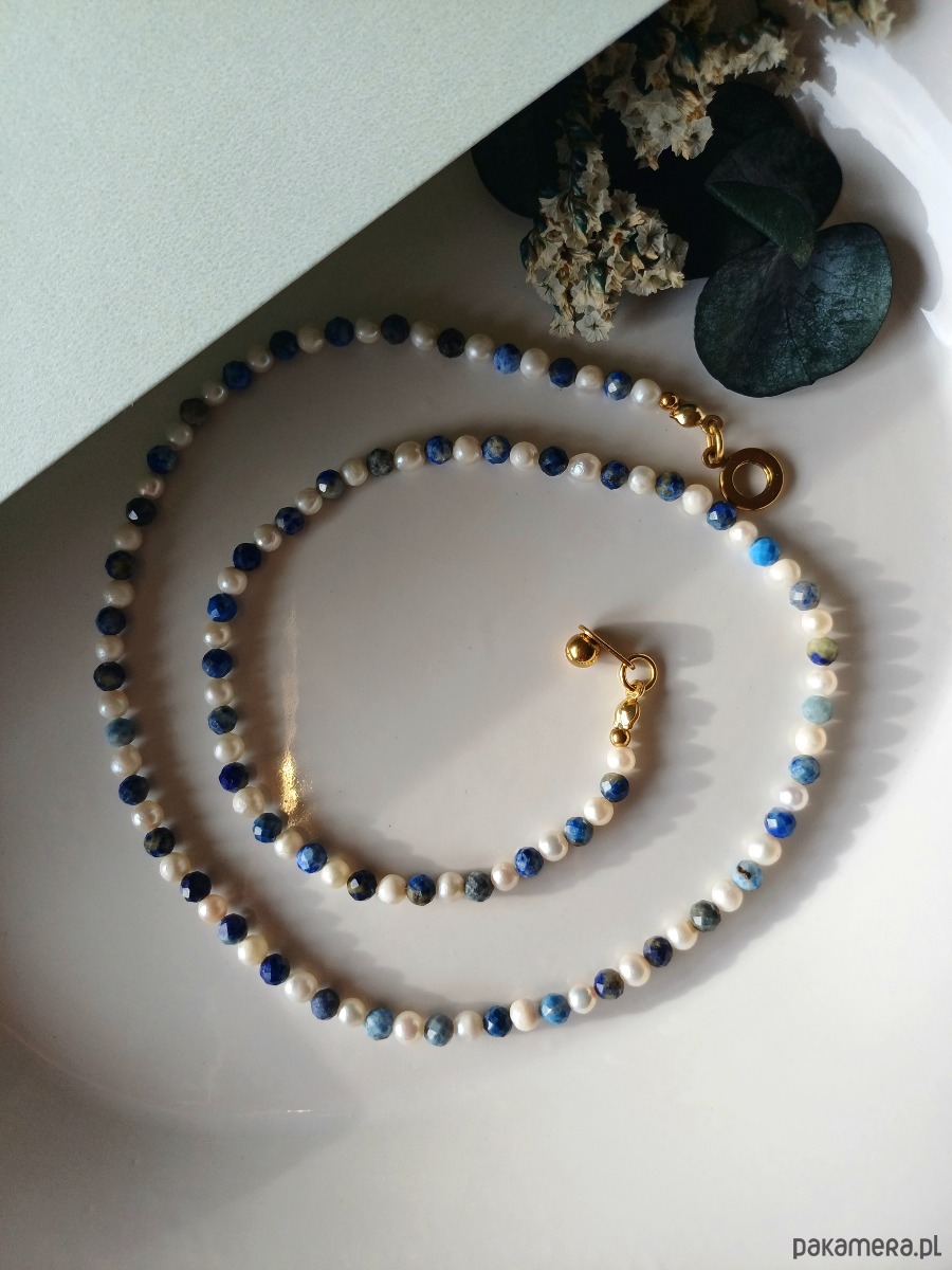 Niebiańskie połączenie kolorystyczne. Perła naturalna słodkowodna w towarzystwie lapisu lazuli - duet idealny. Klasyka z nutką nowoczesności.
