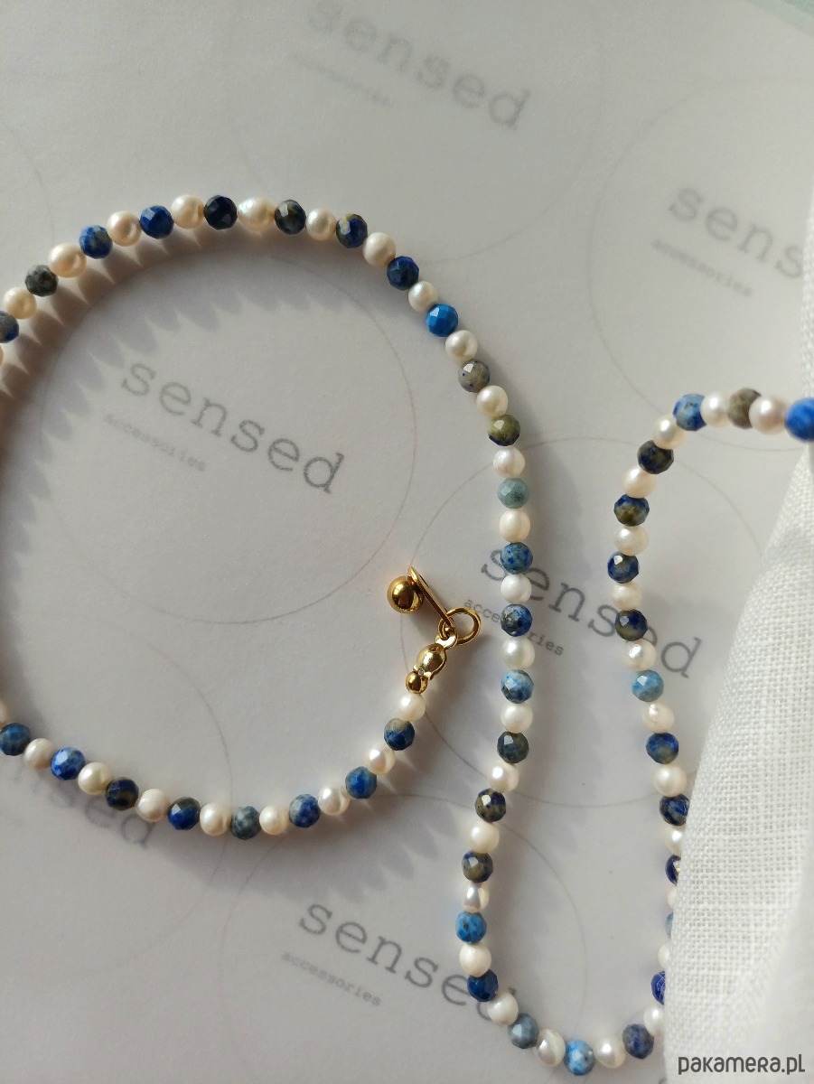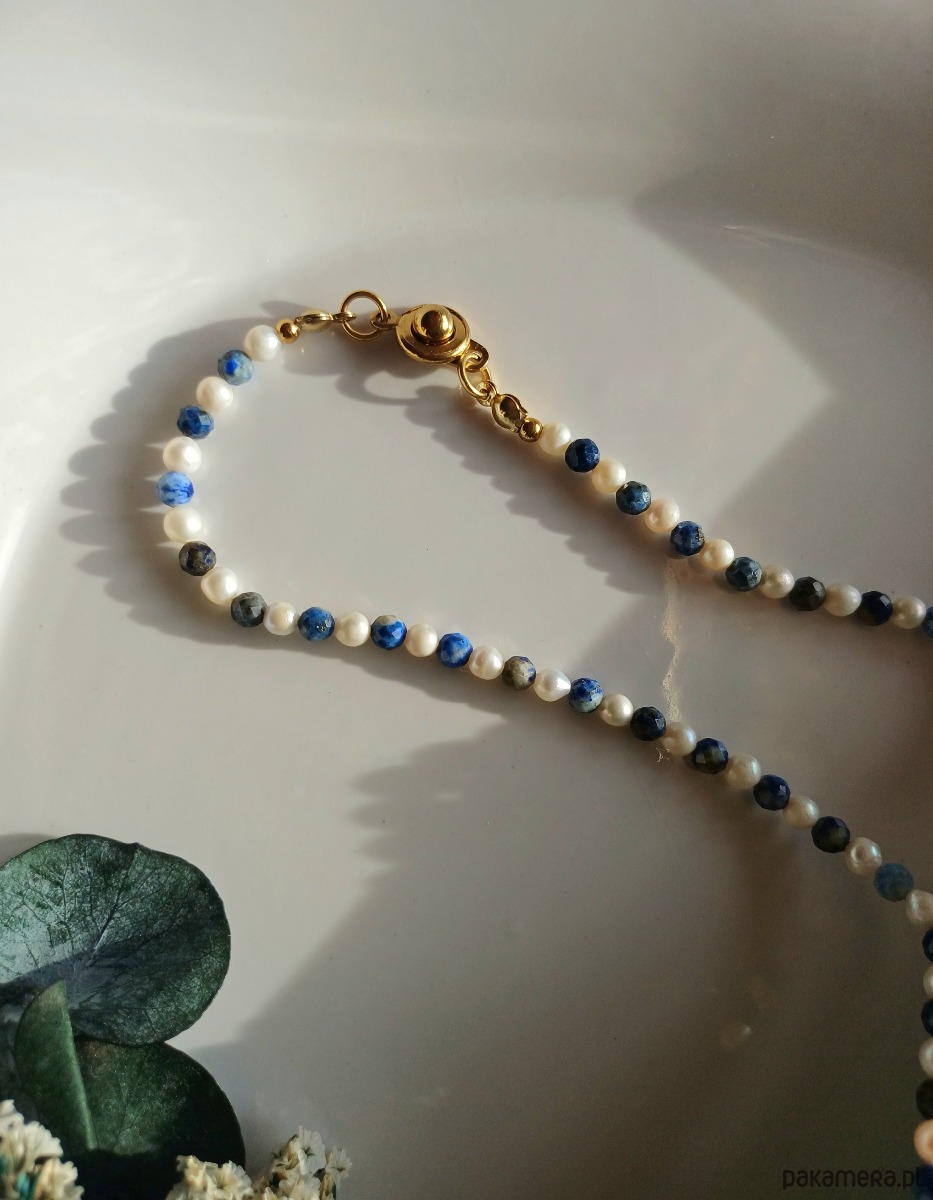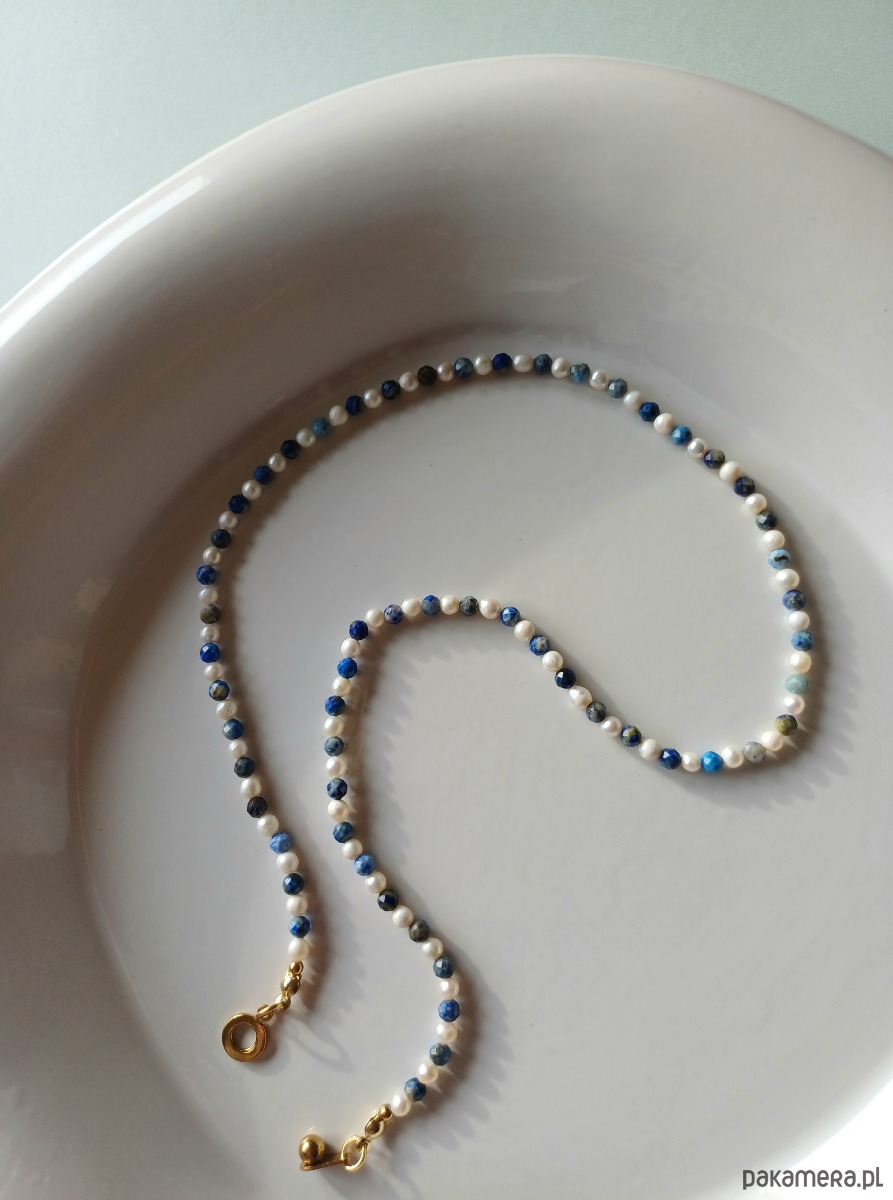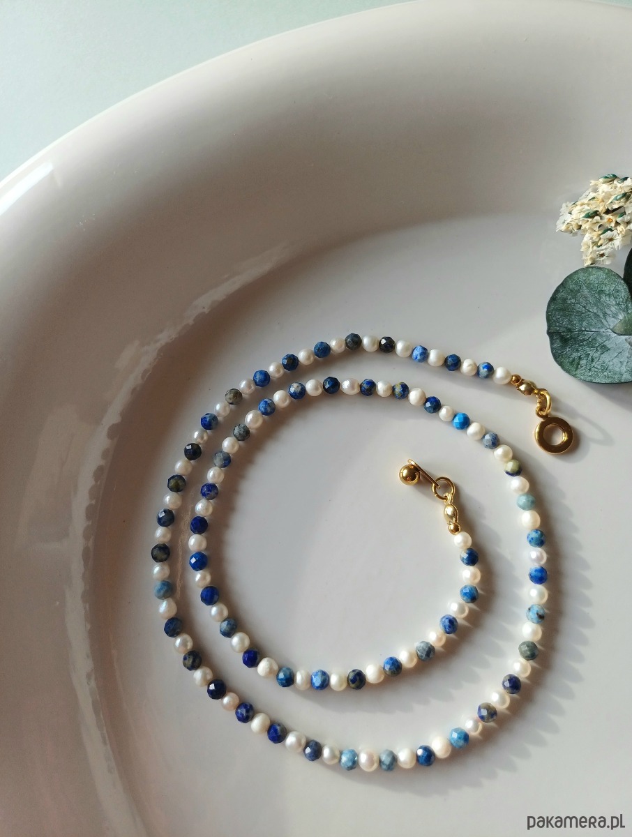 Niebiańskie połączenie kolorystyczne. Perła naturalna słodkowodna w towarzystwie lapisu lazuli - duet idealny. Klasyka z nutką nowoczesności.