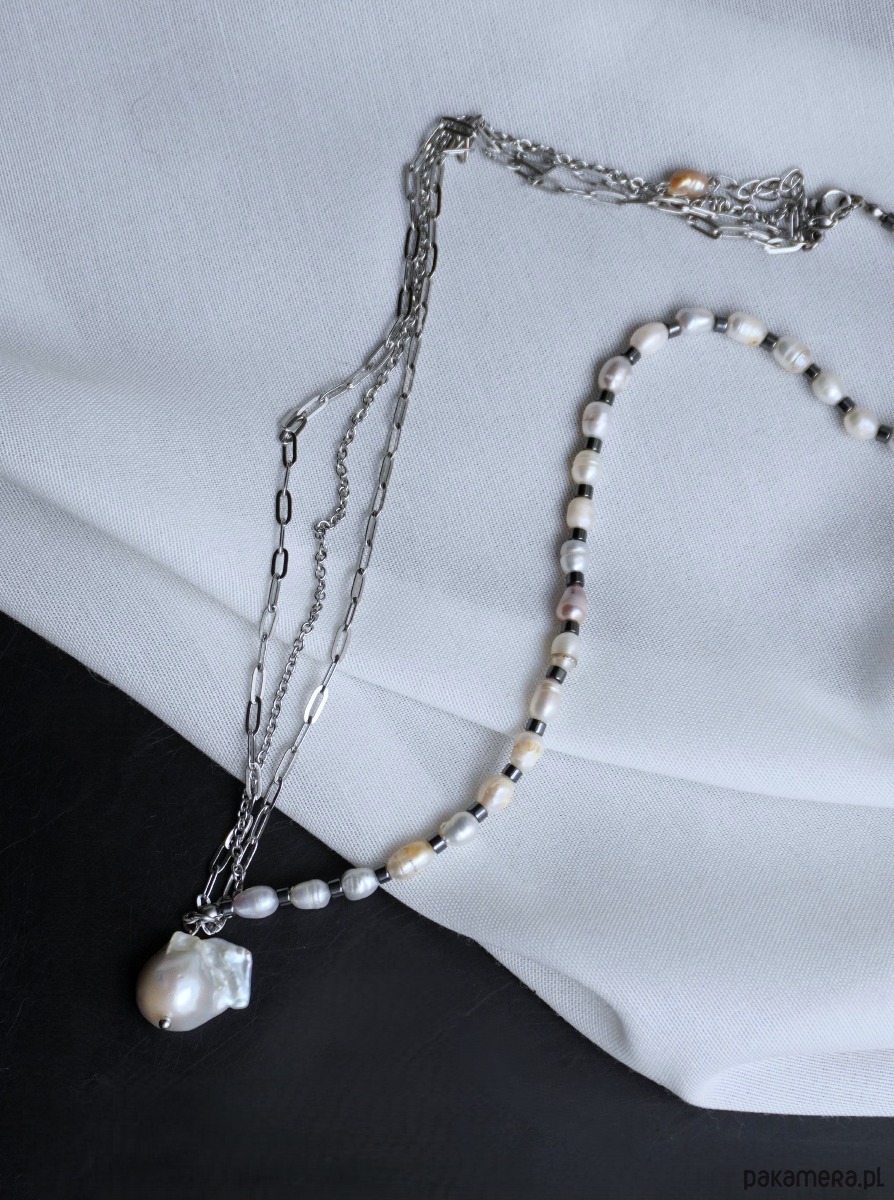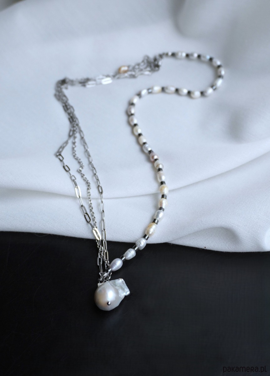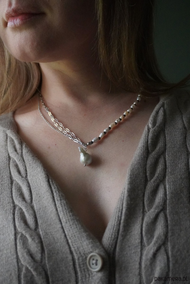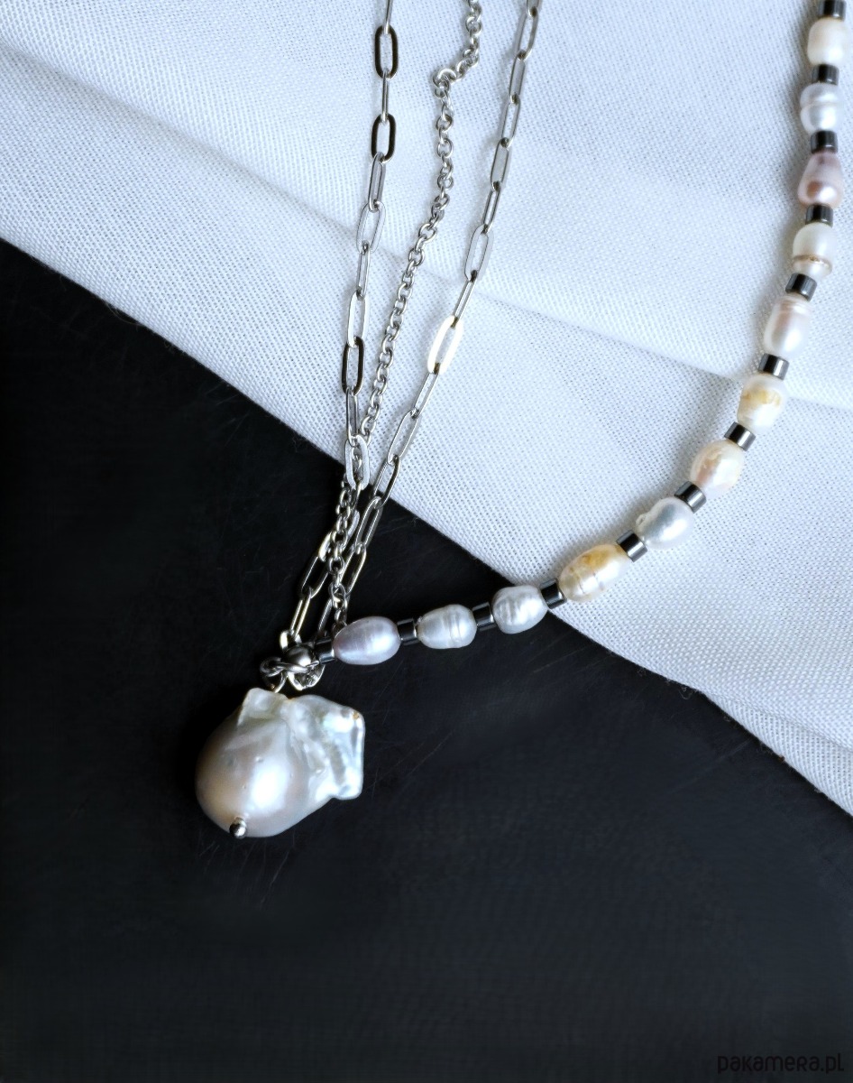 Z jednej strony wykonany jest z naturalnych pereł i hematytu o nieregularnym kształcie, które nadają biżuterii subtelności i wyjątkowego charakteru.