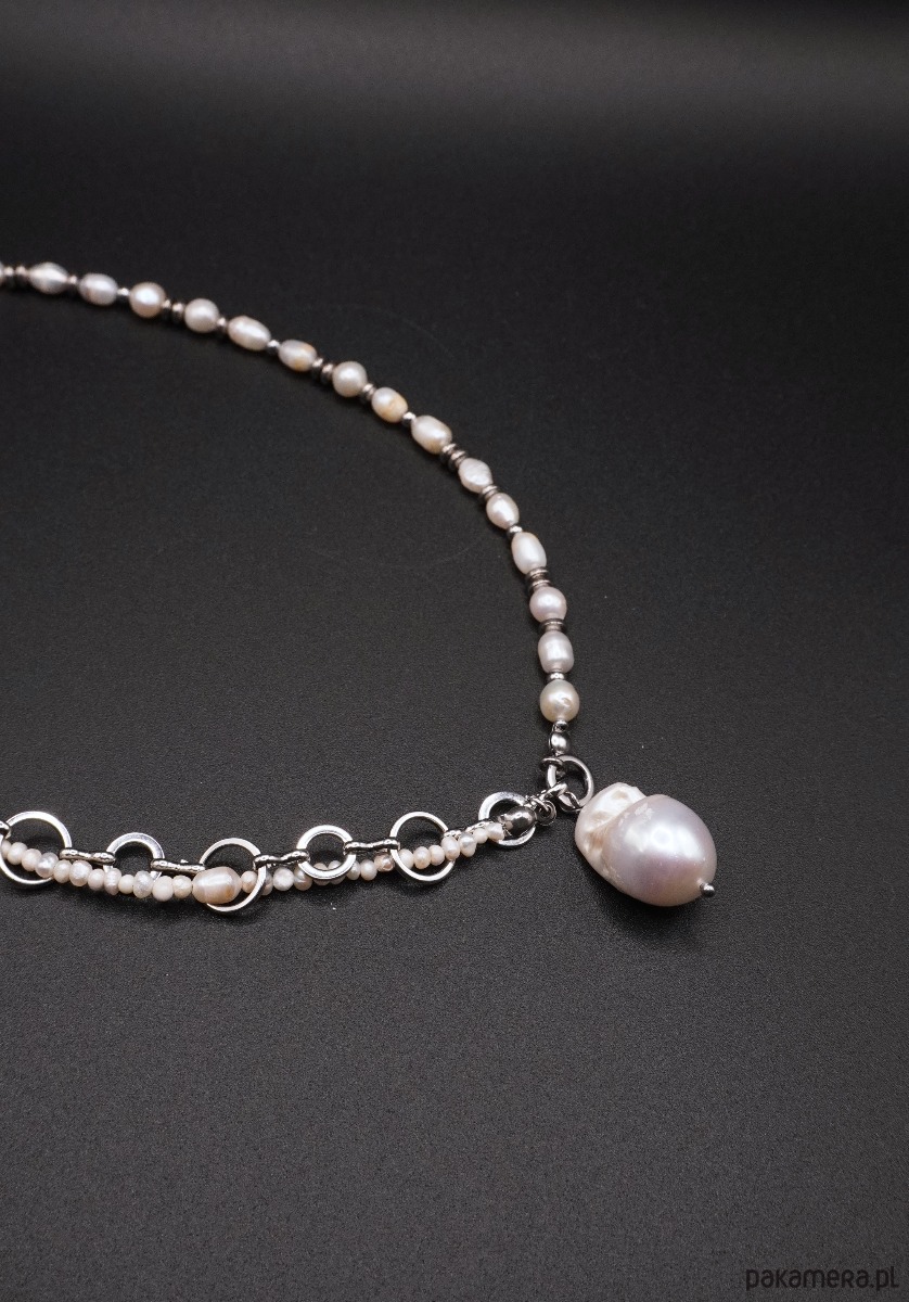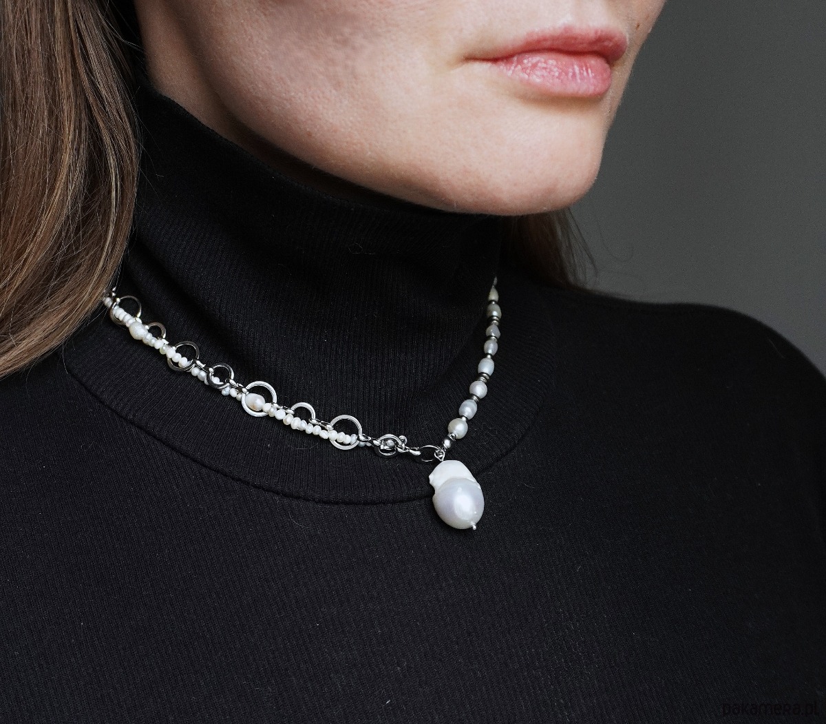 Elegancki naszyjnik, w którym klasyczna subtelność pereł łączy się z nowoczesnymi akcentami. Biżuteria wykonana jest z naturalnych pereł, uzupełnionych wstawkami z hematytu oraz łańcuchem ze stali nierdzewnej w formie połączonych ze sobą kół, nadających całości wyrazistą, graficzną strukturę.