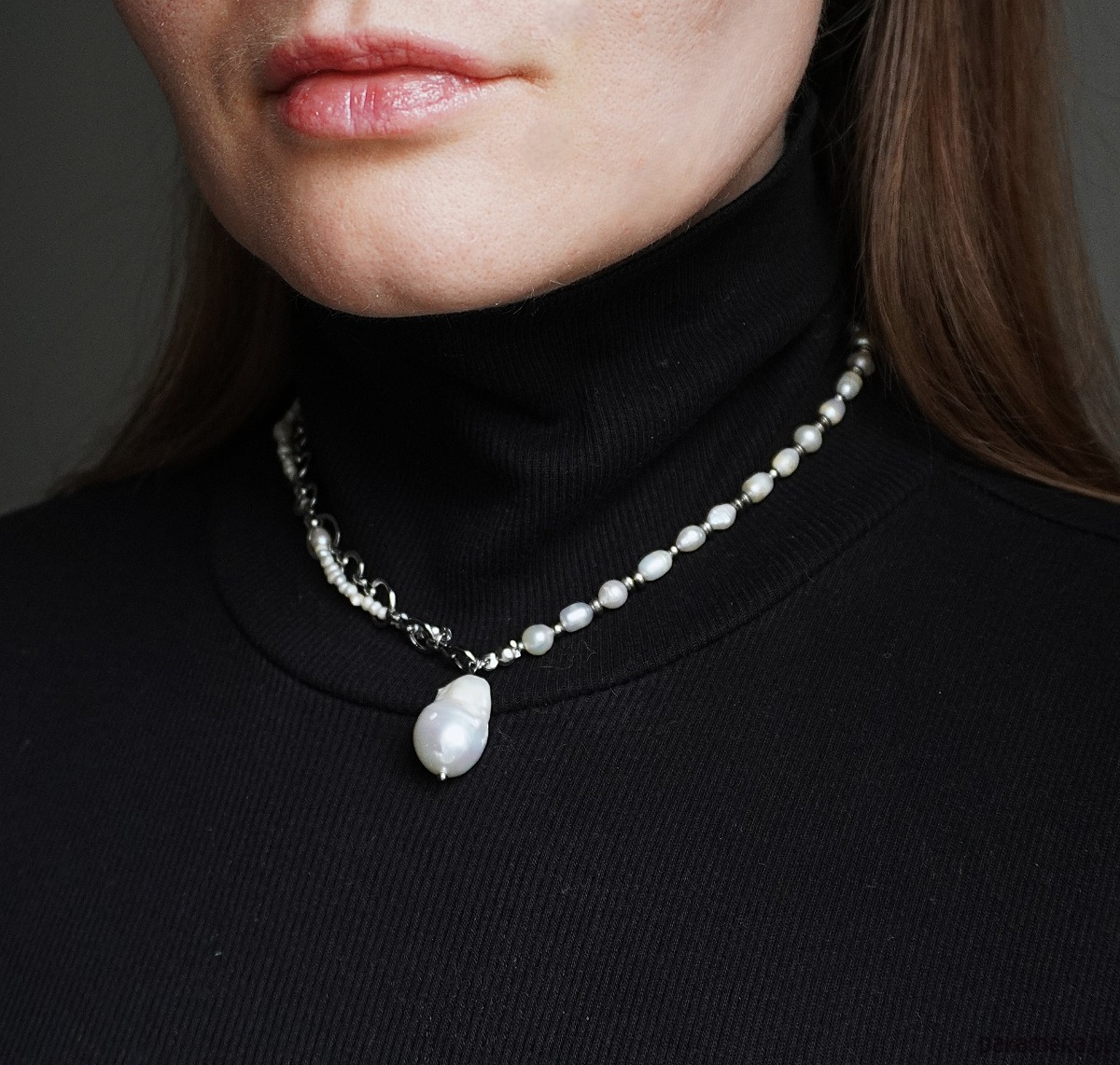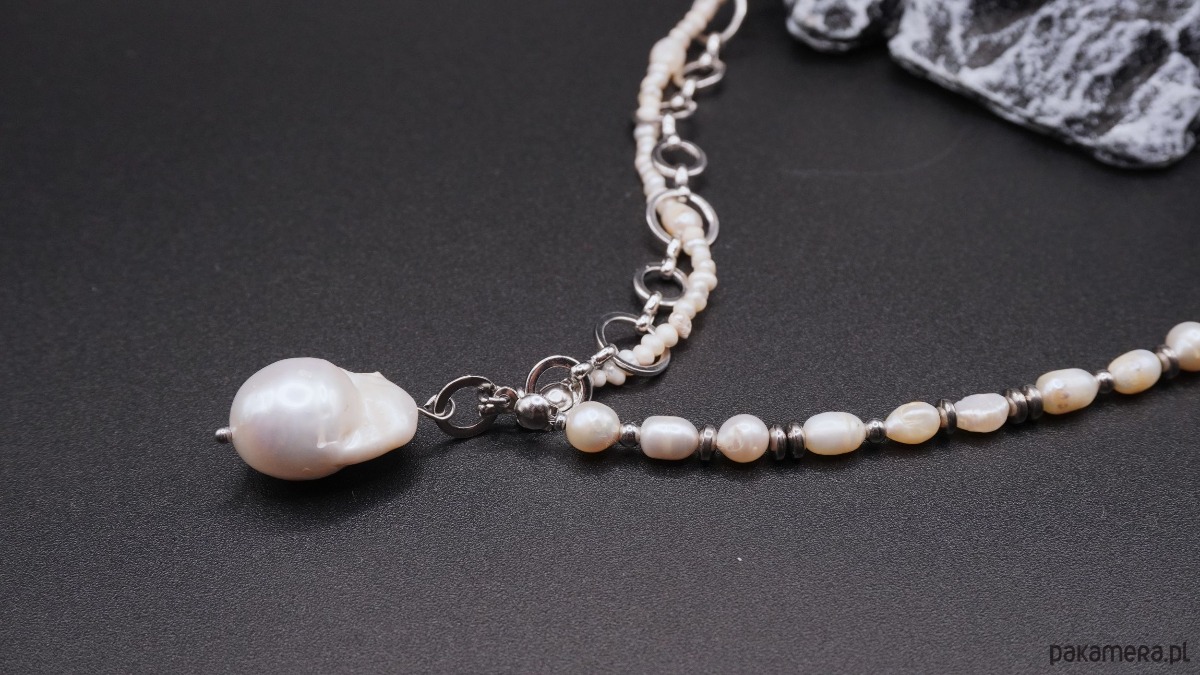 Kontrast ciepłego blasku pereł, chłodnego metalicznego połysku hematytu oraz stali tworzy nowoczesny, harmonijny wygląd. Naszyjnik podkreśla linię szyi i doskonale dopełnia zarówno minimalistyczne stylizacje na co dzień, jak i bardziej wyraziste, wieczorowe lub konceptualne zestawienia.
