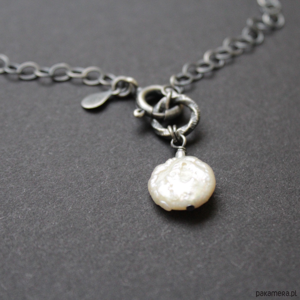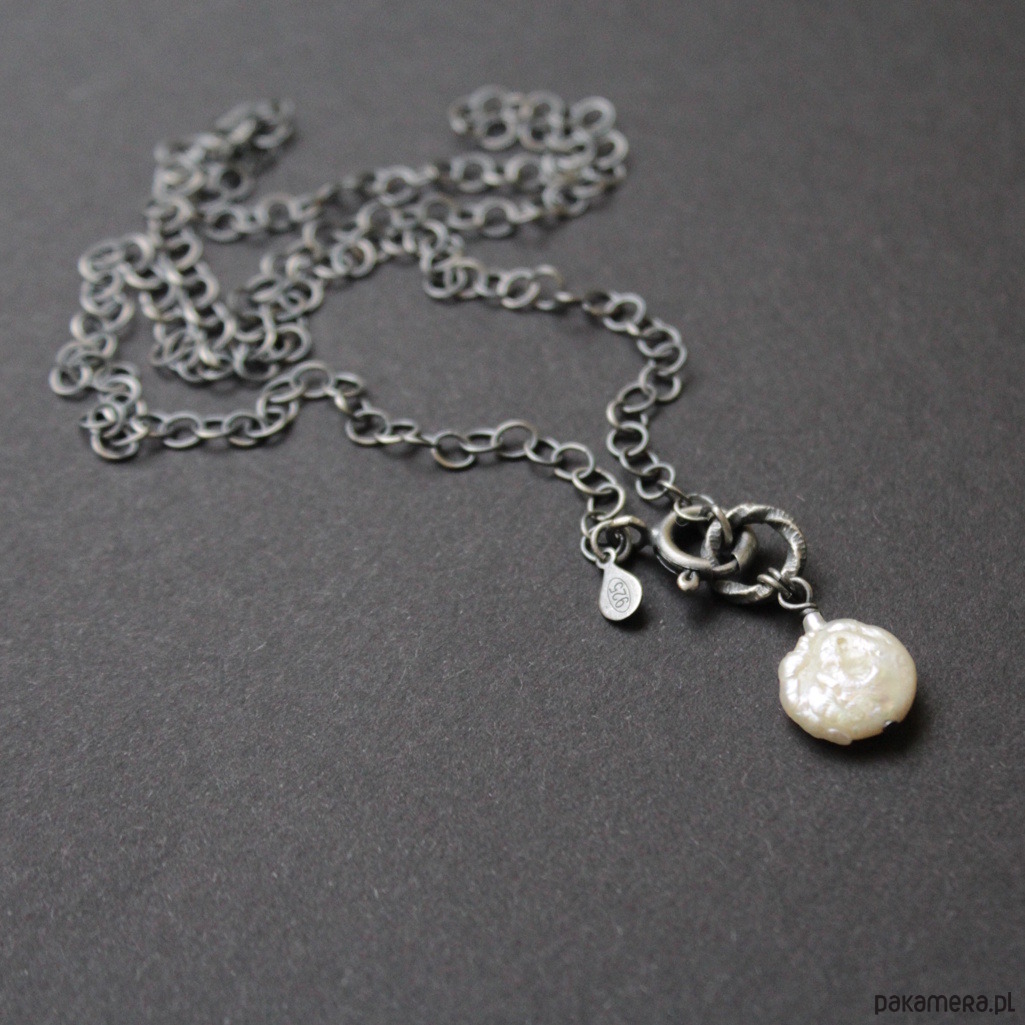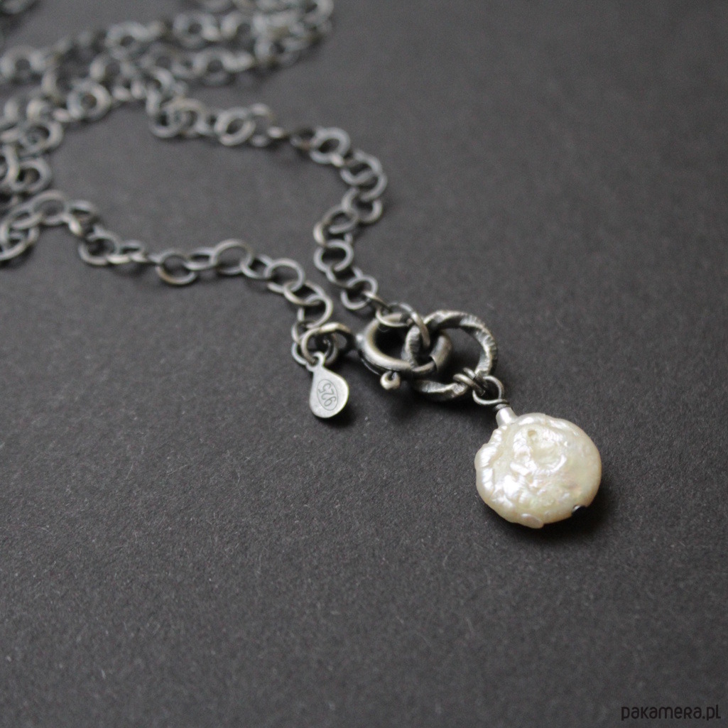 Głowną ozdobą naszyjnika jest przepiękna surowa perła barokowa wielkości 1,4 cm zawieszona na ozdobnym kole.