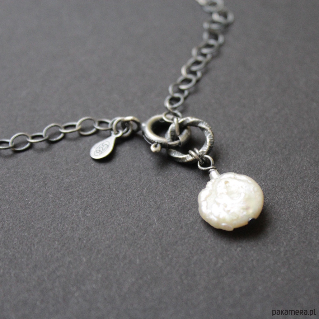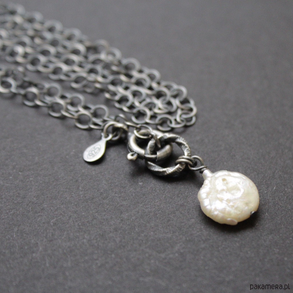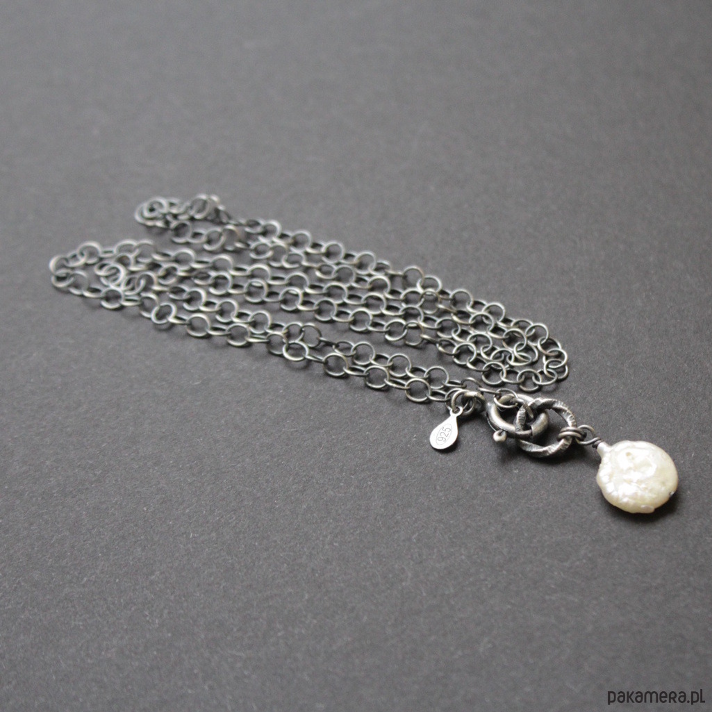 Naszyjnik wykonany został z oksydowanego srebra próby 925.