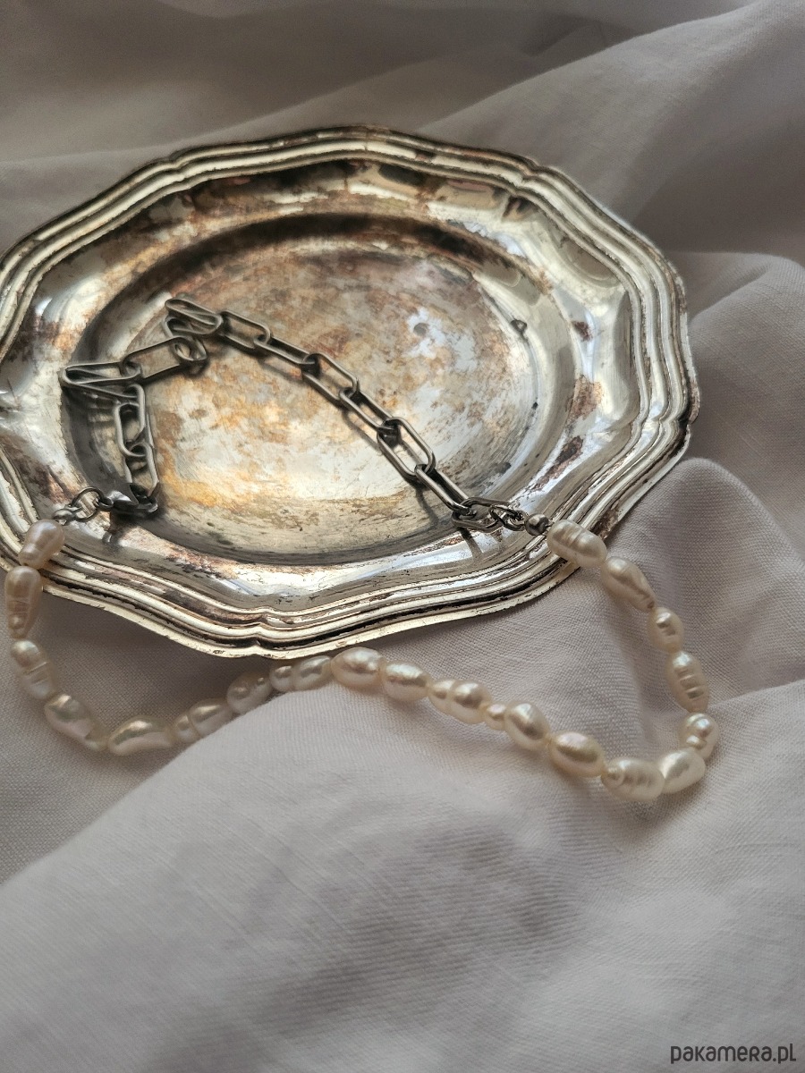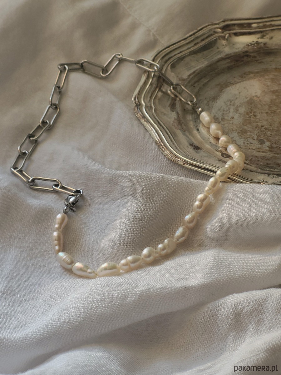 Naszyjnik z pereł naturalnych połączonych z łańcuchem ze stali szlachetnej o dużych ogniwach. Model z możliwością regulacji długości.