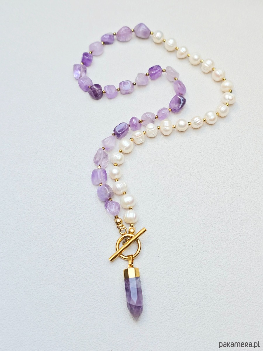 Niepowtarzalny naszyjnik z pereł naturalnych i nieregularnych bryłek ametystu, z zawieszką w kształcie grotu.