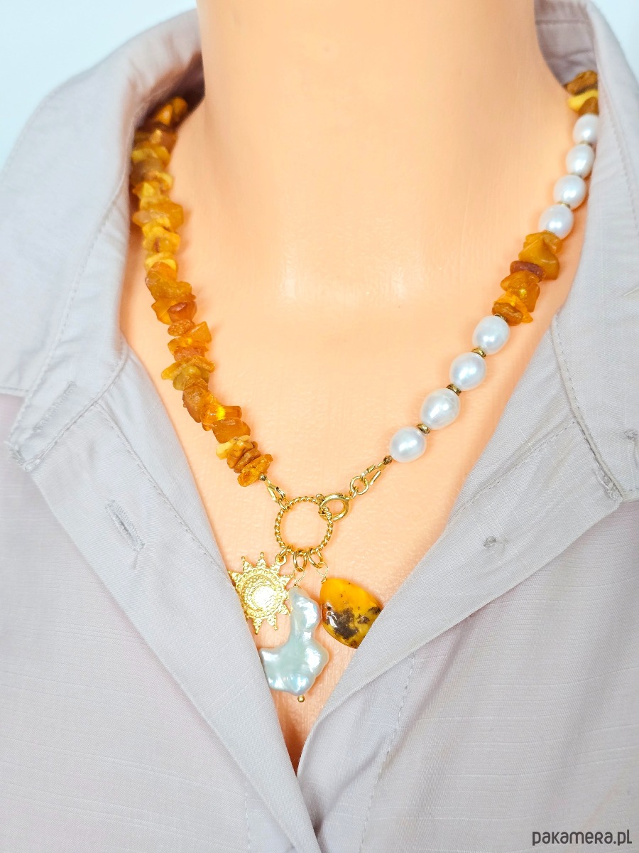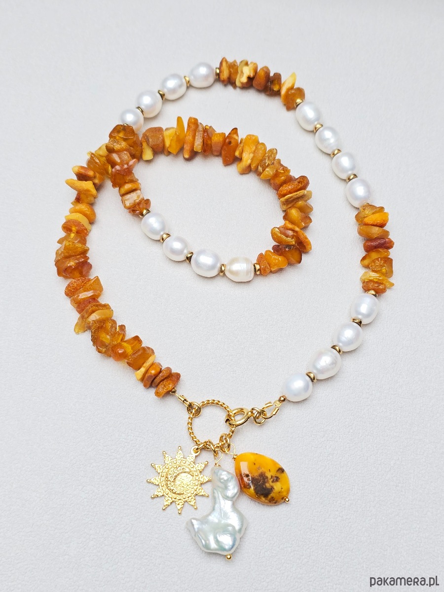 Unikatowy naszyjnik z naturalnych pereł i surowego bursztynu o średnicy ok 8/12mm. Zapinany z przodu. Ozdobą naszyjnika są 3 zawieszki: nieregularna perła, bryłka bursztynu i okrągła z motywem słońca i księżyca.