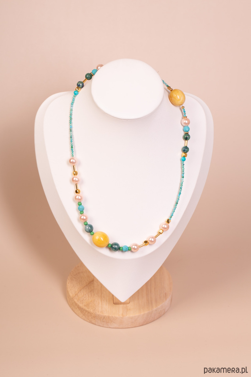 Forma i charakter: Naszyjnik wyróżnia się dynamicznym układem kamieni o różnych kształtach i fakturach. Ciepła żółć bursztynu i pudrowy róż pereł harmonijnie współgrają z morskimi tonami turkusu i chłodną zielenią jaspisu. Złociste akcenty z hematytu oraz pozłacane elementy ze srebra próby 925 wprowadzają do kompozycji biżuteryjny blask, łącząc różnorodne elementy w spójną całość. To idealny dodatek dla osób ceniących unikatowe, wielobarwne projekty.