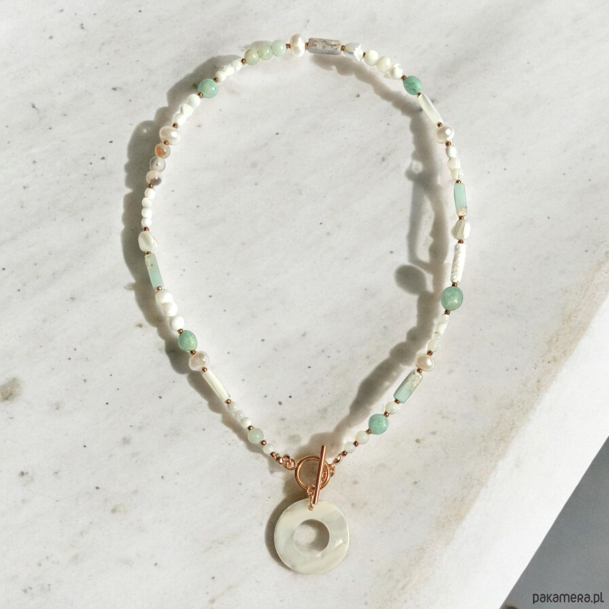 Naszyjnik : perły , muszla, amazonit, jaspis cesarski :: light