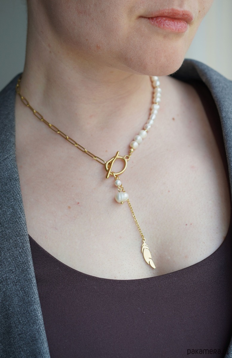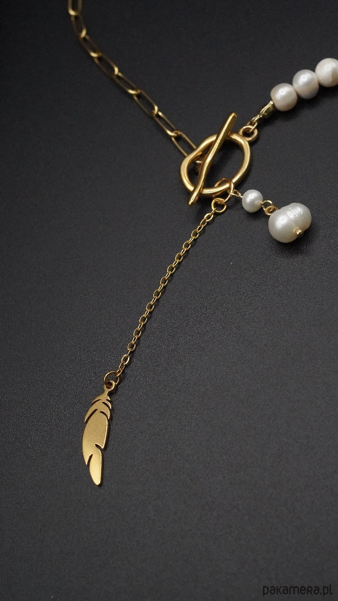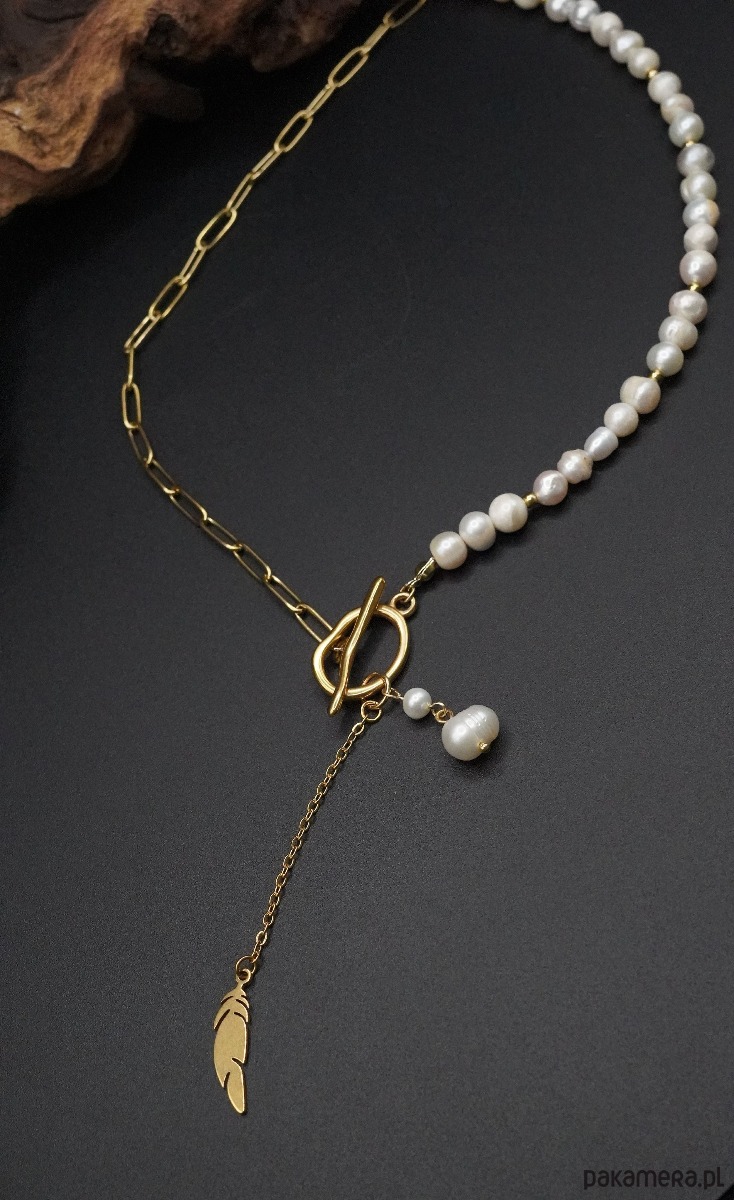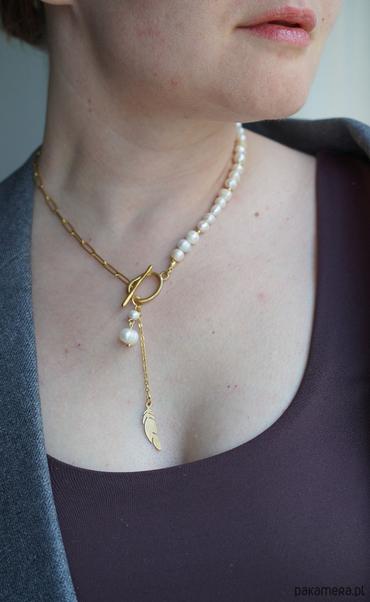 Centralnym punktem naszyjnika jest ozdobne zapięcie typu toggle, z którego opada delikatna krawatka zwieńczona zawieszką w kształcie piórka oraz dodatkową perłą. To biżuteria, która łączy w sobie lekkość, swobodę stylu boho oraz ponadczasową elegancję.