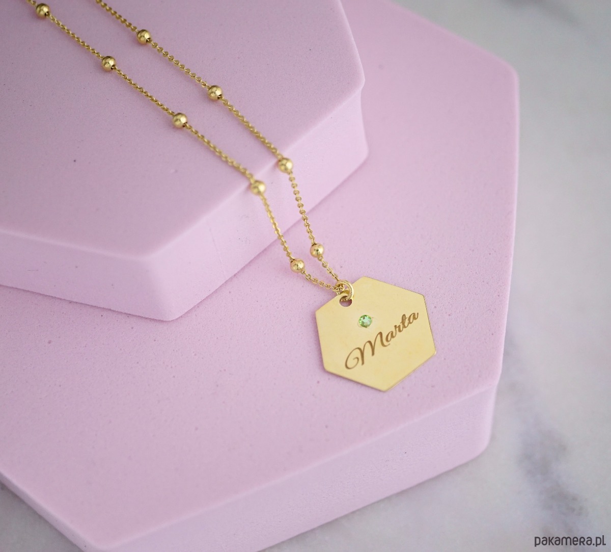 Nowoczesny naszyjnik z cyrkonią Swarovski w odcieniu Peridot 214 i geometryczną zawieszką z personalizacją - wybranym imieniem.