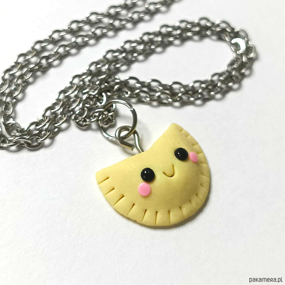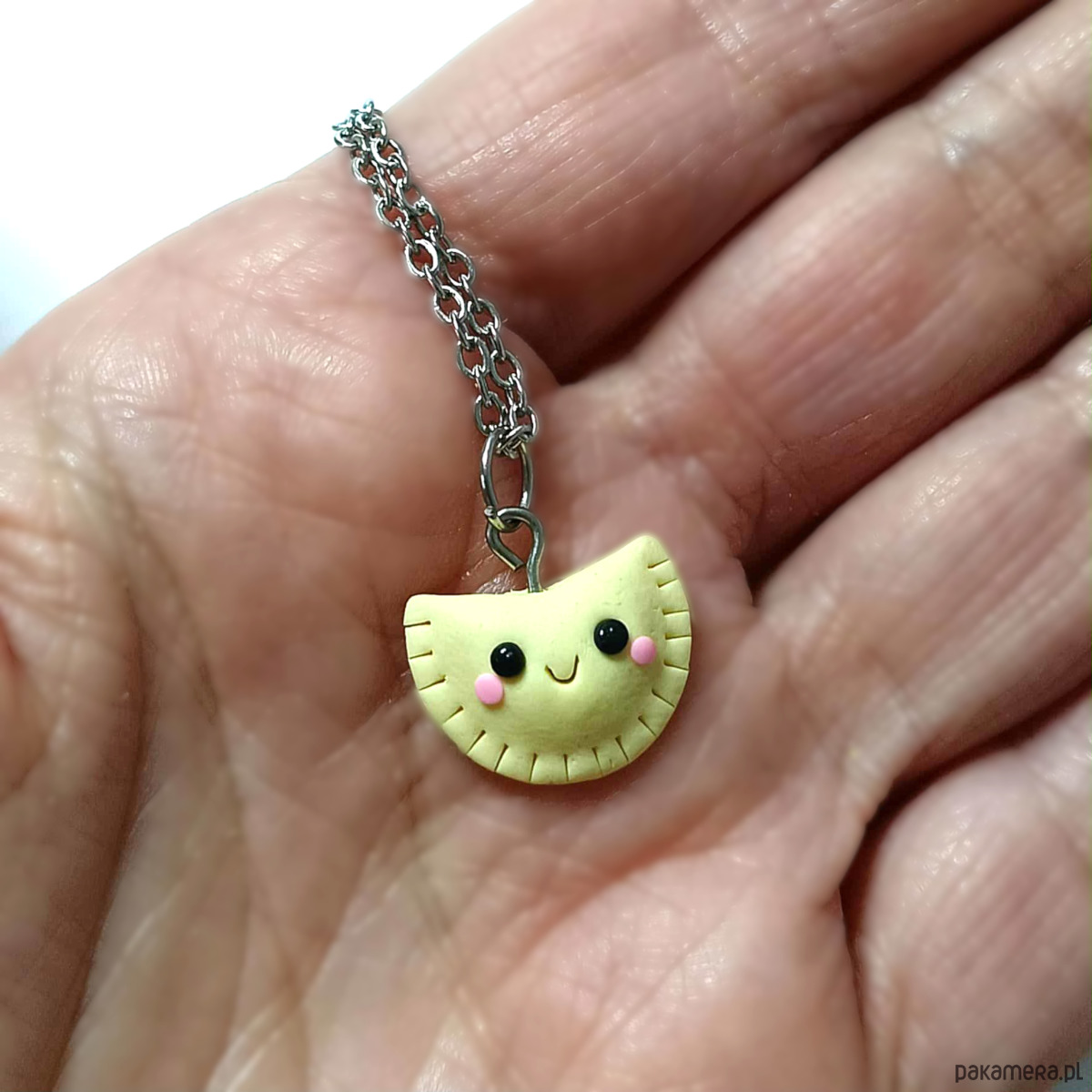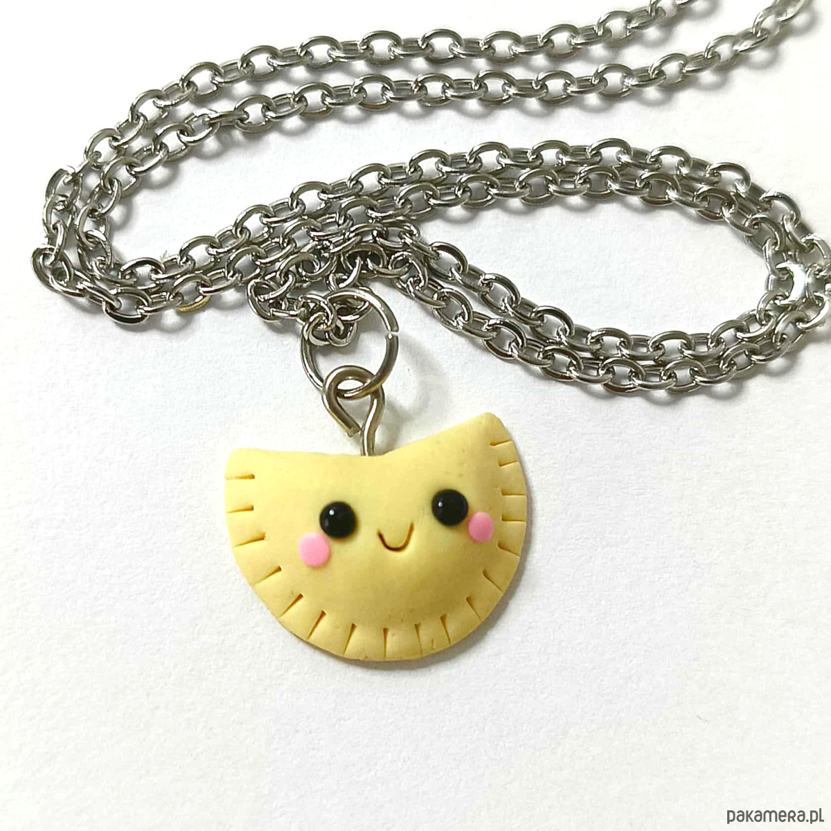 Wykonany ręcznie z masy polimerowej, przedstawia małego pierożka z uśmiechem i różowymi policzkami. Lekki, zabawny i niepowtarzalny – doda Twojej stylizacji odrobinę radości i oryginalności.