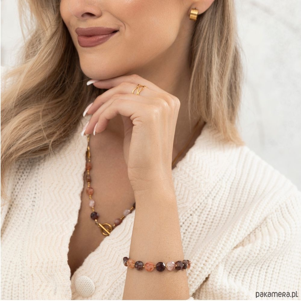 Naszyjnik z Kwarcu Truskawkowego i Hematytu to połączenie subtelności i energii natury w eleganckiej formie. Ciepłe odcienie różu i brzoskwini przełamane złotym połyskiem tworzą kompozycję, która przyciąga uwagę i rozświetla każdą stylizację. Kwarc Truskawkowy to kamień miłości, radości i pozytywnej energii. Wzmacnia spokój wewnętrzny, pomaga przyciągać dobre emocje i przypomina o sile płynącej z serca. Hematyt natomiast symbolizuje równowagę i pewność siebie – stabilizuje energię i podkreśla elegancki charakter biżuterii swoim metalicznym blaskiem.