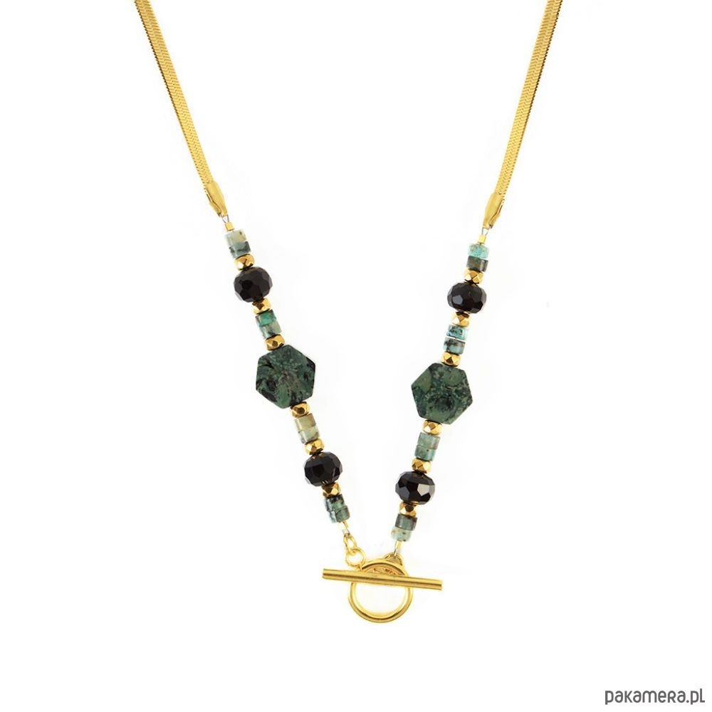 Naszyjnik został wykonany ręcznie z naturalnych kamieni i wykończony z tyłu łańcuszkiem typu żmijka. Ozdobne zapięcie toggle nadaje mu wyjątkowego, nowoczesnego wyrazu.