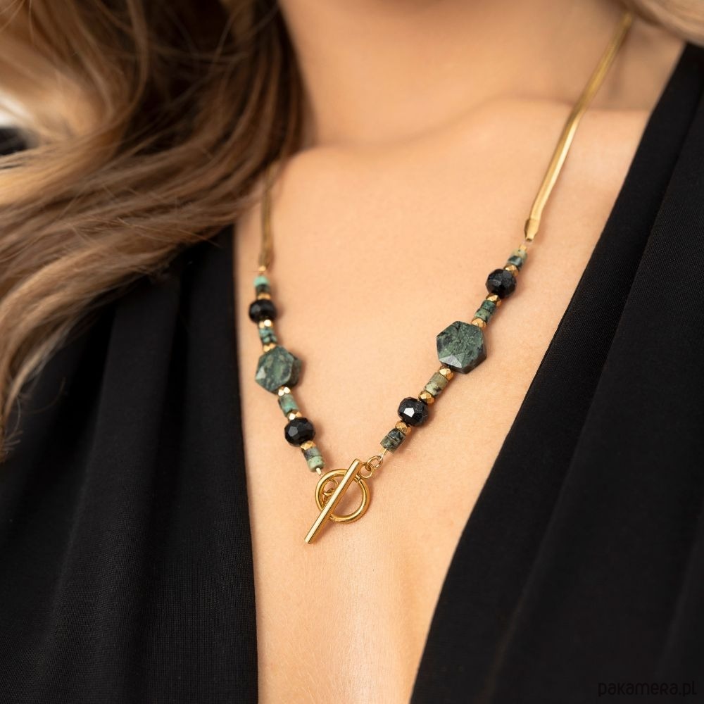 Naszyjnik z Turmalinu czarnego, Jaspisu Kambaba, Turkusu afrykańskiego i Hematytu to połączenie siły, harmonii i elegancji inspirowanej naturą. Zestawienie głębokiej czerni, odcieni zieleni i złotych akcentów tworzy biżuterię, która przyciąga uwagę i emanuje spokojem.